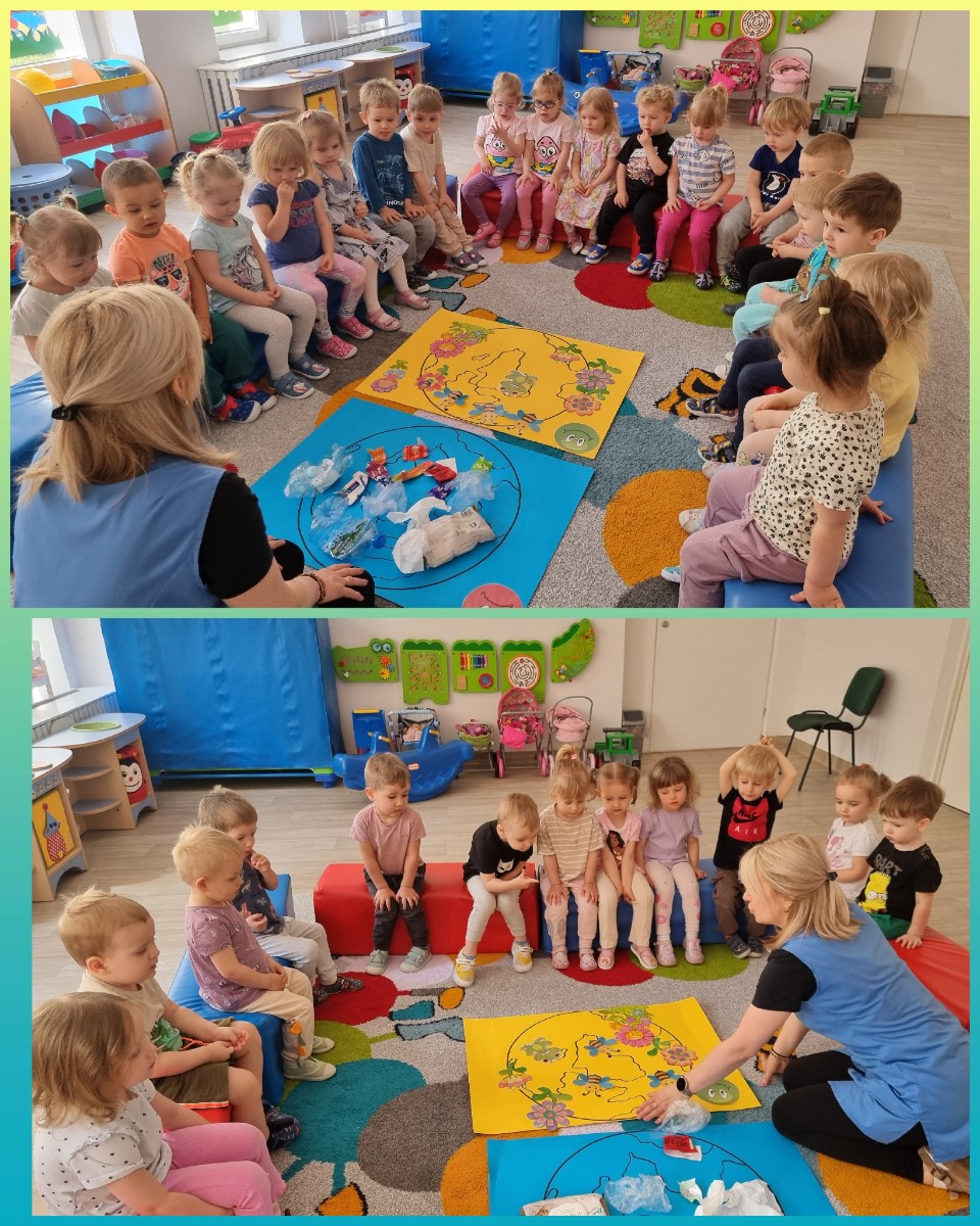 Dziś świętowaliśmy Dzień Ziemi z tej okazji dzieci wzięły udział w zajęciach, w których dowiedziały się na czym polega segregacja odpadów, jak dbać o przyrodę, powietrze, wodę, tak aby nasza Ziemia była coraz piękniejsza i czystsza.