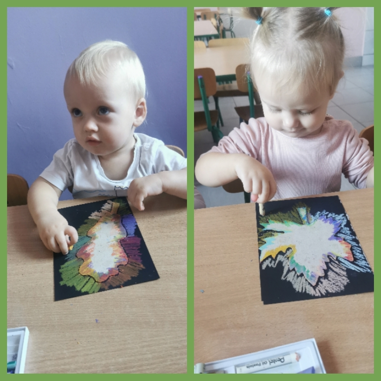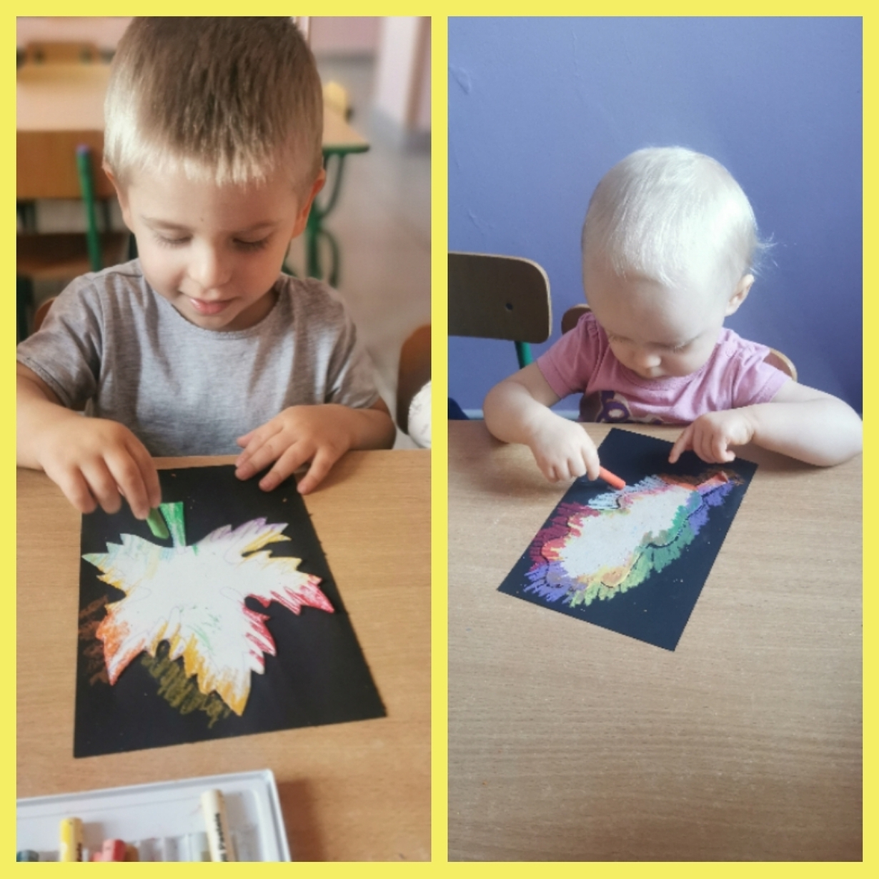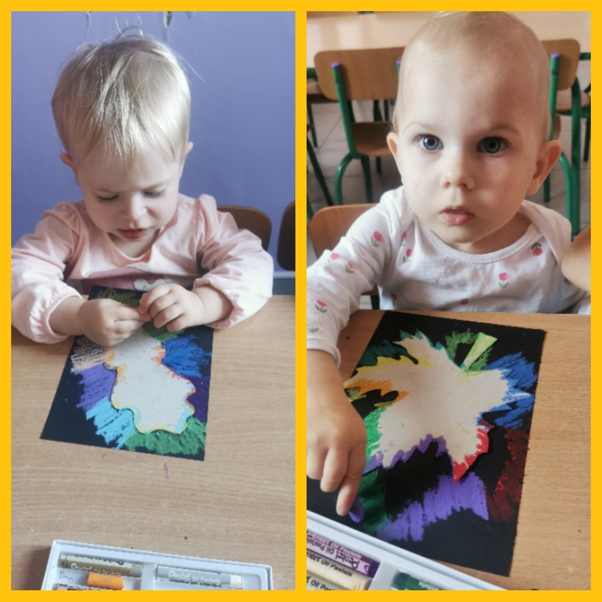 Jesień zawitała w nasze skromne progi, a my witając ją mile wykonaliśmy piękne prace plastyczne z motywem jesiennym. Na czarnych kartkach z wykorzystaniem kolorowych pasteli odbijaliśmy szablony jesiennych liści, które mienią się pięknymi barwami jakimi obdarowuje nas Jesień. Klimat tej magicznej pory roku zawitał na dobre w naszym żłobku i może wpłynąć na każdego, kto spojrzy na nasze dzieła. Zapraszamy do galerii zdjęć.