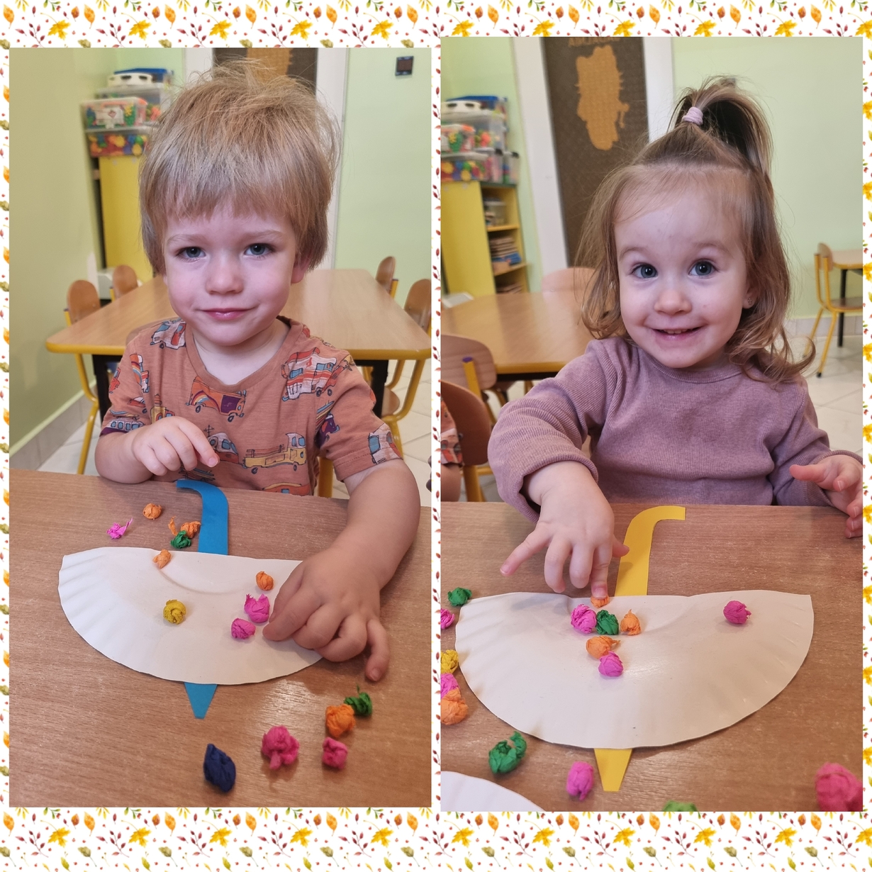 Następnie każde dziecko z wielkim zainteresowaniem i skupieniem przyklejało bibułkę na parasol. Na sali zrobiło się wesoło.