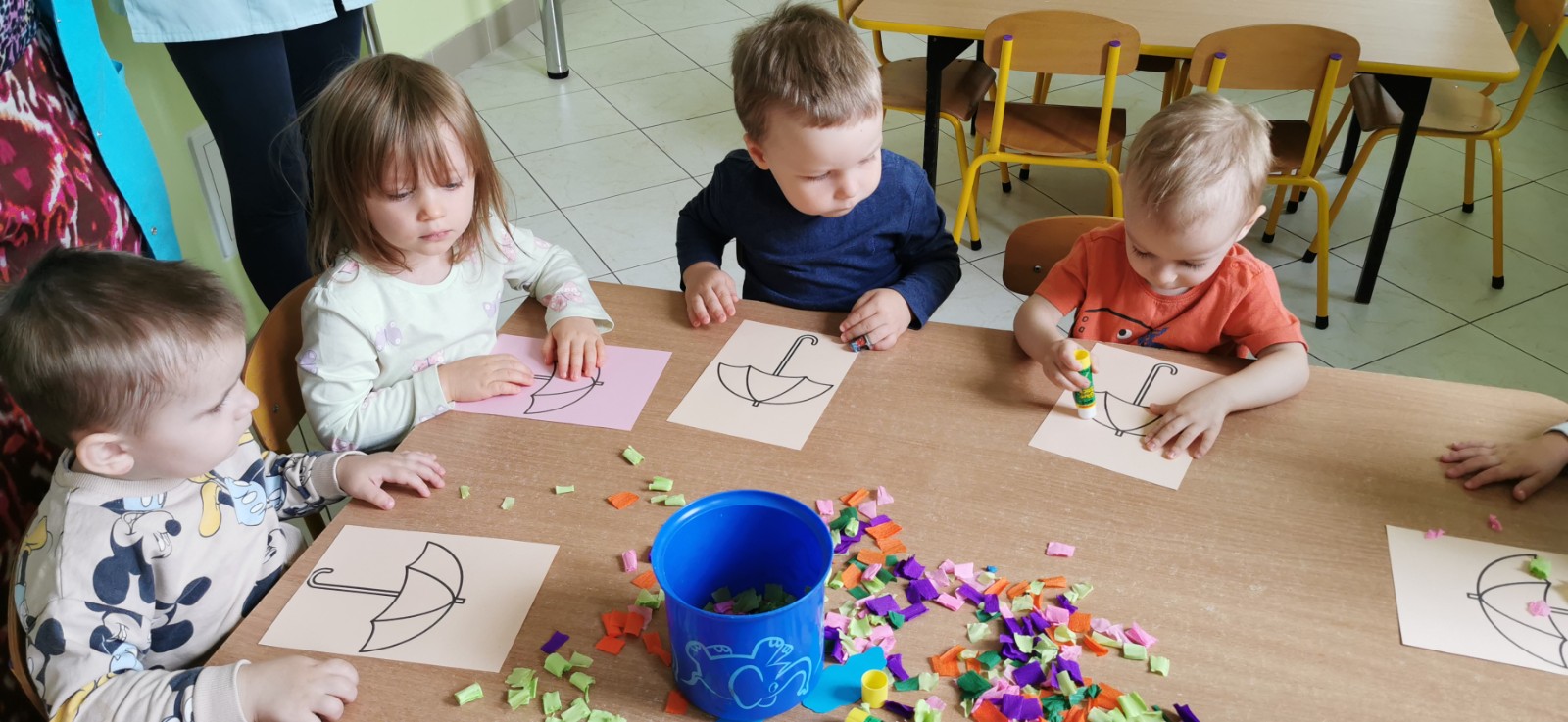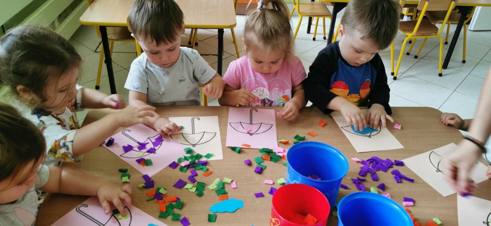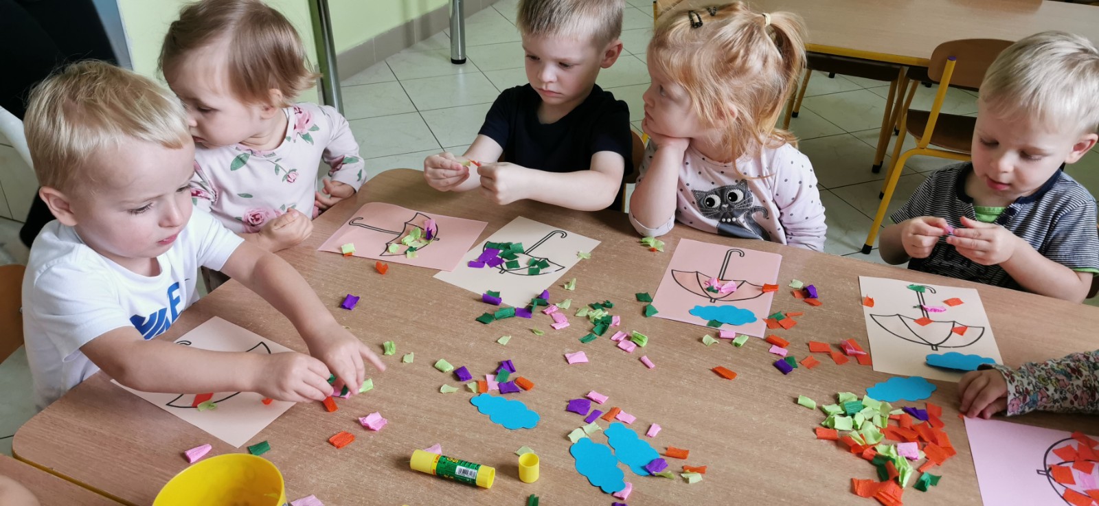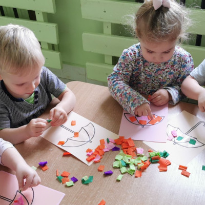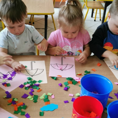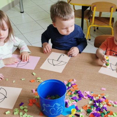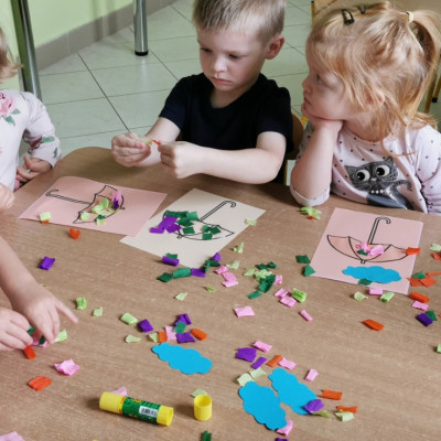 Rozmowa z dziećmi o parasolach jakie jest ich przeznaczenie i do czego służą. Wykonanie pracy plastycznej - ozdabianie parasola.