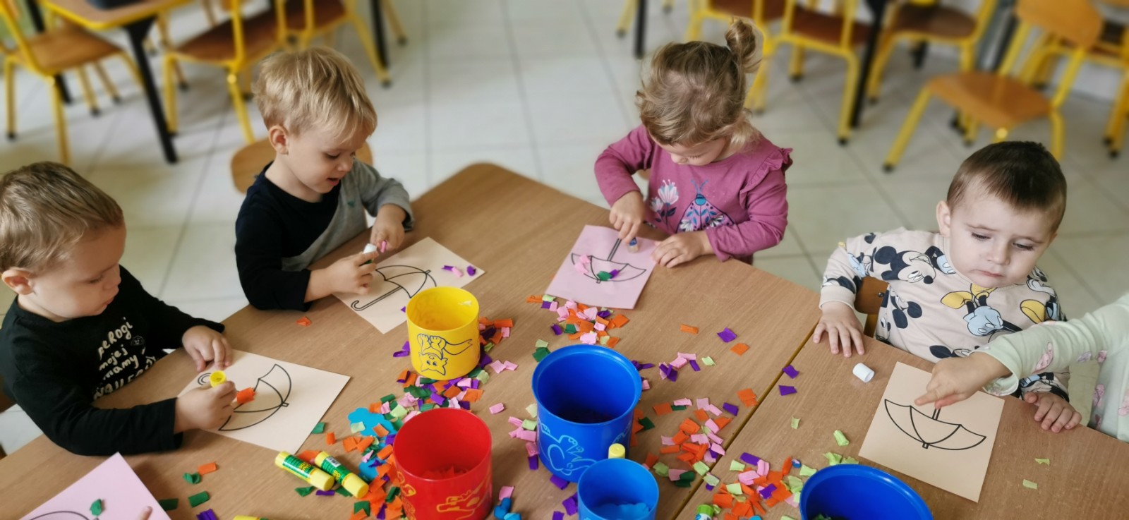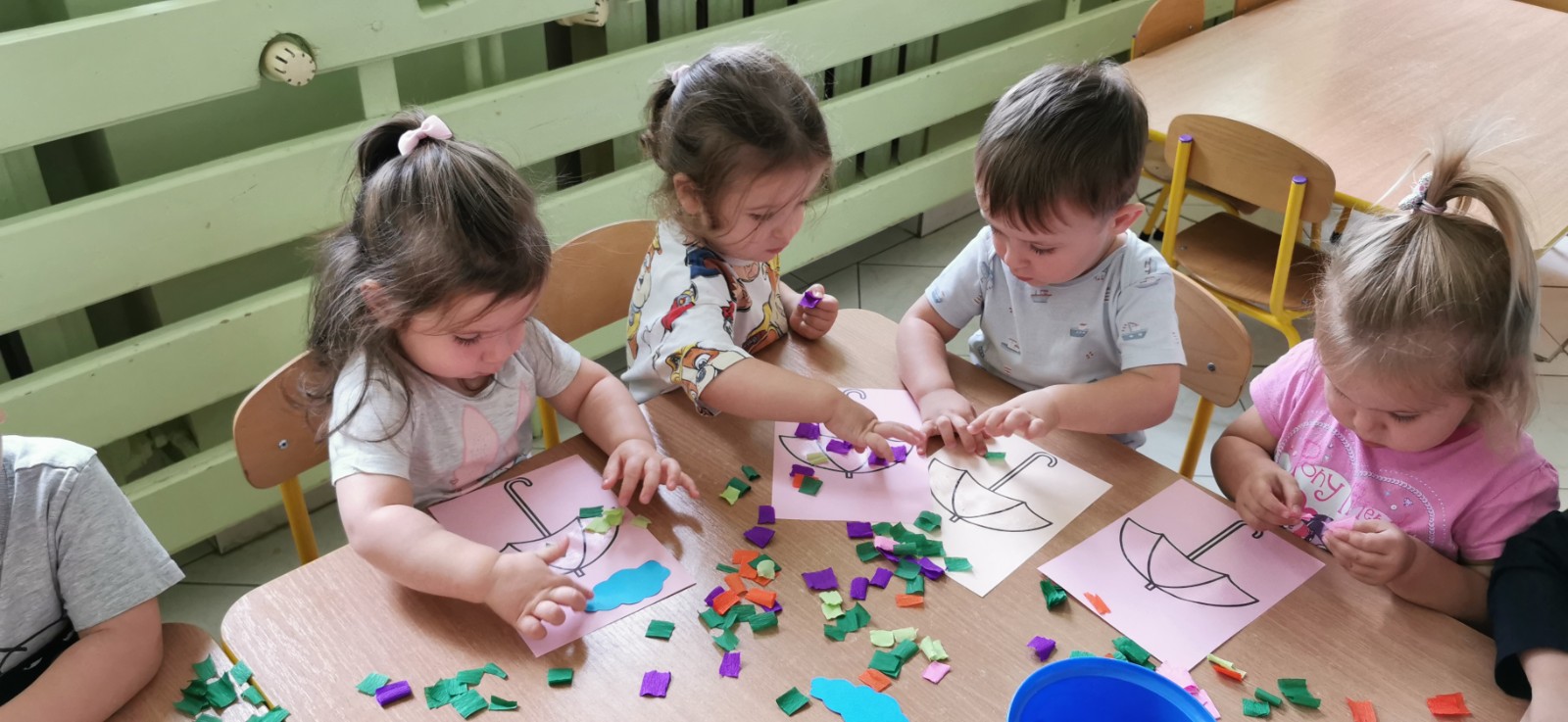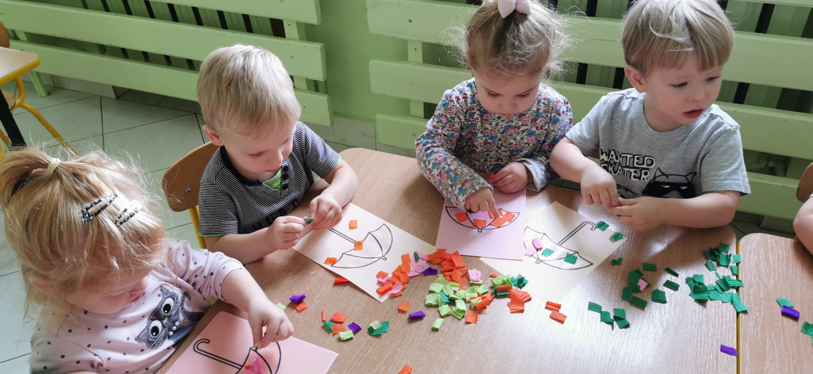 Rozmowa z dziećmi o parasolach jakie jest ich przeznaczenie i do czego służą. Wykonanie pracy plastycznej - ozdabianie parasola.