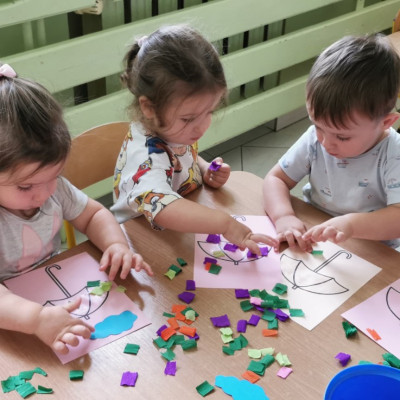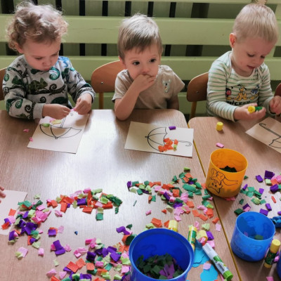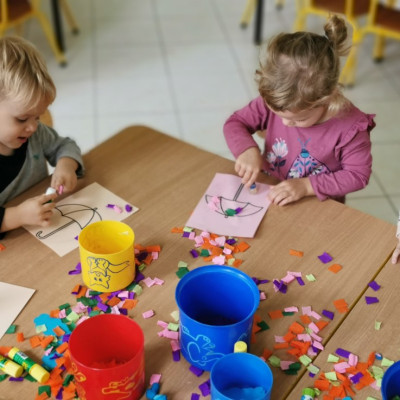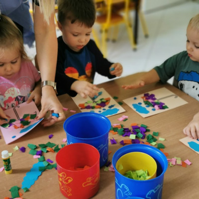 Zdjęcia przedstawiają dzieci wykonujące prace plastyczne.
