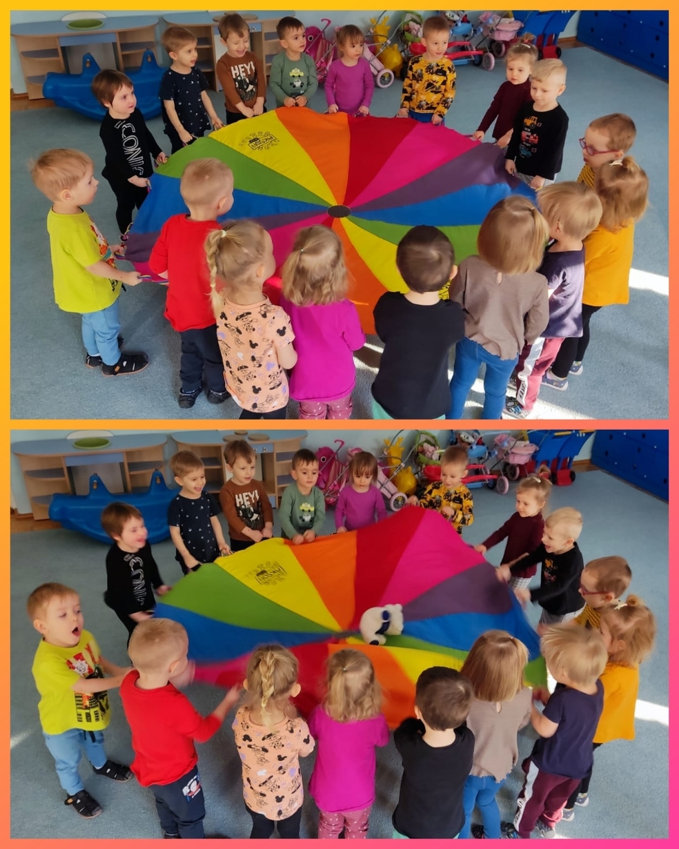 Zabawa z kółeczkami gimnastycznymi, chustą animacyjną oraz pokonywanie toru przeszkód pomagały ćwiczyć sprawność motoryczną.