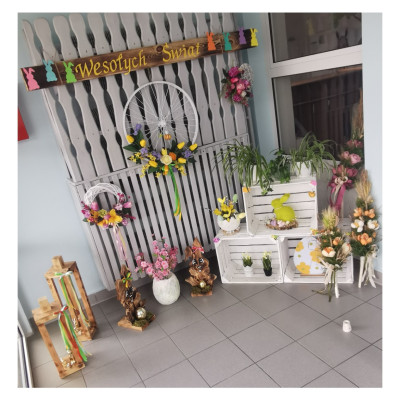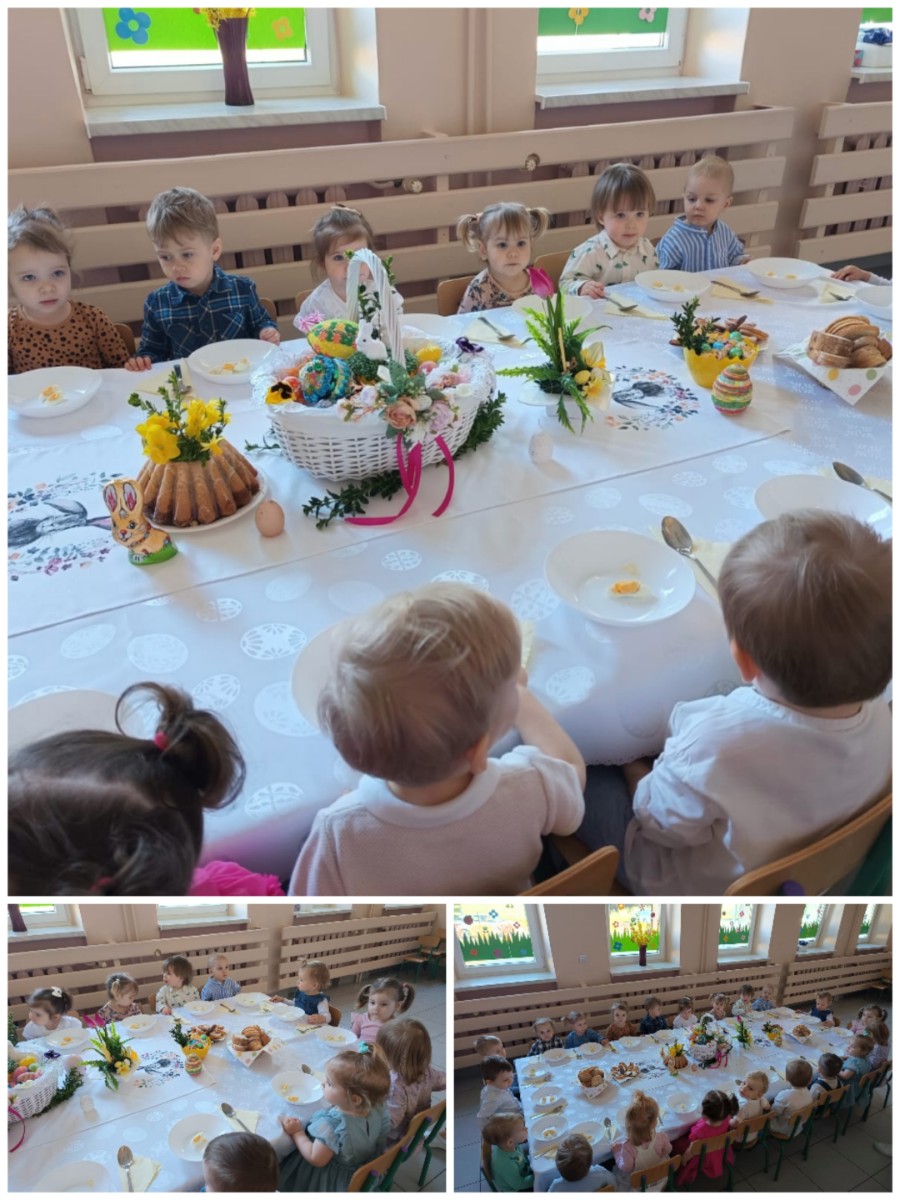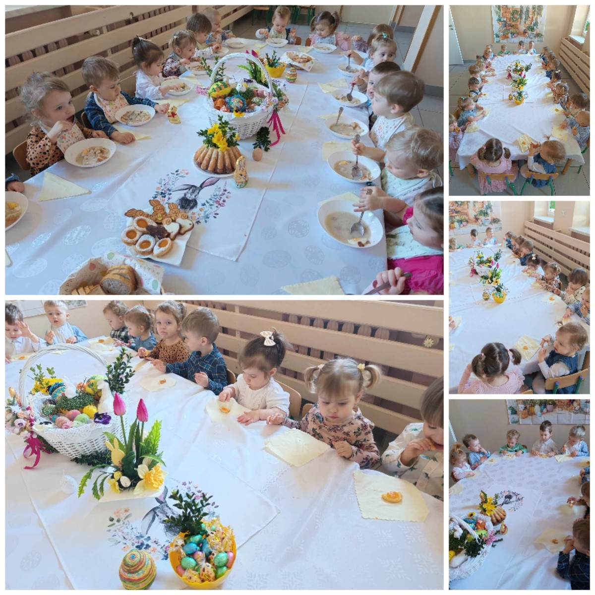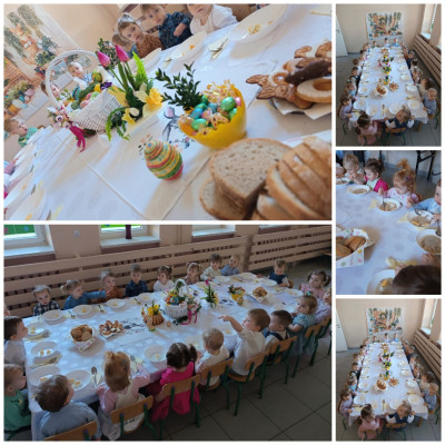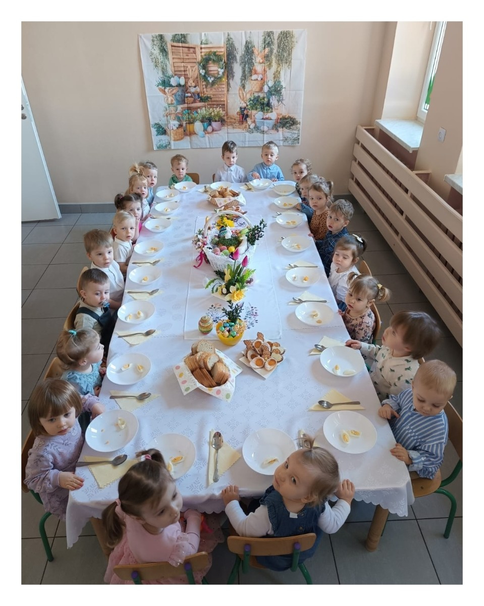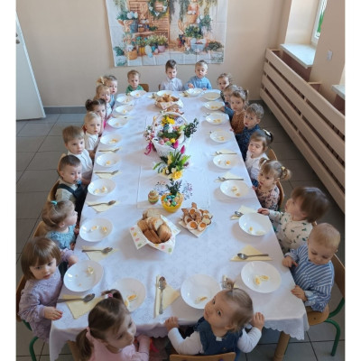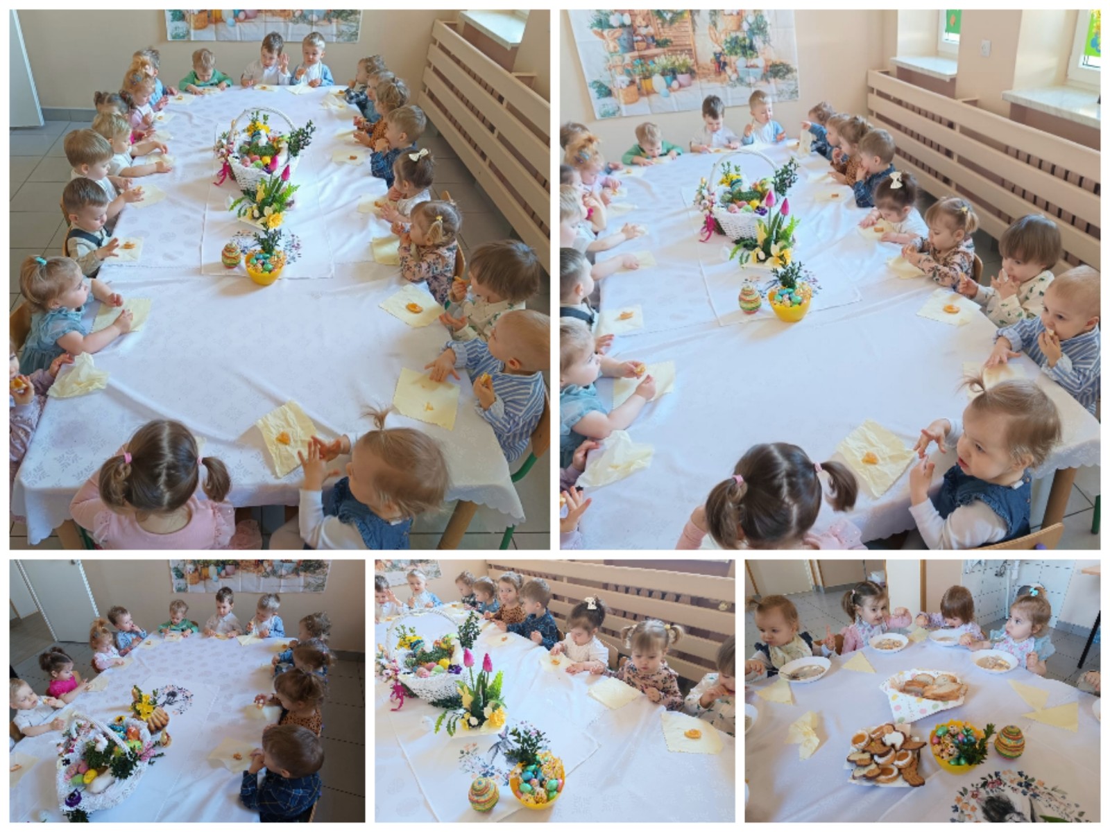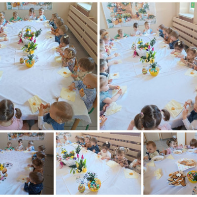 Tuż przed Świętami Wielkiej Nocy nasza "Żłobkowa rodzinka" zasiadła do uroczystego śniadania wielkanocnego. Oprócz tradycyjnego barszczu z jajkiem i kiełbasą na stole znalazły się także słodkie ciasteczka - jajeczka, pierniki-króliki oraz pyszna świąteczna Babka. W związku ze zbliżającymi się Świętami pragniemy złożyć naszym milusińskim oraz rodzicom wszelkiej pomyślności, błogosławieństwa Bożego oraz mokrego Dyngusa.