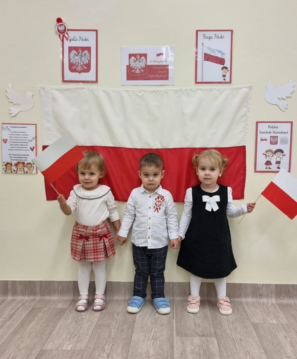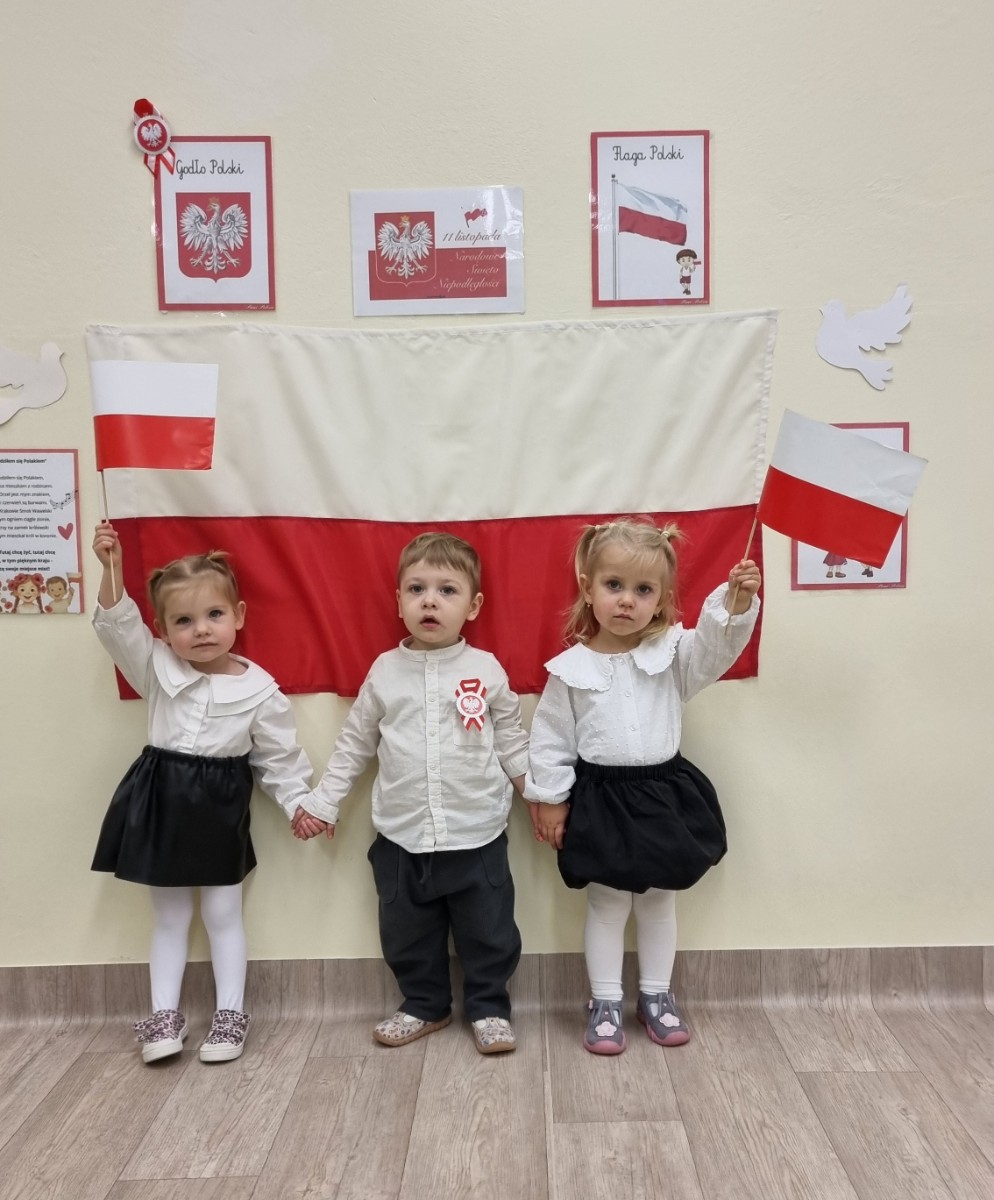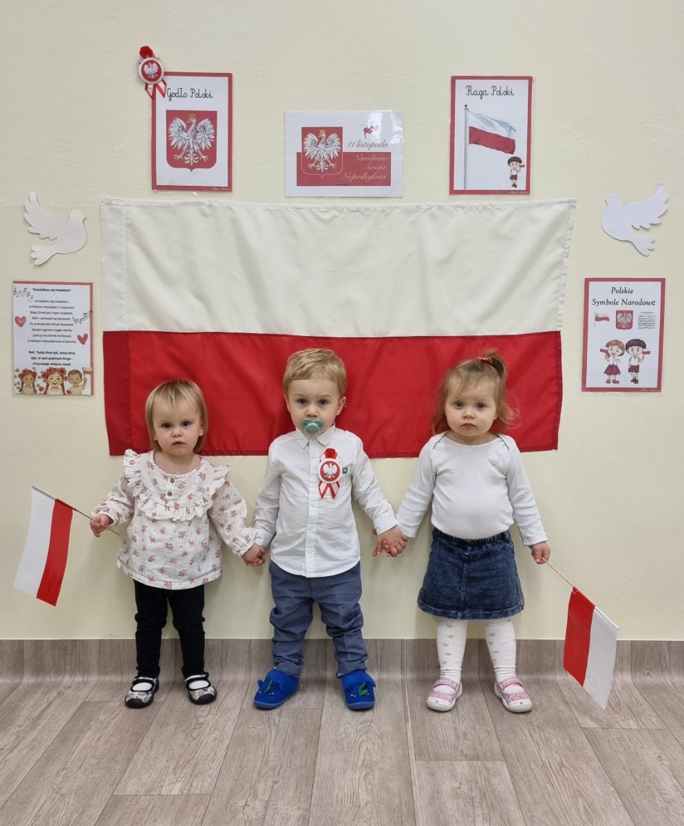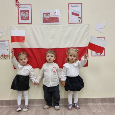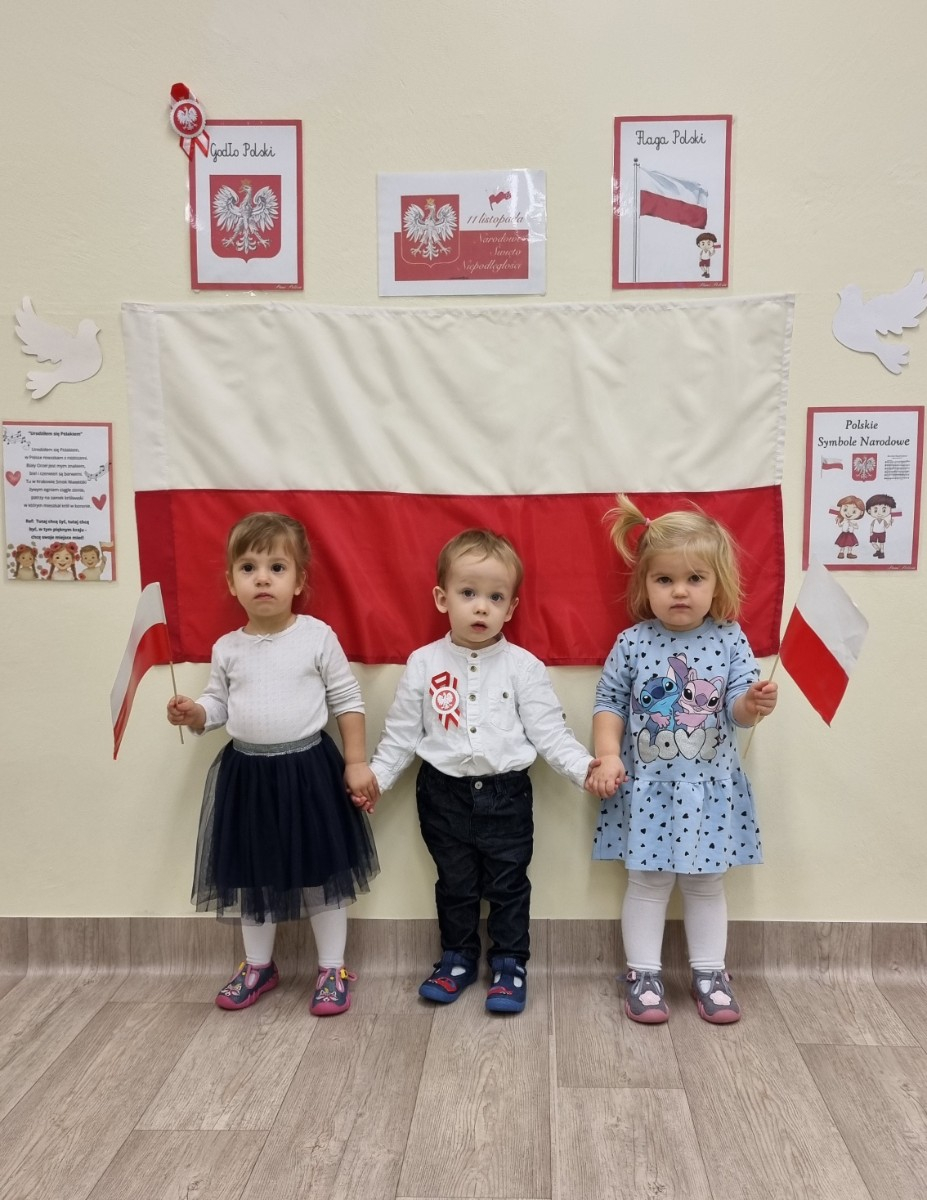 Już od najmłodszych lat należy wpajać dzieciom szacunek do polskich symboli i przywiązania do swojej Ojczyzny. W dniu dzisiejszym, na grupie "Biedronek" odbyła się uroczystość z okazji Narodowego Święta Niepodległości. Miała ona na celu kształtowanie postawy szacunku wobec symboli narodowych: godła, flagi i hymnu oraz pielęgnowanie polskiej kultury i tradycji.