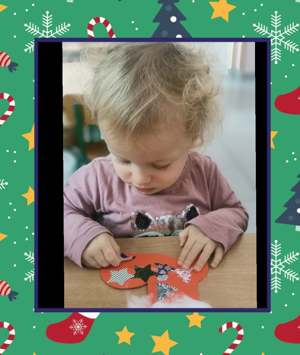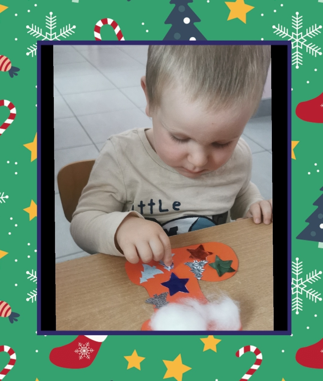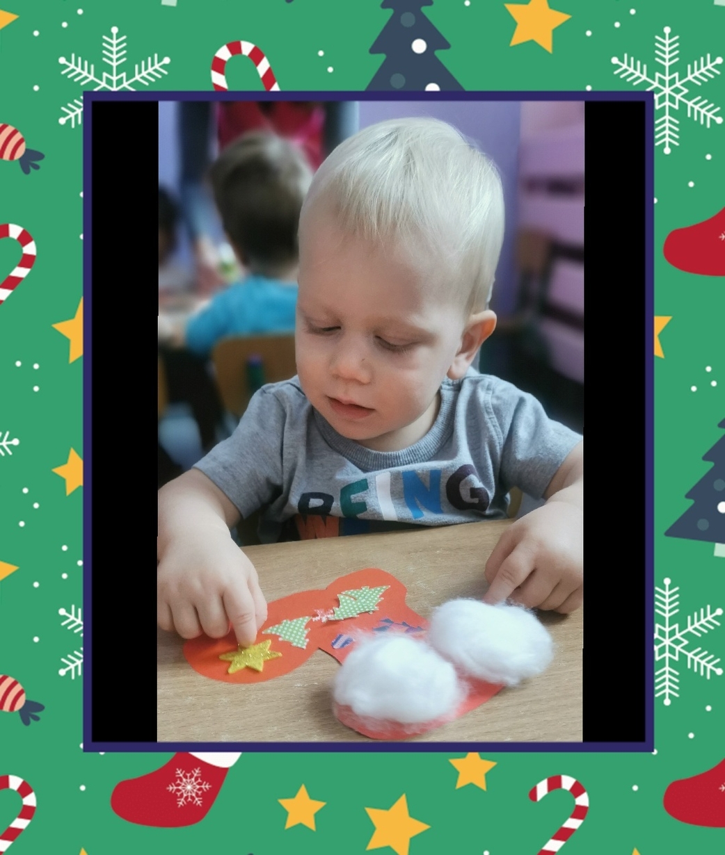 W grupie Biedronek dzisiaj się działo co niemiara. W oczekiwaniu na to szczególne spotkanie wykonaliśmy prace plastyczne, które nawiązywały tematem do osoby Św. Mikołaja mianowicie stanowiły cześć jego ubioru. Dzieci ozdabiały buta Św. Mikołaja watą oraz różnymi kolorowymi, blyszczacymi, świątecznymi ozdobami. Mamy nadzieję, że przypadną do gustu prawdziwemu Mikołajowi, a póki co wszyscy mogą je podziwiać na tablicy w naszym żłobku.