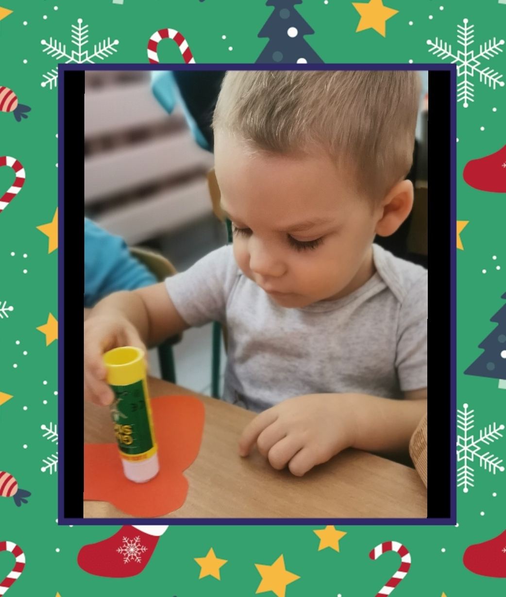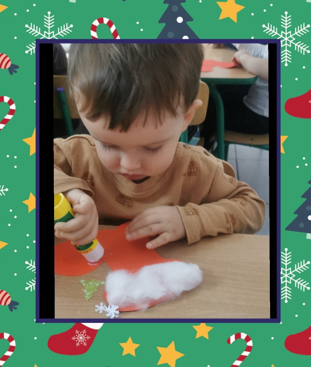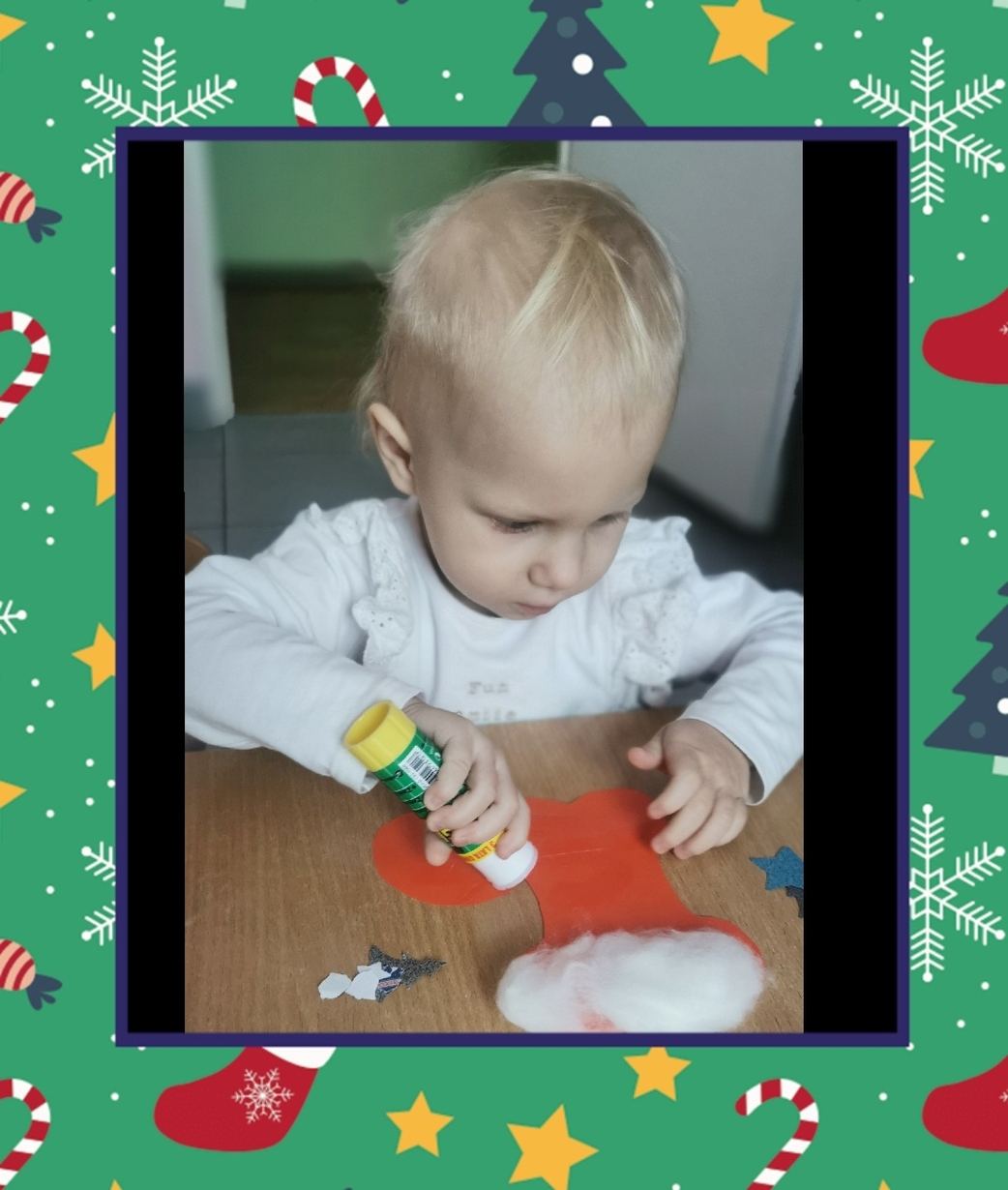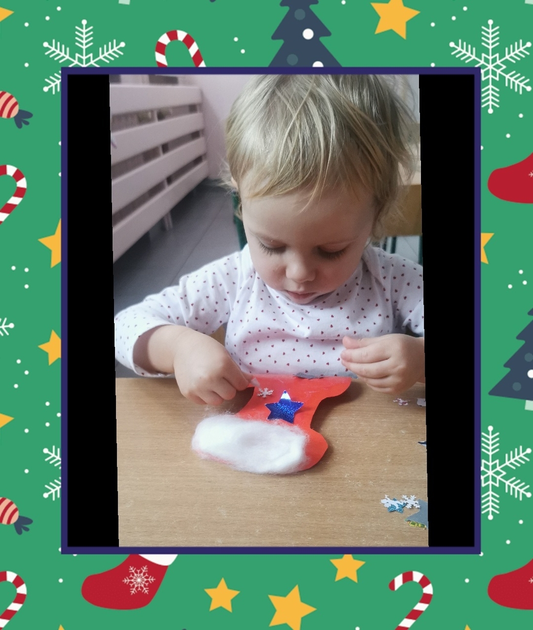 W grupie Biedronek dzisiaj się działo co niemiara. W oczekiwaniu na to szczególne spotkanie wykonaliśmy prace plastyczne, które nawiązywały tematem do osoby Św. Mikołaja mianowicie stanowiły cześć jego ubioru. Dzieci ozdabiały buta Św. Mikołaja watą oraz różnymi kolorowymi, blyszczacymi, świątecznymi ozdobami. Mamy nadzieję, że przypadną do gustu prawdziwemu Mikołajowi, a póki co wszyscy mogą je podziwiać na tablicy w naszym żłobku.