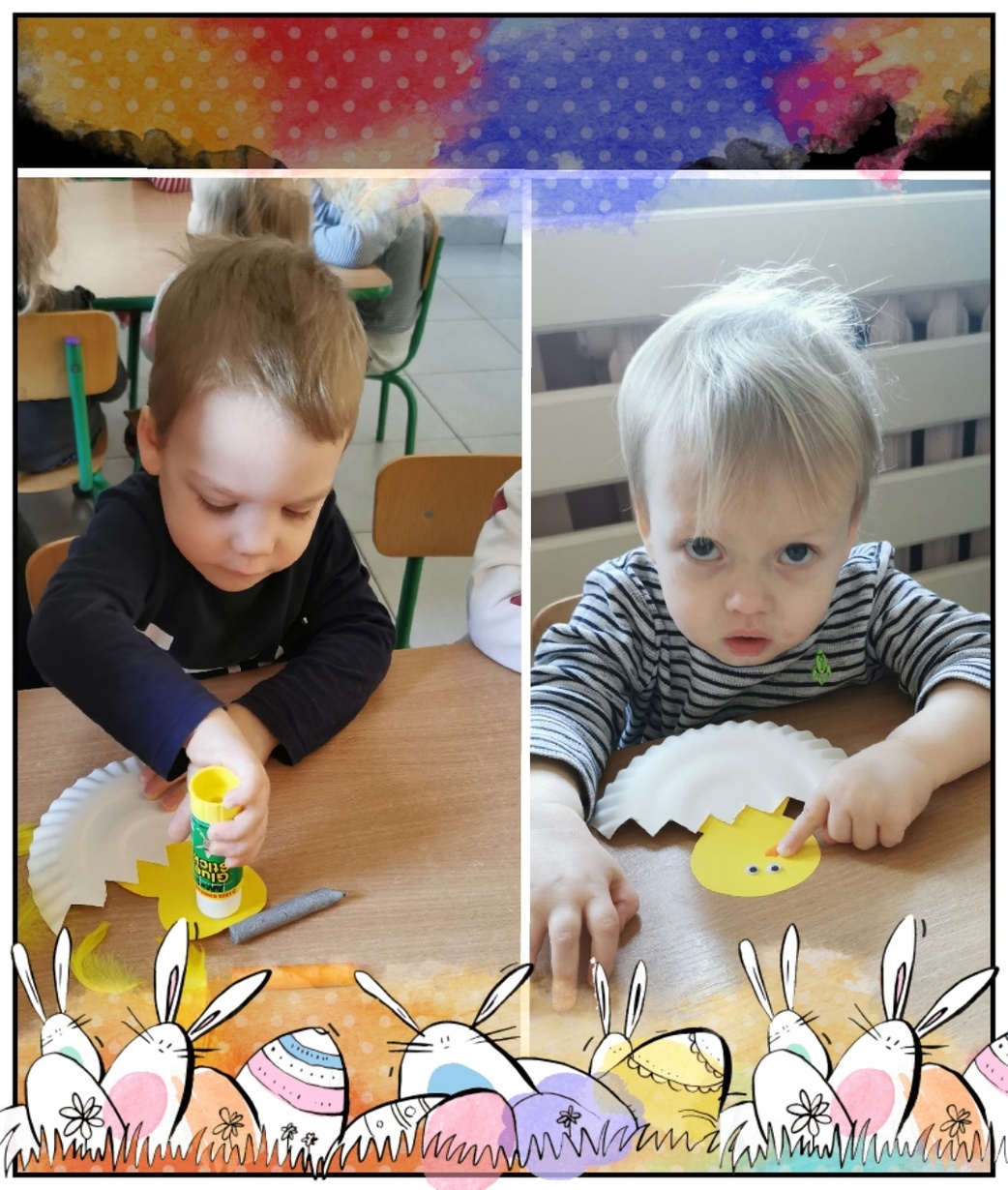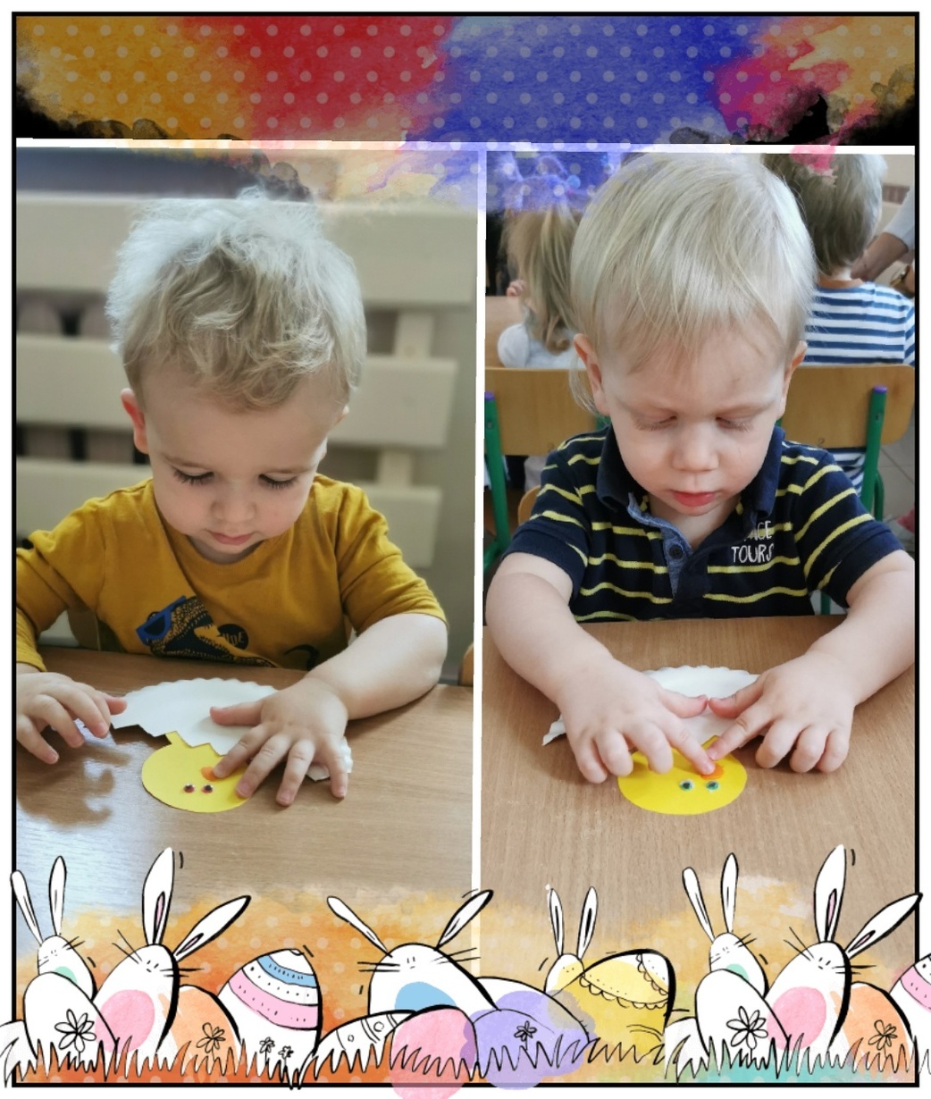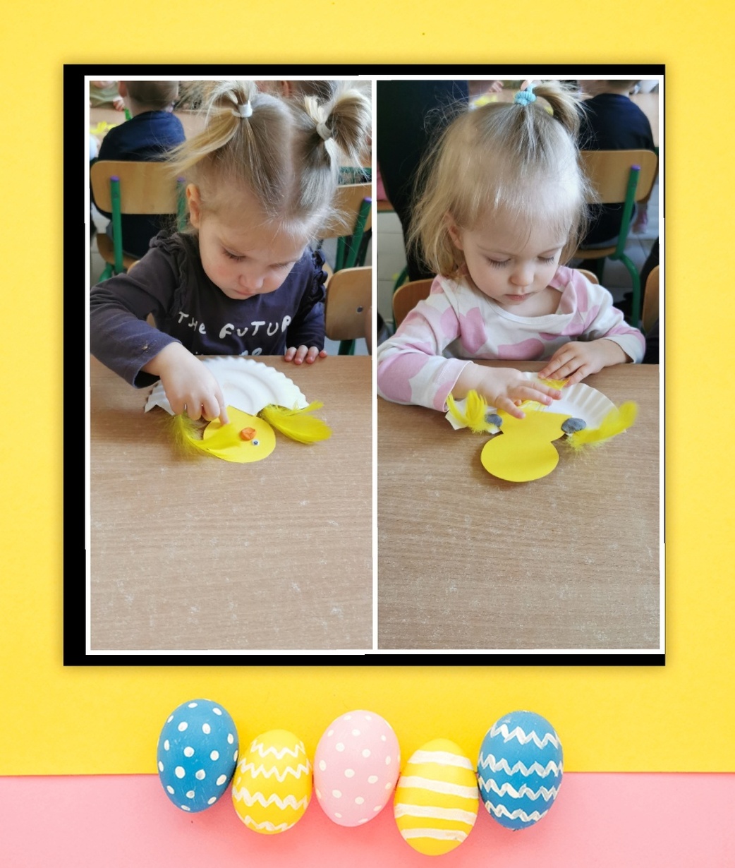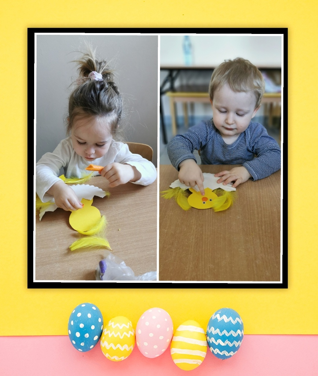 Nasze Biedronki rozpoczęły przygotowania do Świąt Wielkiej Nocy. Stworzyliśmy piękne prace nawiązujące do Wielkanocy, przedstawiające milutkie kurczaczki w skorupce jajka. Dzieci z zapałem i radością zabrały się do wykonywania prac: przyklejały kurczakom oczka, robiły dziobki z plasteliny a na koniec ozdabiały je puszystymi piórkami. Nasze dzieła można podziwiać w galerii zdjęć oraz w żłobkowym korytarzu, gdzie zamieszczone są na tablicy.