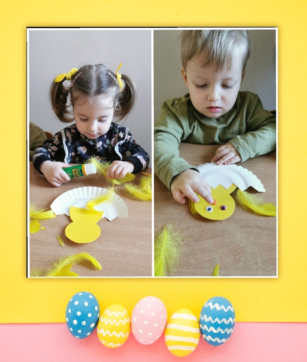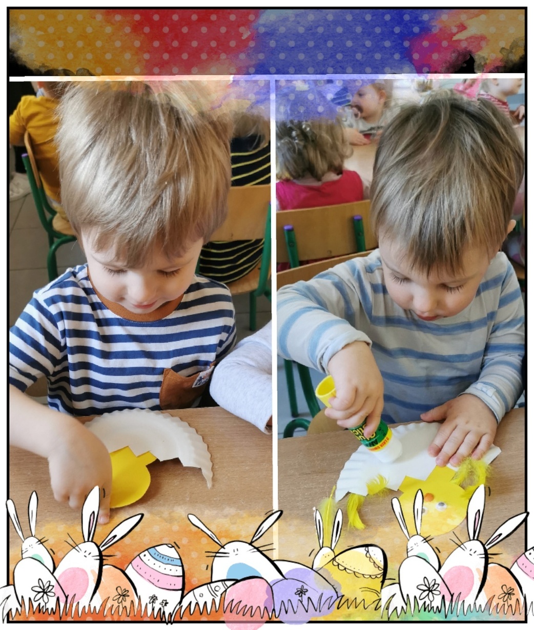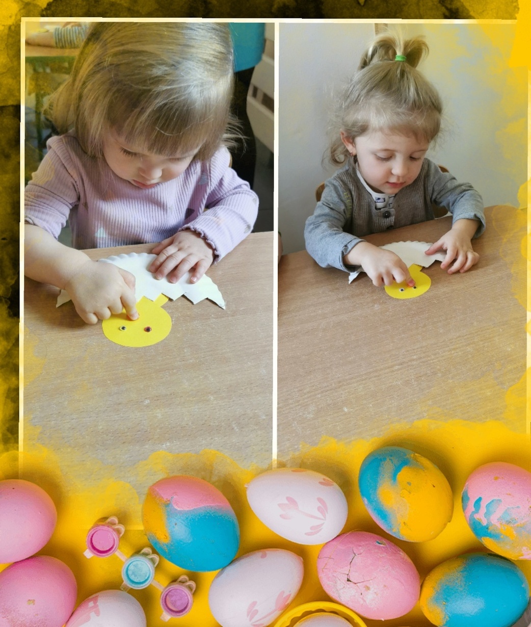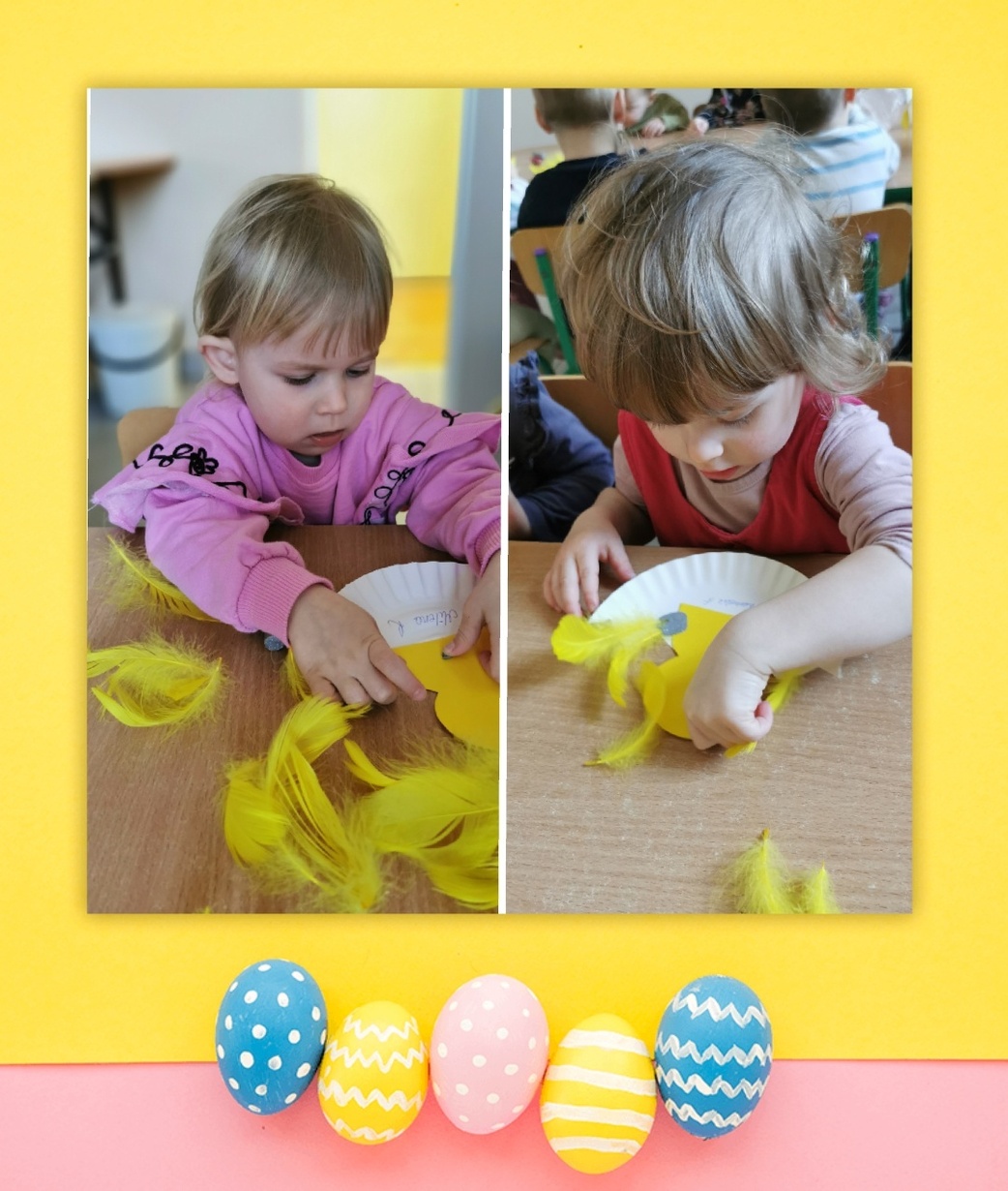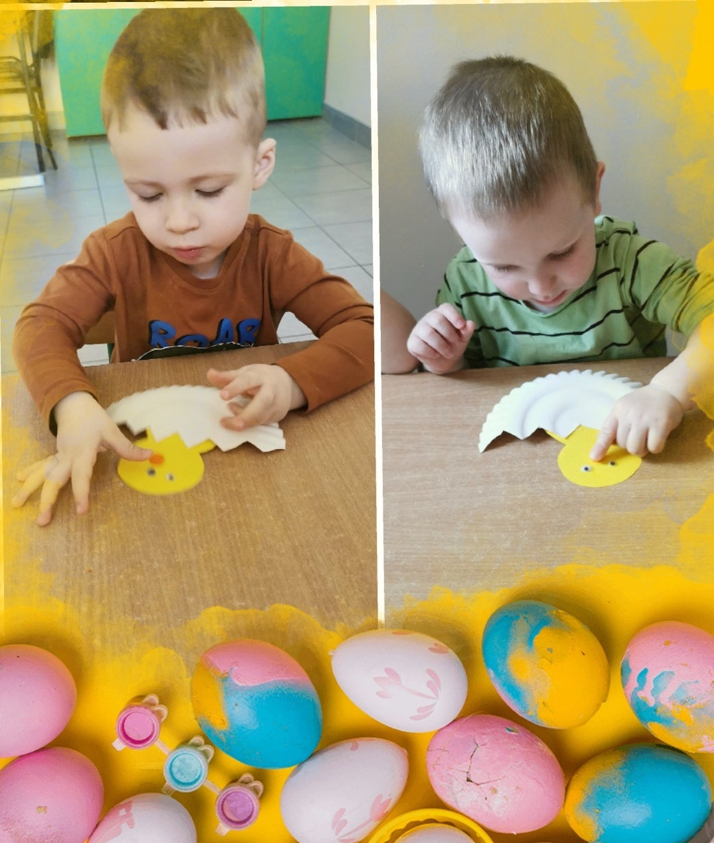 Nasze Biedronki rozpoczęły przygotowania do Świąt Wielkiej Nocy. Stworzyliśmy piękne prace nawiązujące do Wielkanocy, przedstawiające milutkie kurczaczki w skorupce jajka. Dzieci z zapałem i radością zabrały się do wykonywania prac: przyklejały kurczakom oczka, robiły dziobki z plasteliny a na koniec ozdabiały je puszystymi piórkami. Nasze dzieła można podziwiać w galerii zdjęć oraz w żłobkowym korytarzu, gdzie zamieszczone są na tablicy.