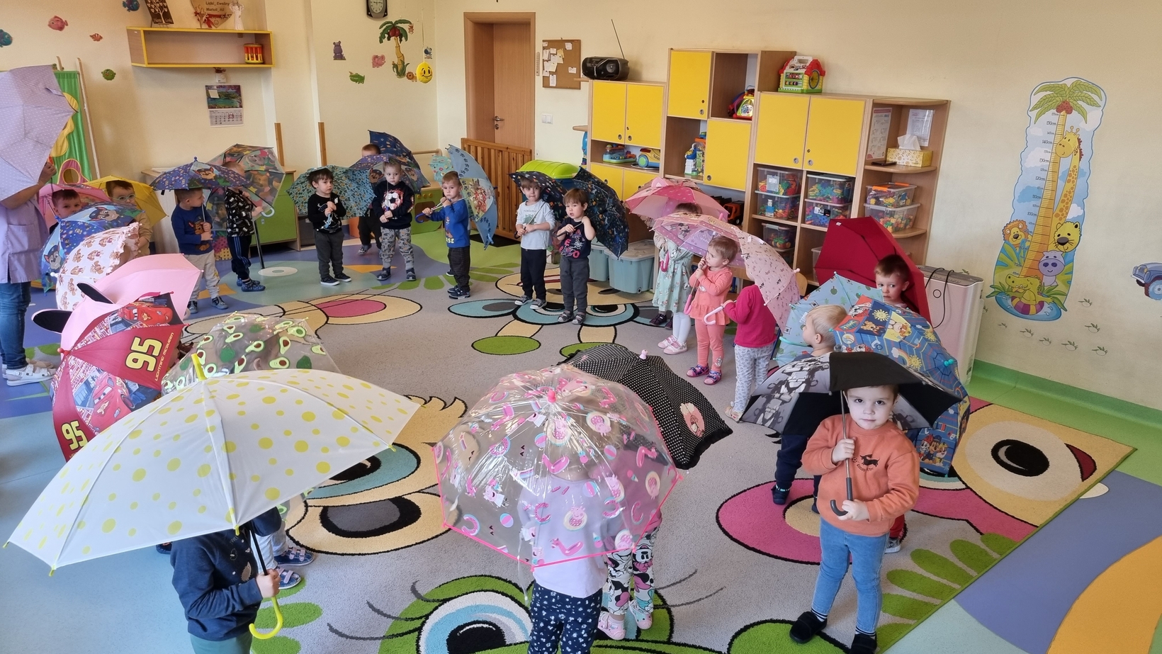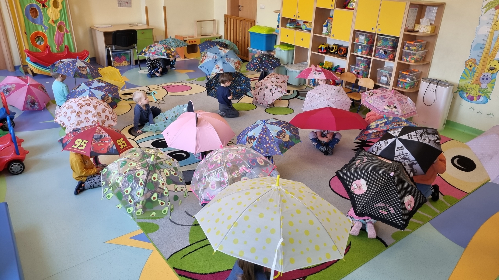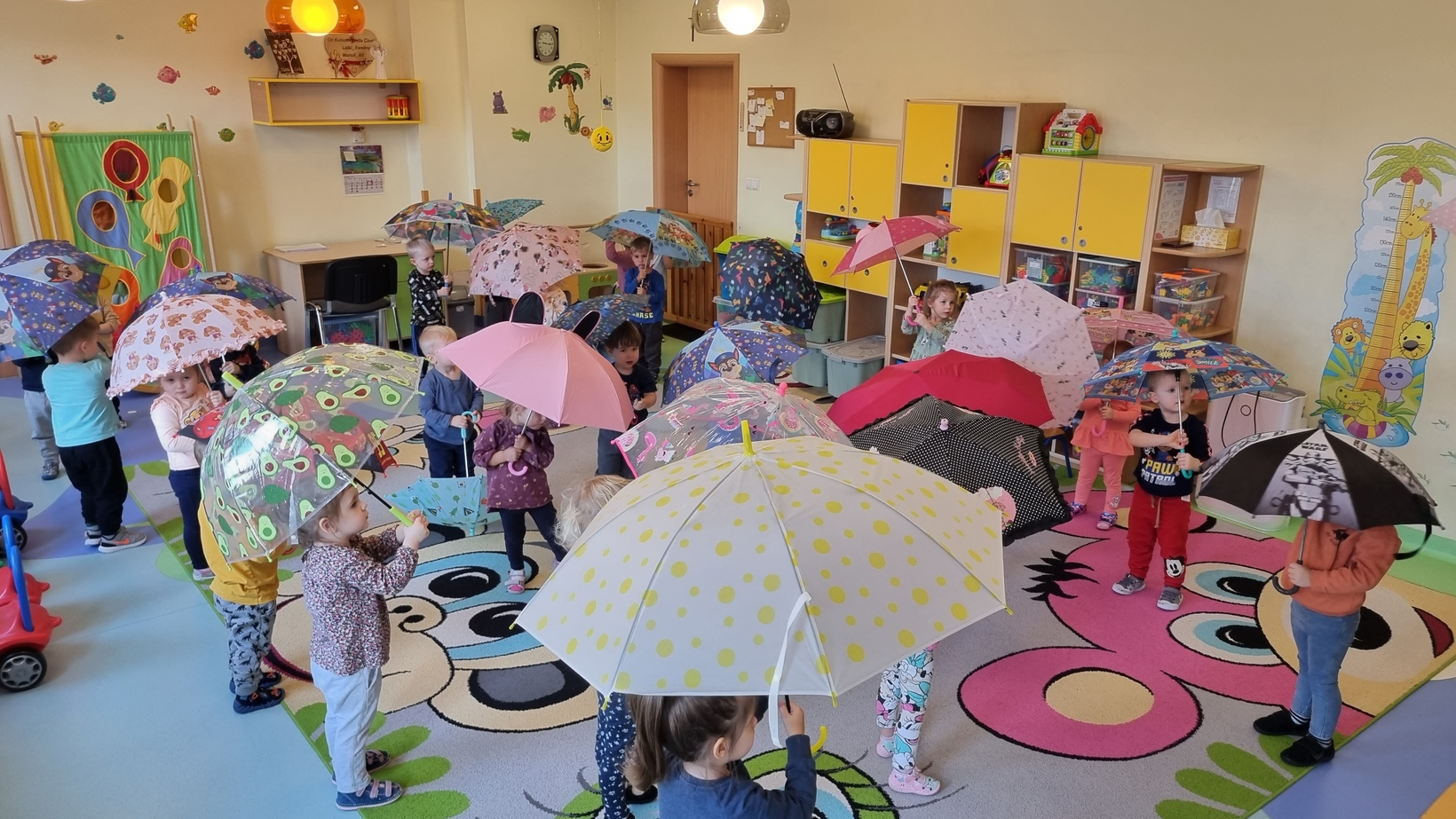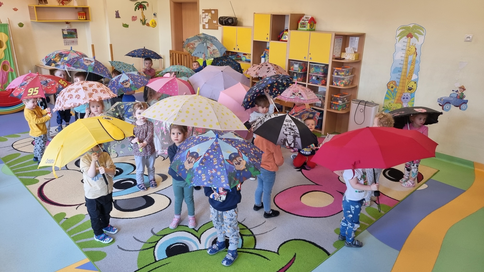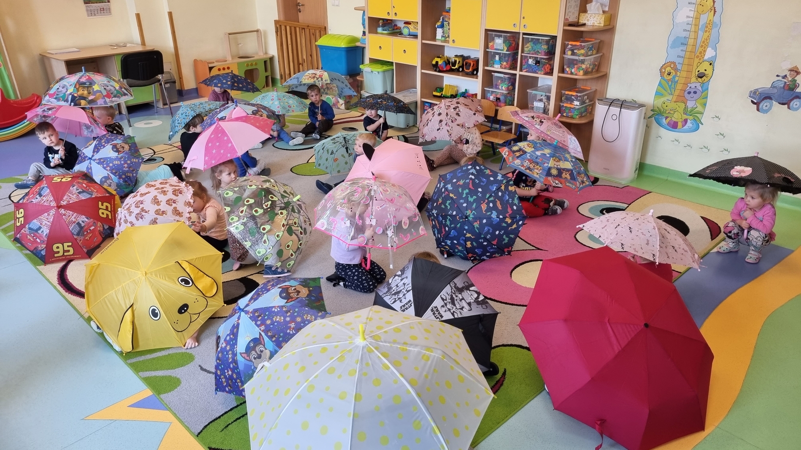 Dzisiaj w żłobku w gr. Pszczółek obchodziliśmy "Dzień Parasola". Dzieci w tym dniu przyniosły Swoje kolorowe parasolki. Bawiliśmy się w różne wesołe zabawy: wirowanie parasoli, tańczyliśmy z parasolkami i chowaliśmy się pod nimi. Był też czas na zabawy integracyjne tutaj za parasol posłużyła nam kolorowa chusta animacyjna. Radości było co niemiara, uśmiech nie znikał z dziecięcych twarzy. To był bardzo ciekawy dzień.