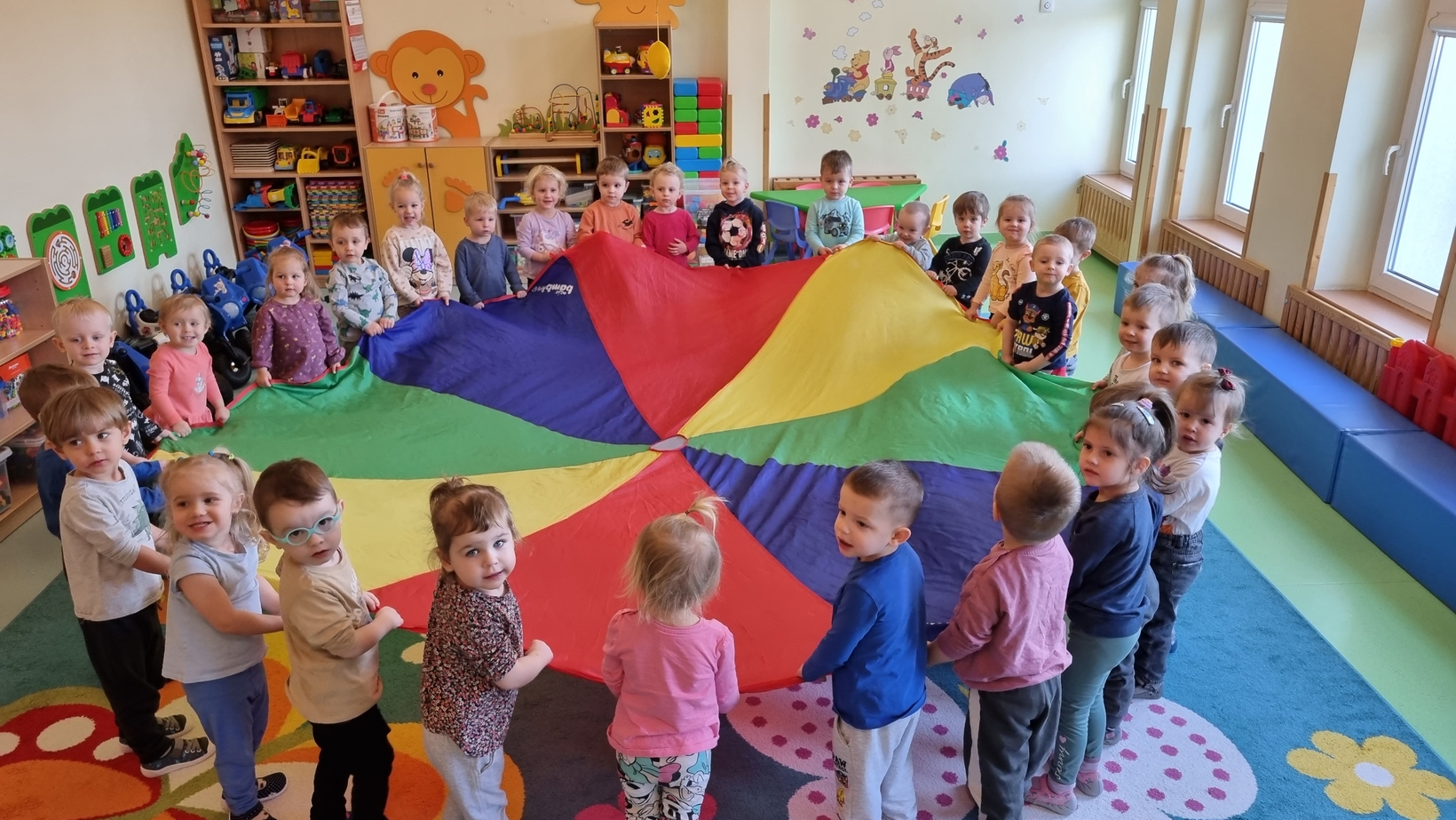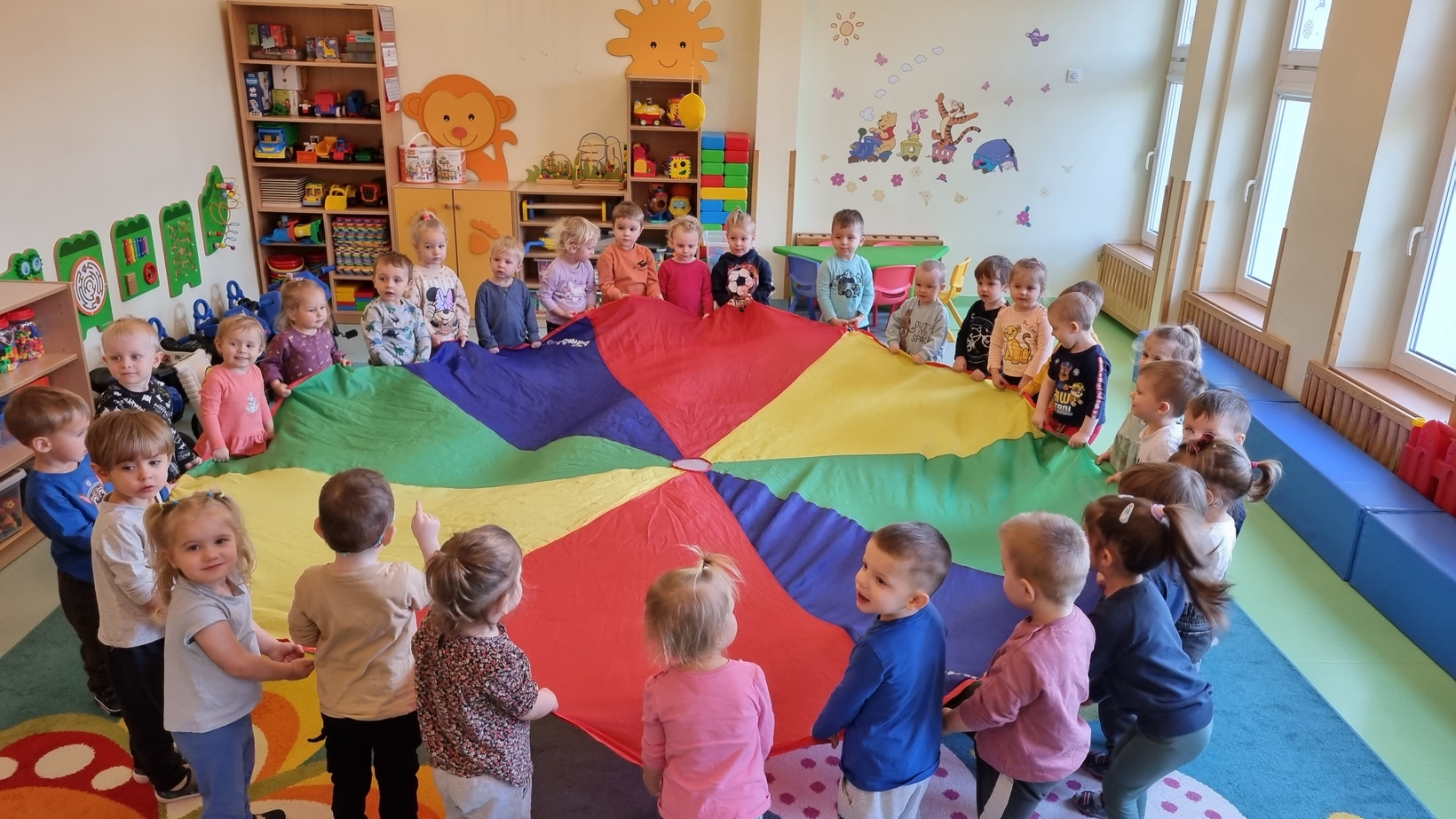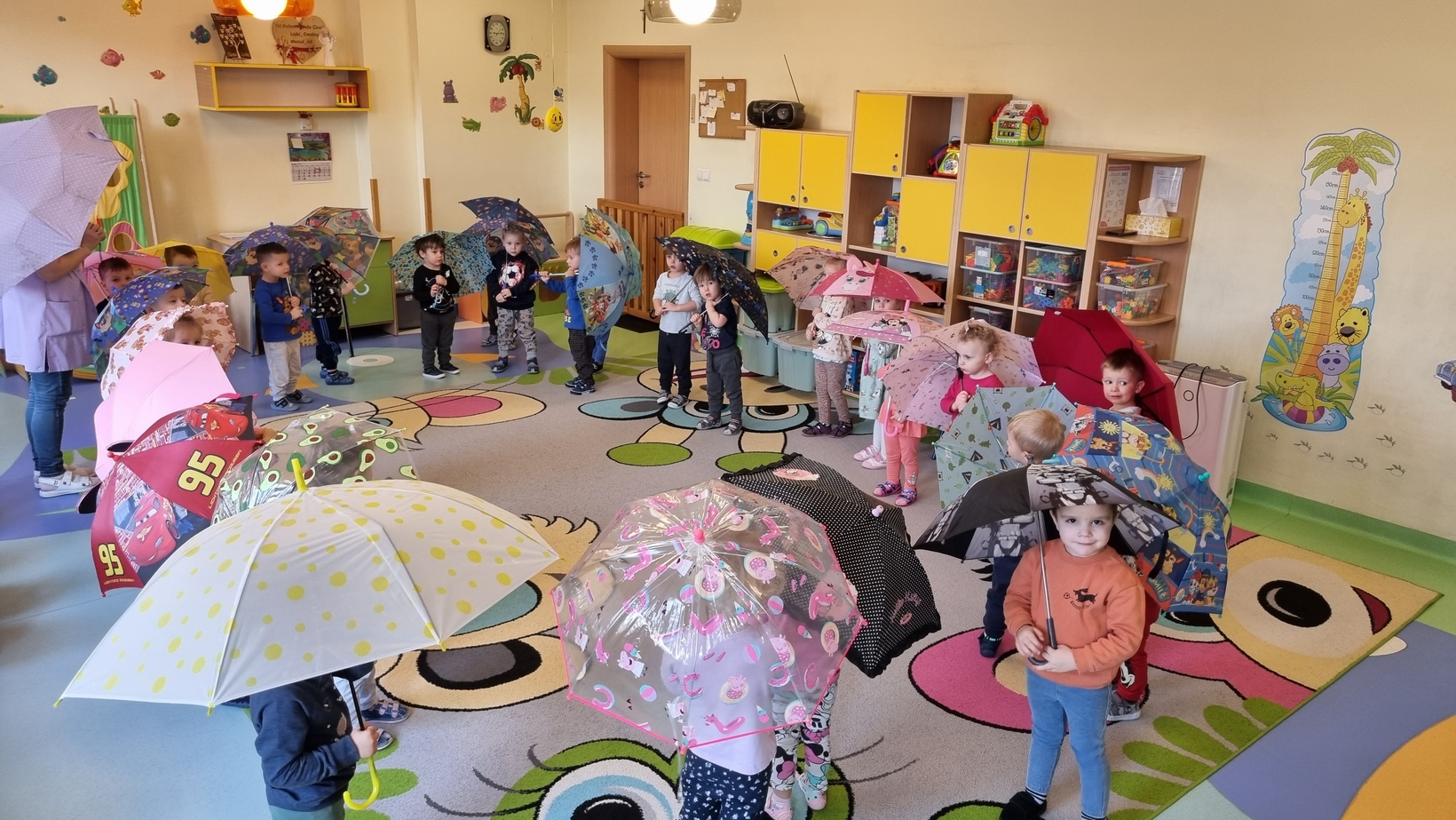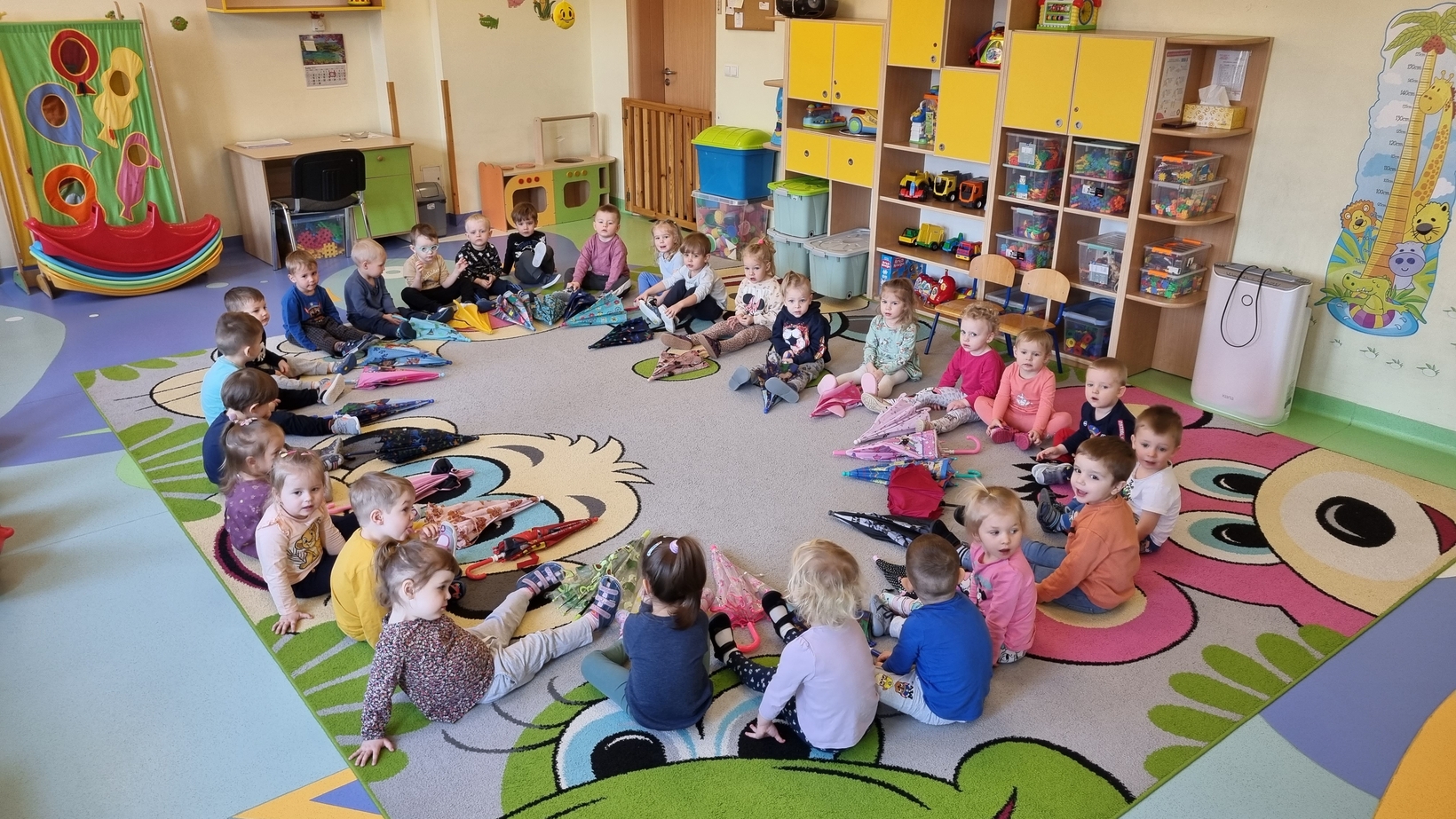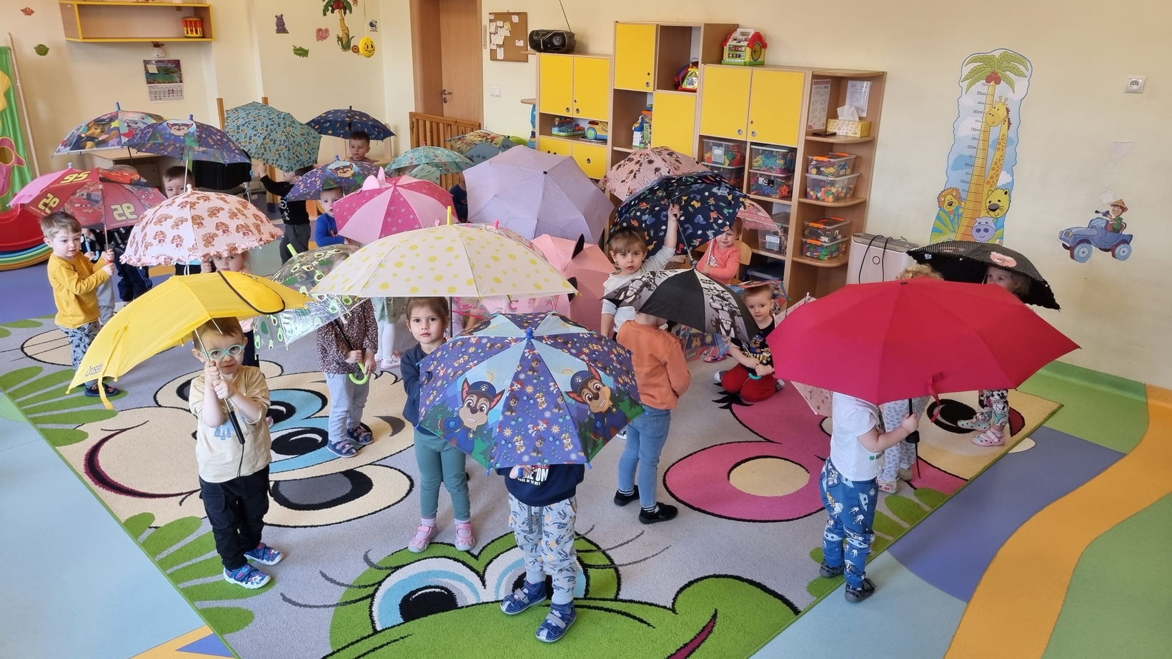 Dzisiaj w żłobku w gr. Pszczółek obchodziliśmy "Dzień Parasola". Dzieci w tym dniu przyniosły Swoje kolorowe parasolki. Bawiliśmy się w różne wesołe zabawy: wirowanie parasoli, tańczyliśmy z parasolkami i chowaliśmy się pod nimi. Był też czas na zabawy integracyjne tutaj za parasol posłużyła nam kolorowa chusta animacyjna. Radości było co niemiara, uśmiech nie znikał z dziecięcych twarzy. To był bardzo ciekawy dzień.