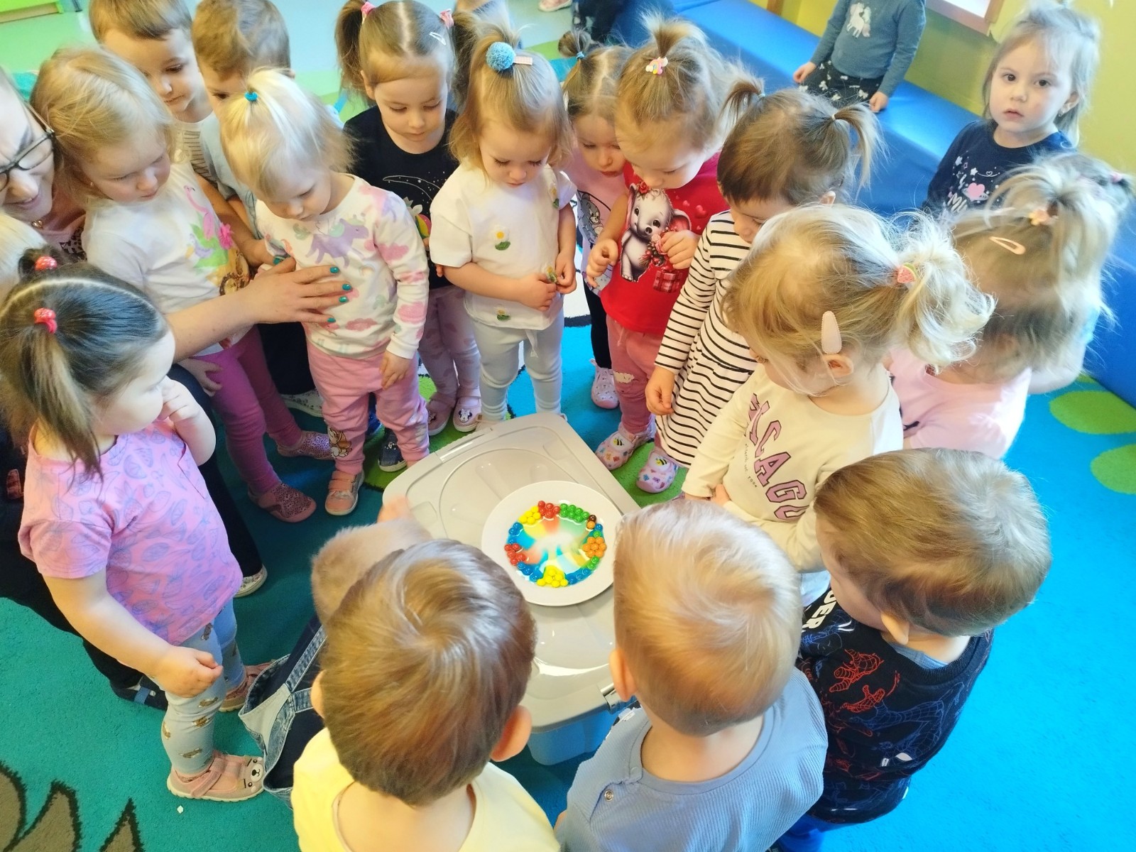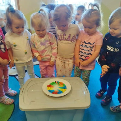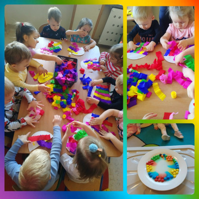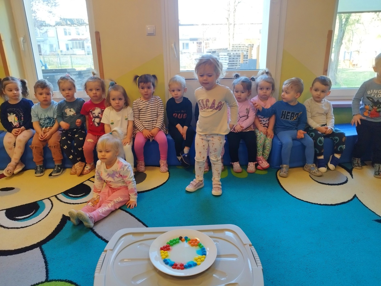 IZdjęcie przedstawia dzieci podczas zajęć tematycznych o tęczy