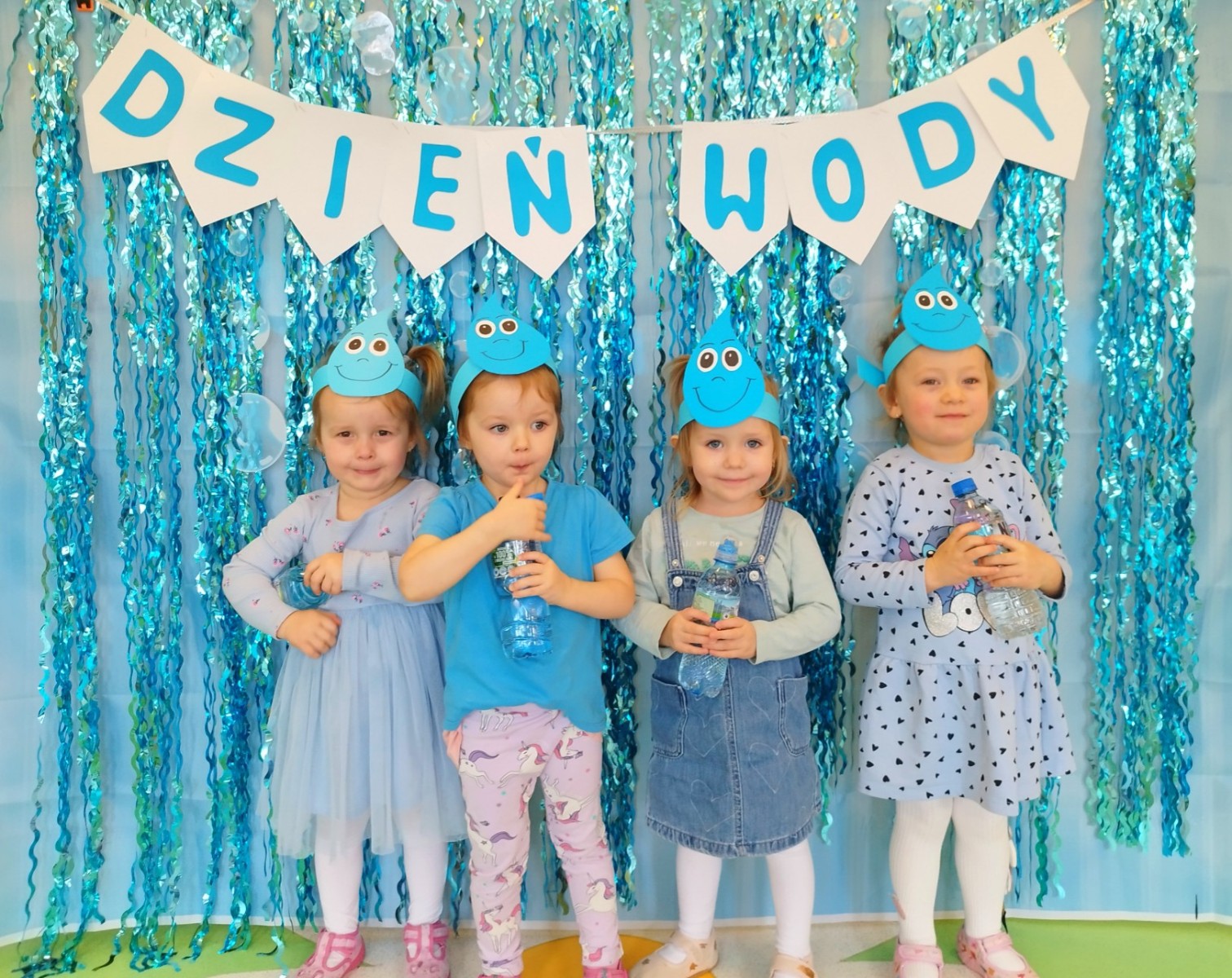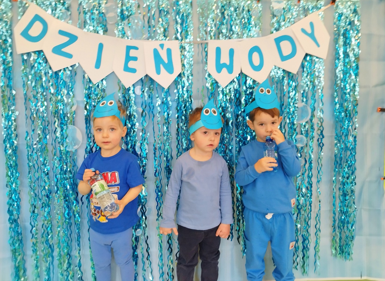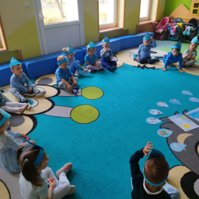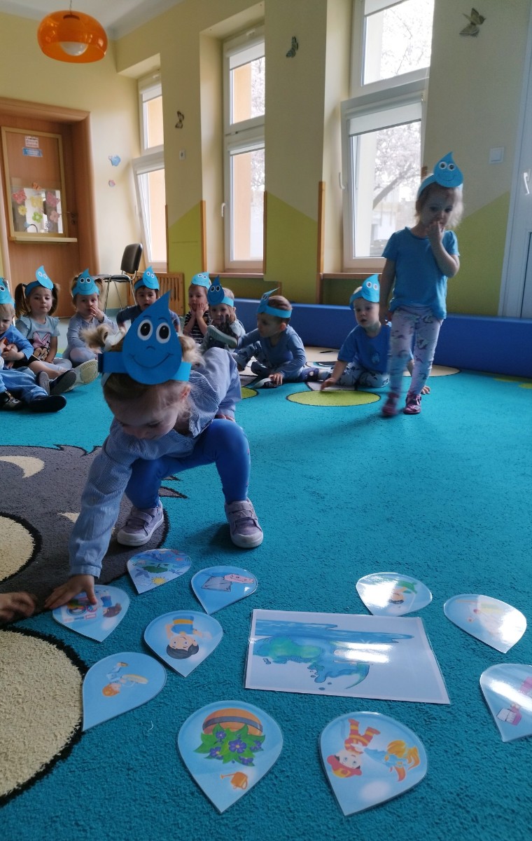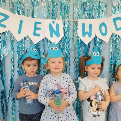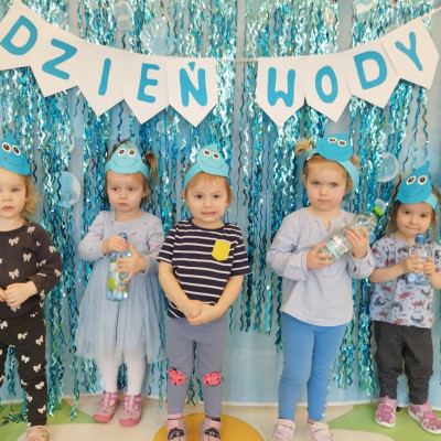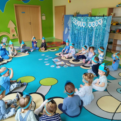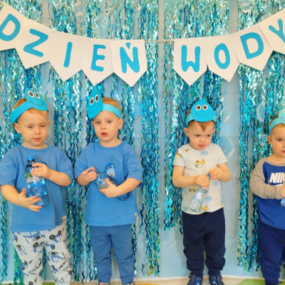 Tego dnia dzieci wystroiły się w kolory wody -we wszystkie jej odcienie, a także przyniosły butelkę swojej ulubionej wody. Podczas zajęć tematycznych żłobkowicze dowiedzieli się do czego wykorzystujemy wodę - do picia, gotowania, mycia, prania i sprzątania, gaszenia pożaru czy podlewania. Poznali również zasady oszczędzania wody i dbania o jej czystość, gdyż jest to bardzo ważne dla całej planety i przyszłych pokoleń.