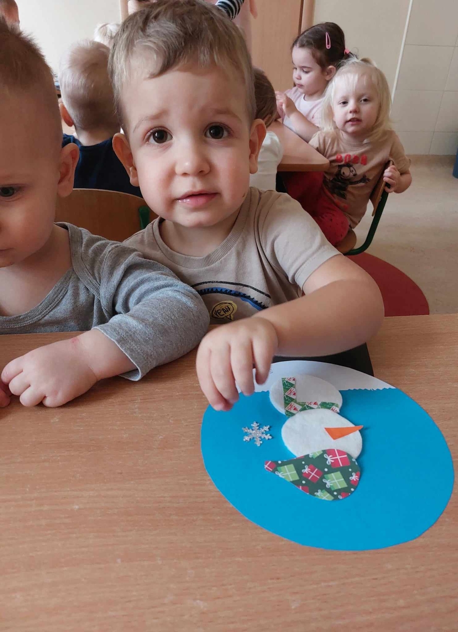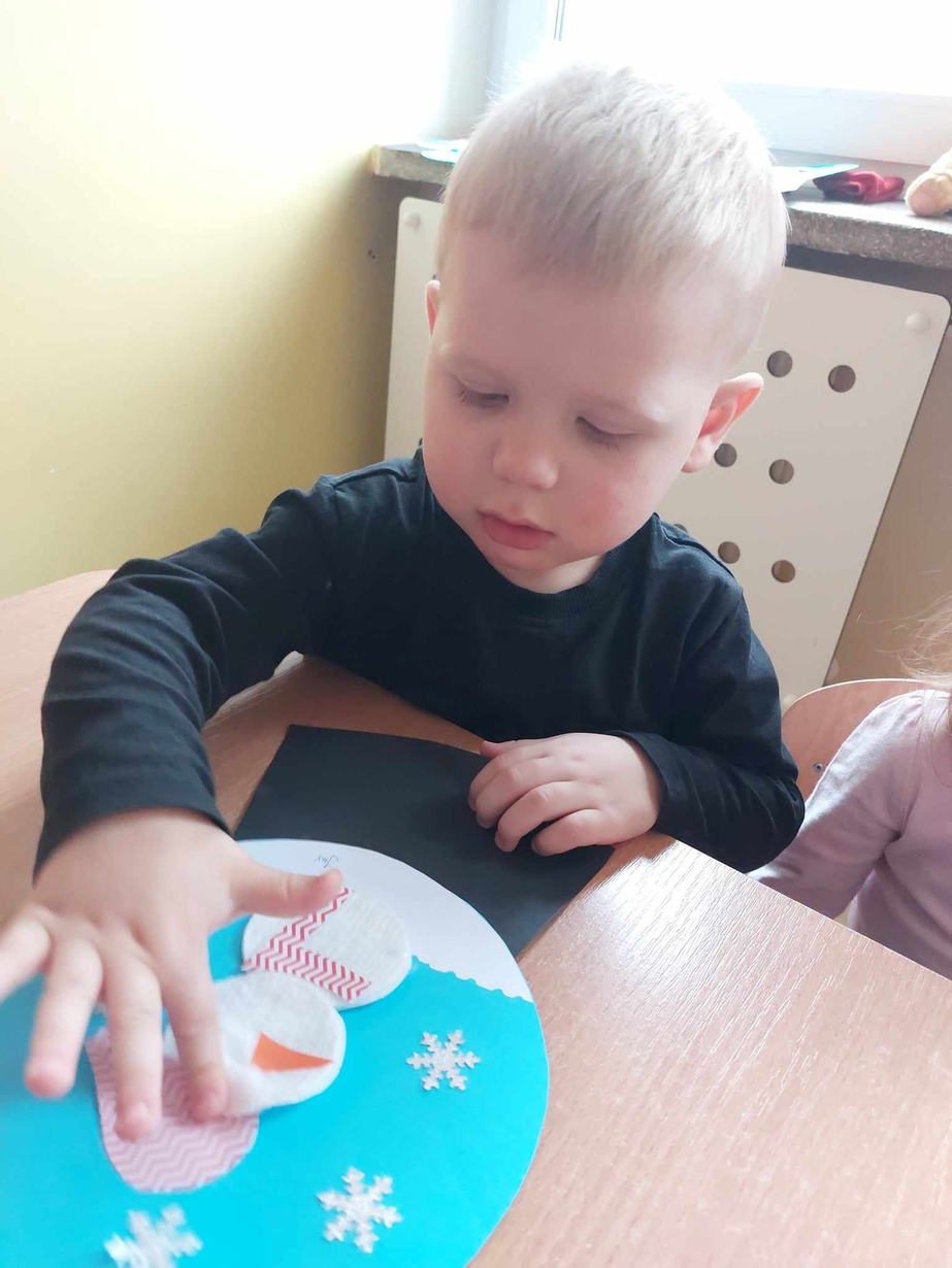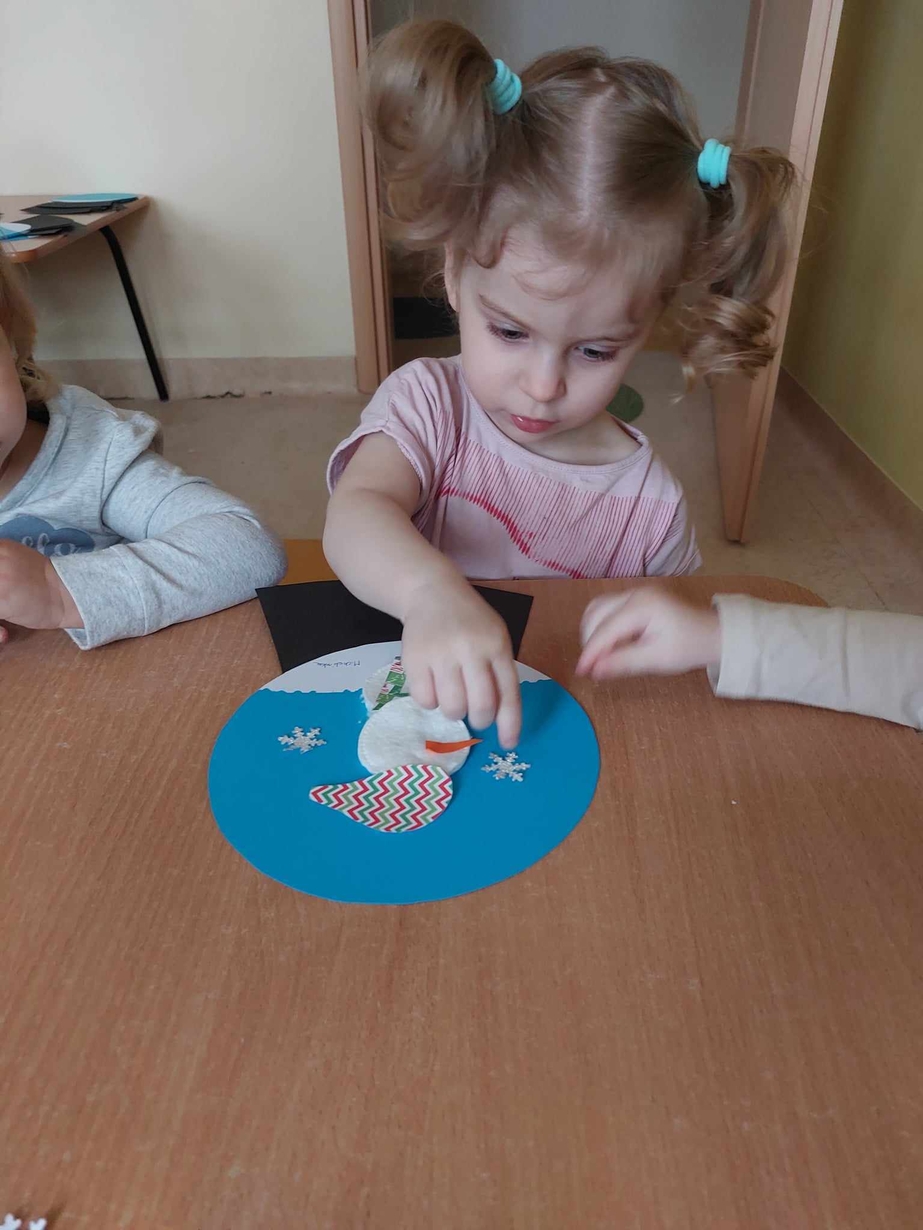 W związku z tym dzieci z grupy Muchomorków wykonały prace plastyczna -"Bałwanek"-wykorzystując do tego płatki kosmetyczne,kolorowy papier i pompony.