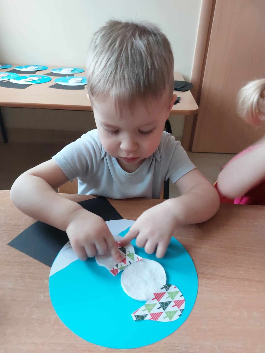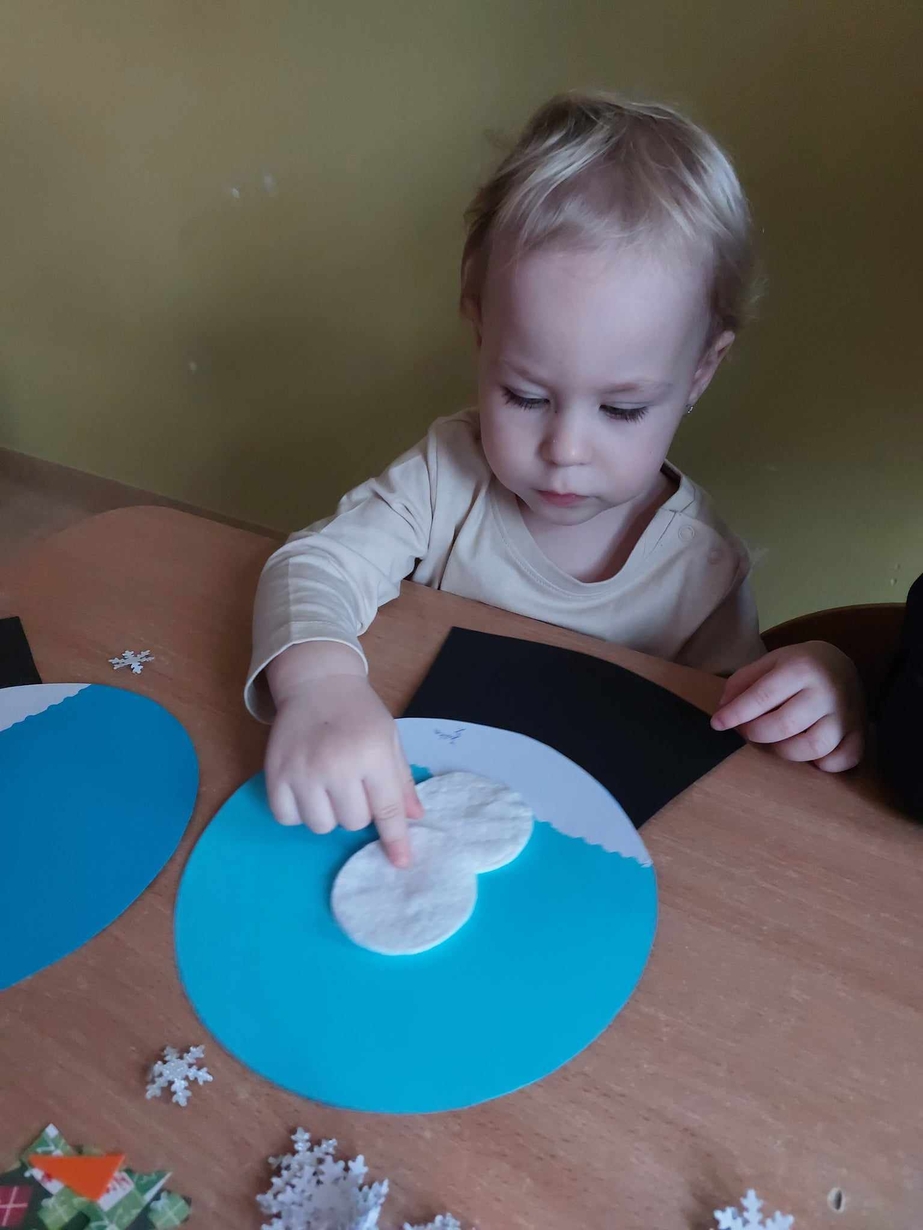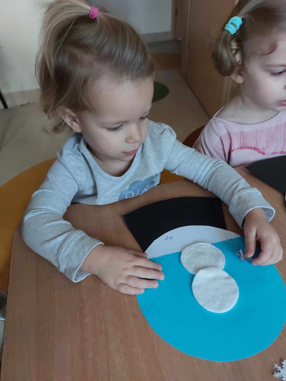 W związku z tym dzieci z grupy Muchomorków wykonały prace plastyczna -"Bałwanek"-wykorzystując do tego płatki kosmetyczne,kolorowy papier i pompony.
