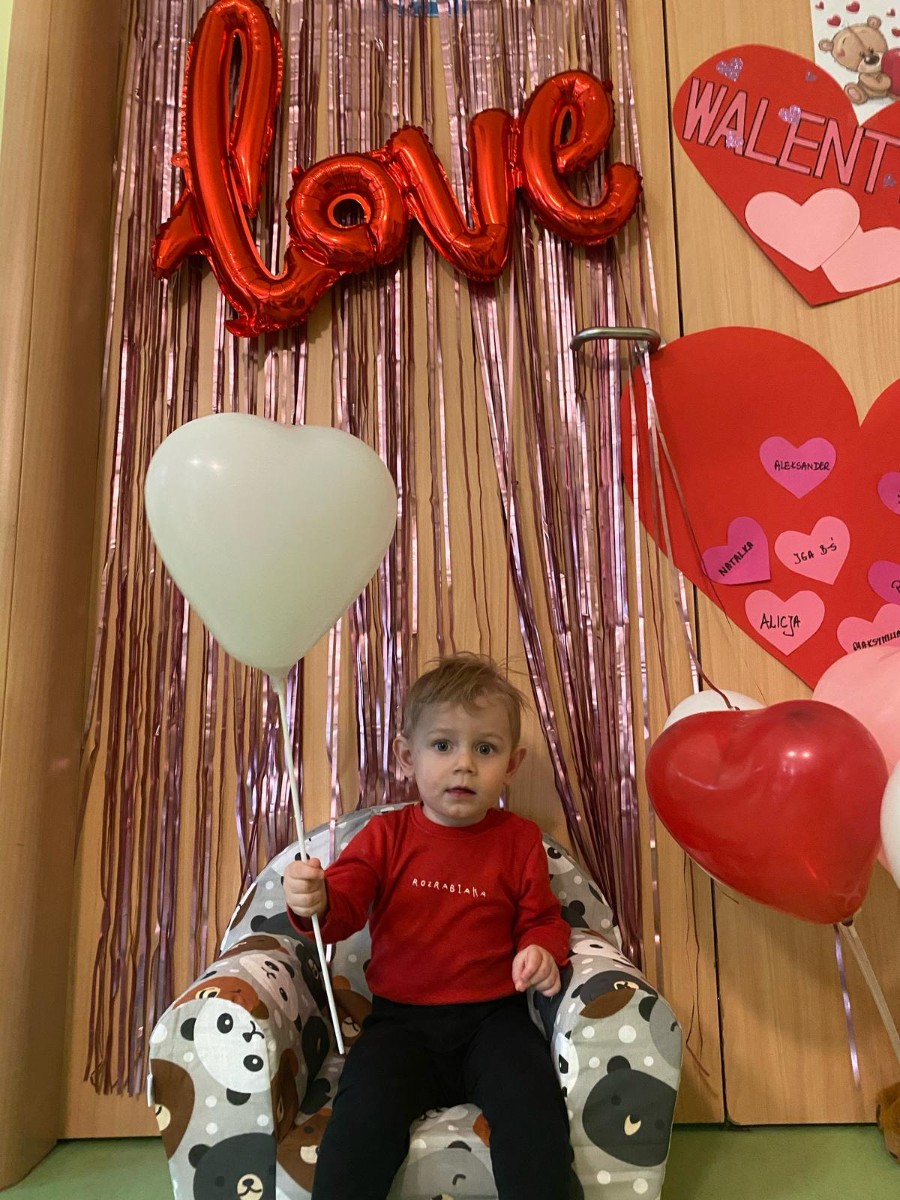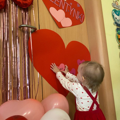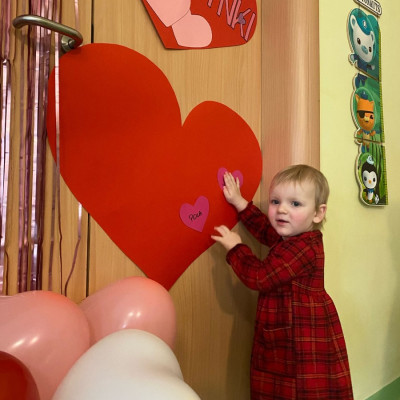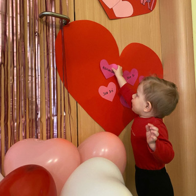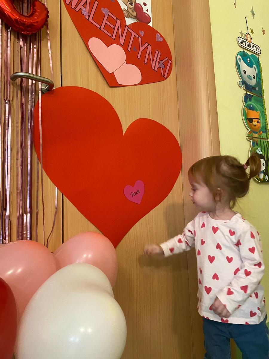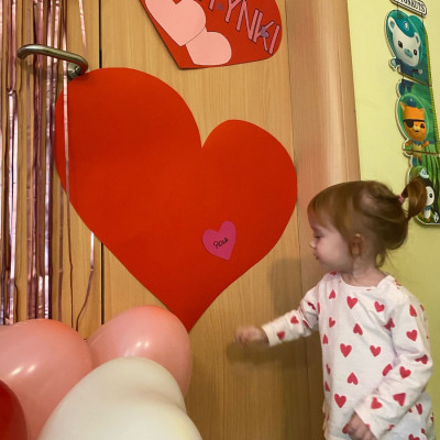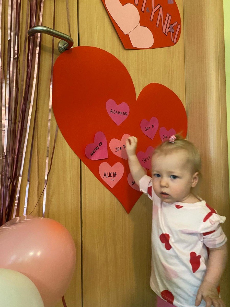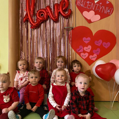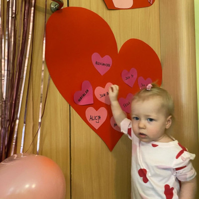 Wszystkie nasze pociechy przyszły ubrane na czerwono, dzieci pozowały do zdjęć oraz brały udział w zabawie podczas, której przyklejały serduszka ze swoim imieniem na dużym czerwonym sercu.