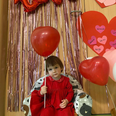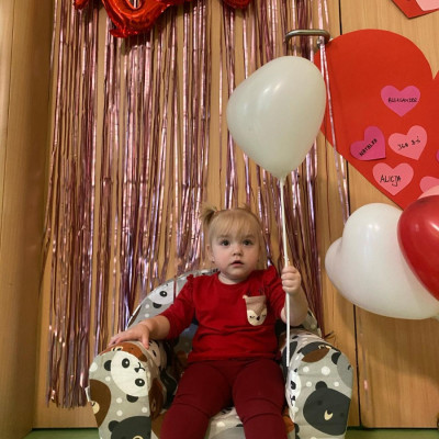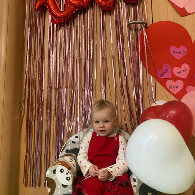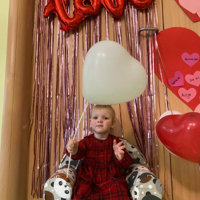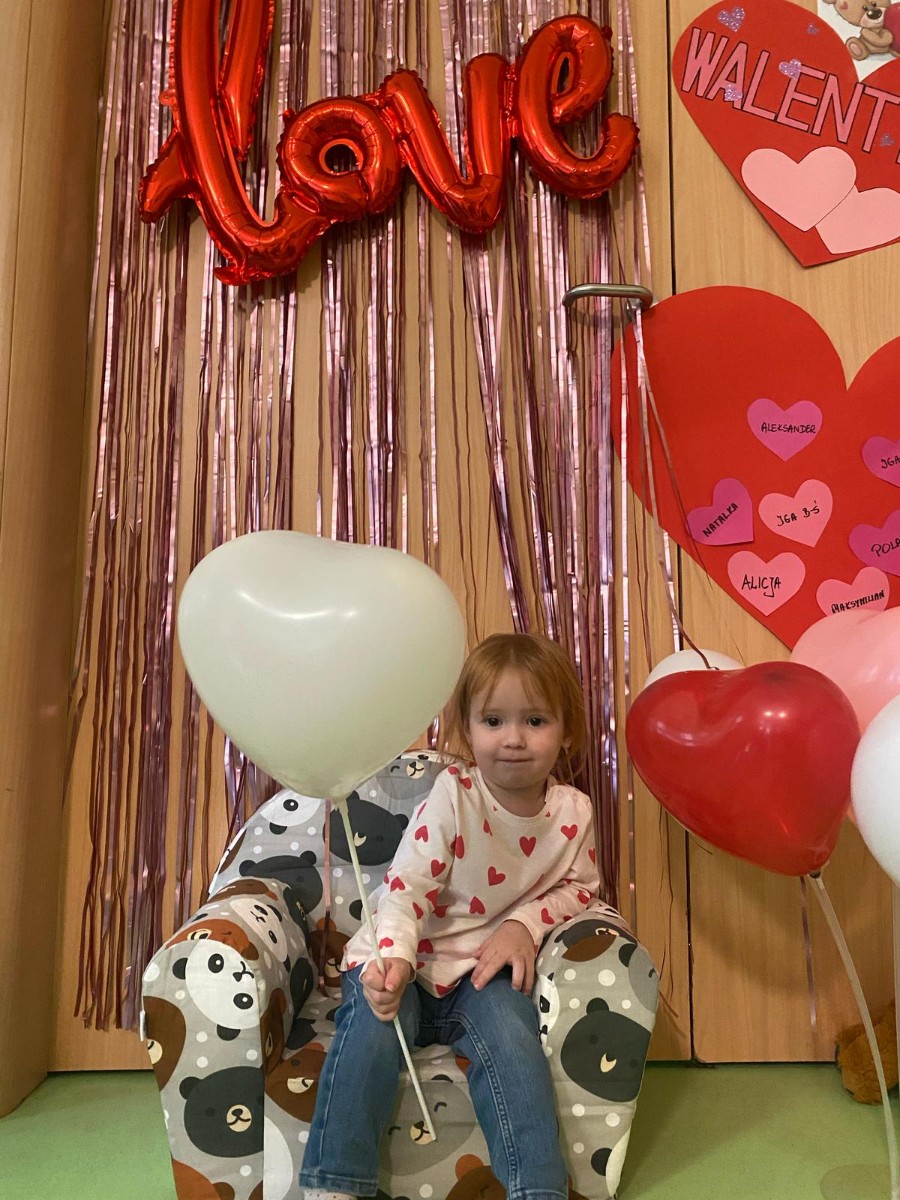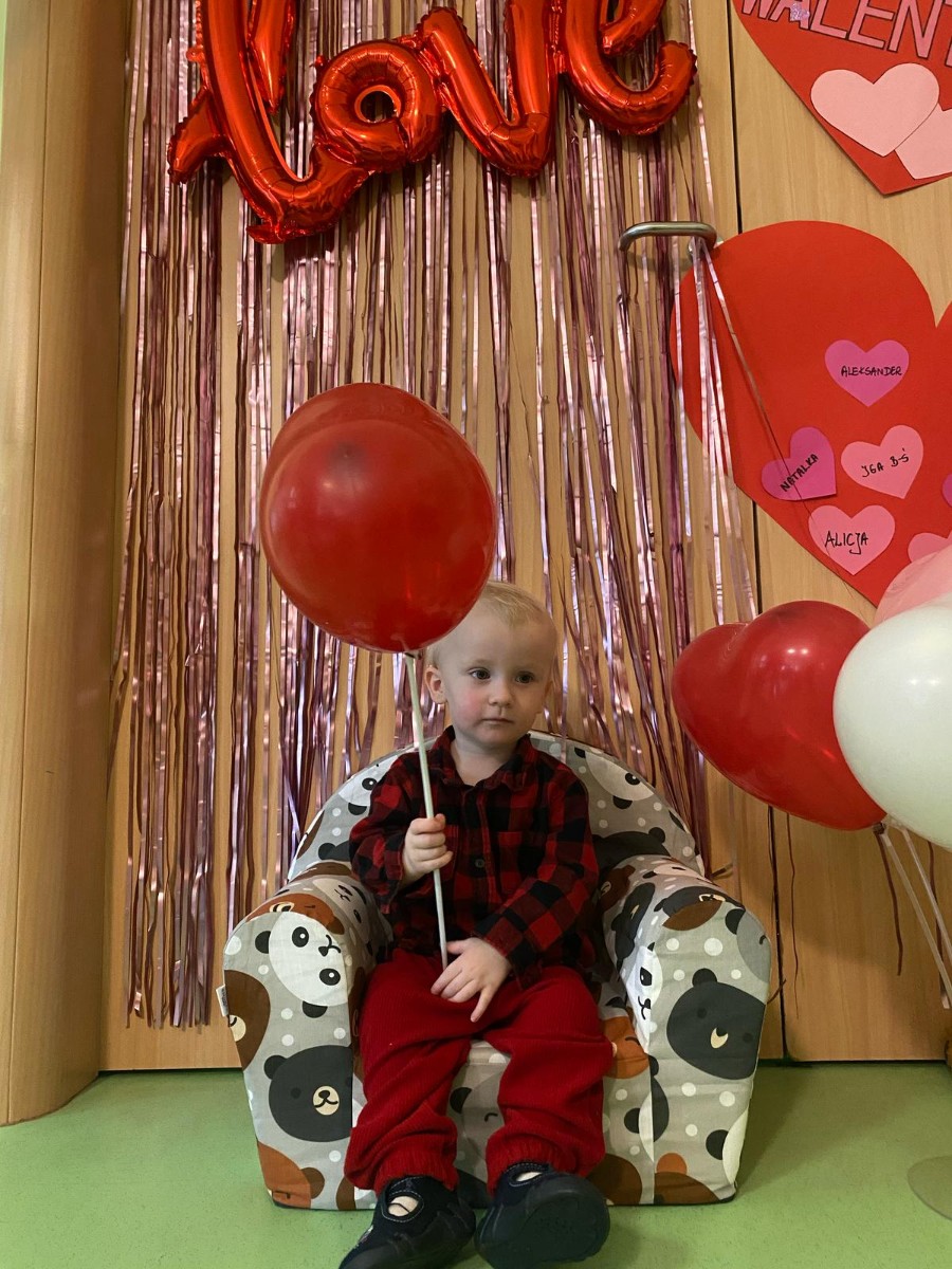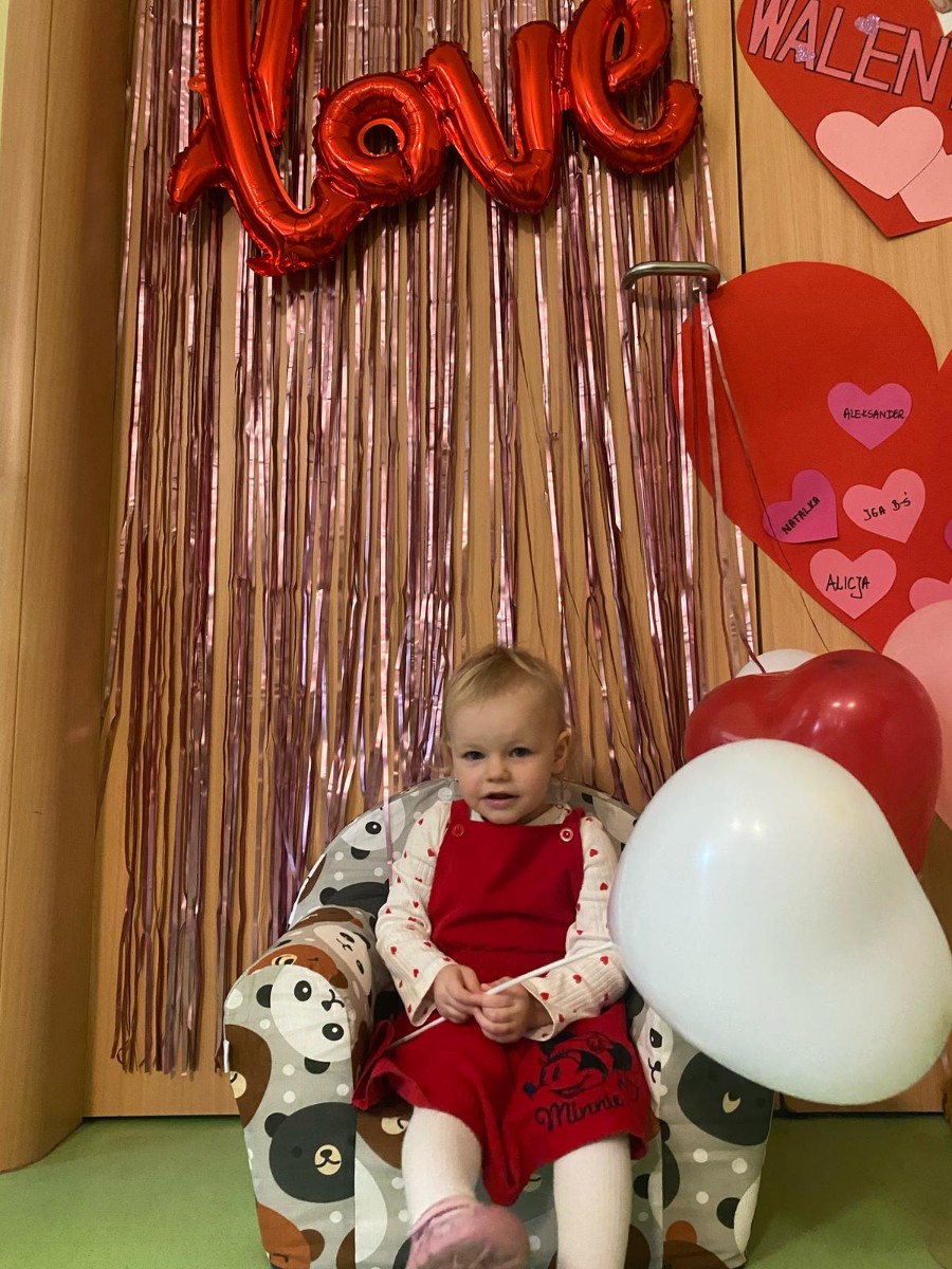 Wszystkie nasze pociechy przyszły ubrane na czerwono, dzieci pozowały do zdjęć oraz brały udział w zabawie podczas, której przyklejały serduszka ze swoim imieniem na dużym czerwonym sercu.