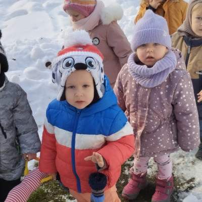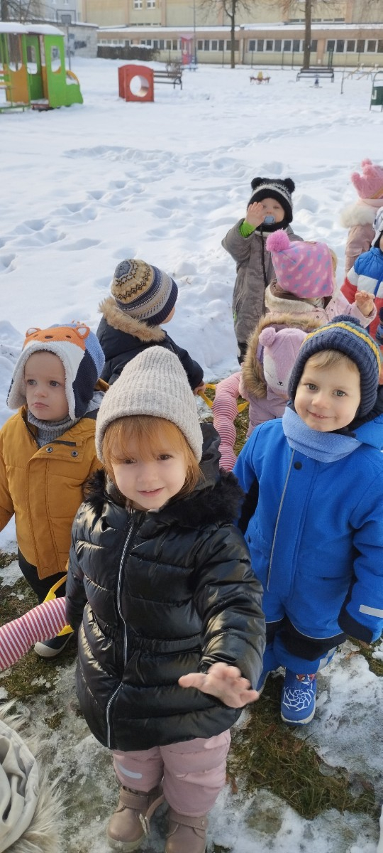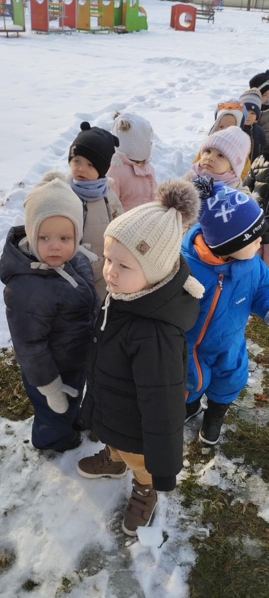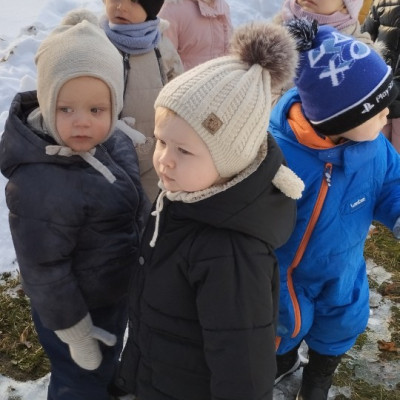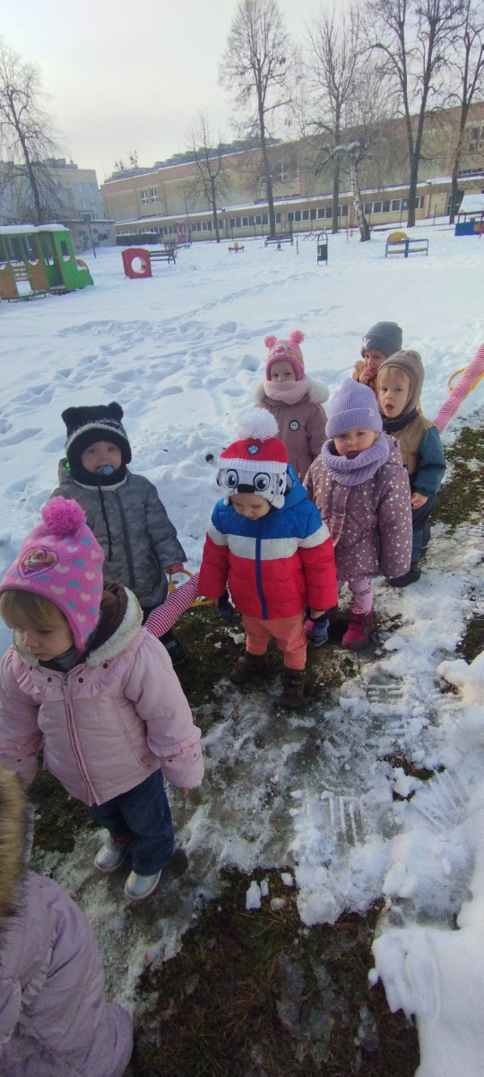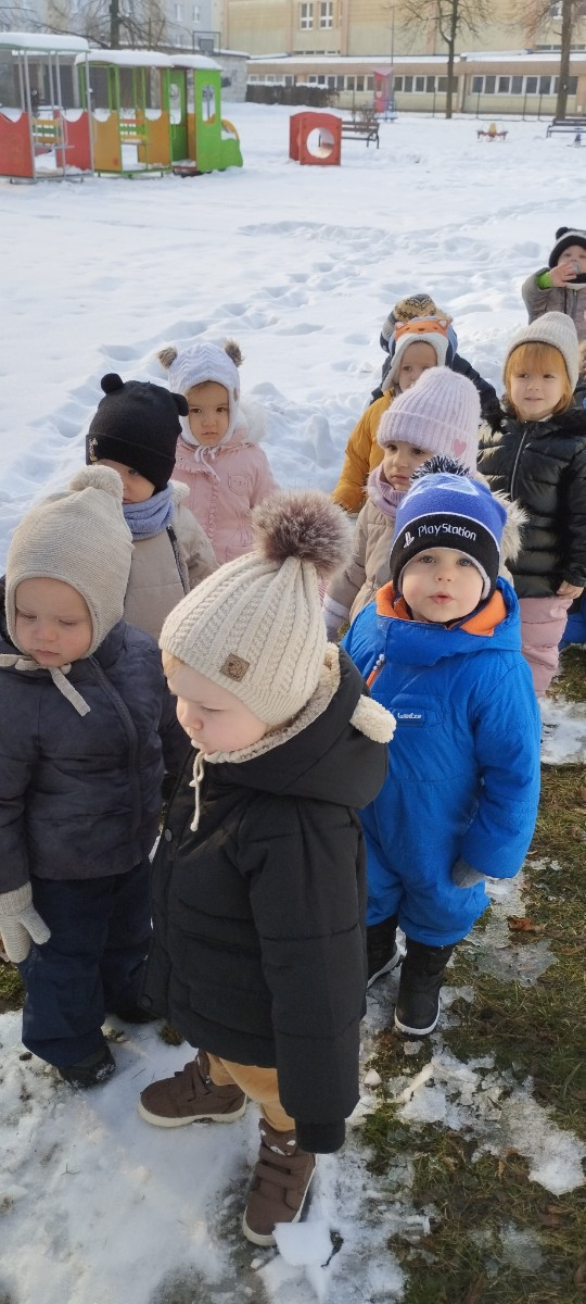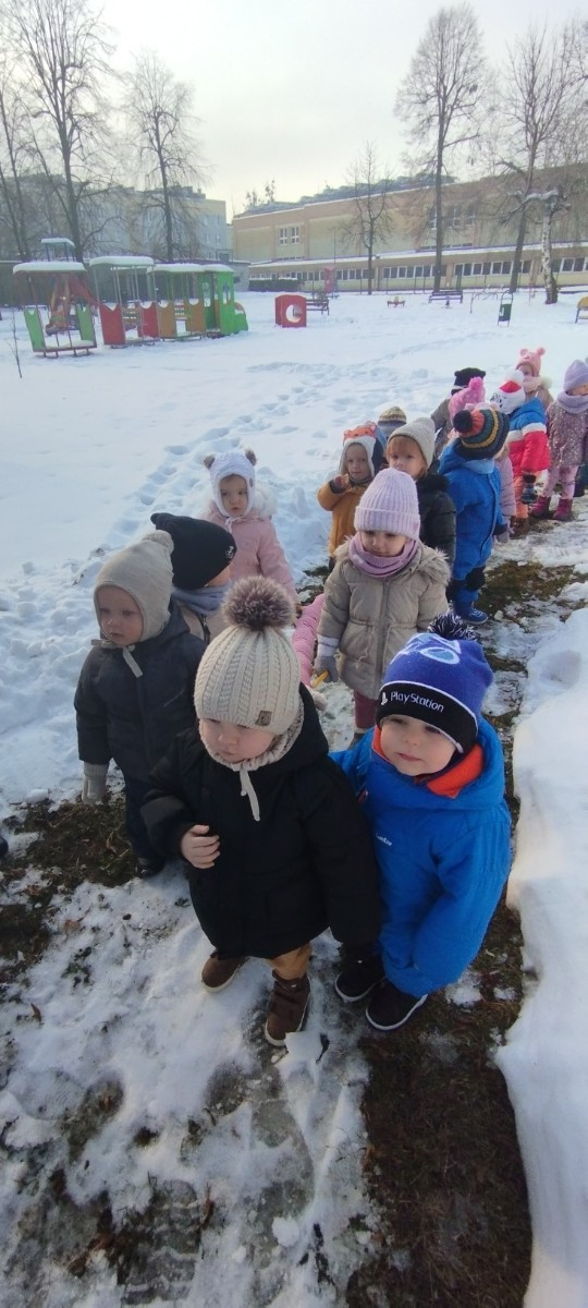 Dzieci z grupy ,,Żabki " i ,, Biedronki" podczas zimowego spacery