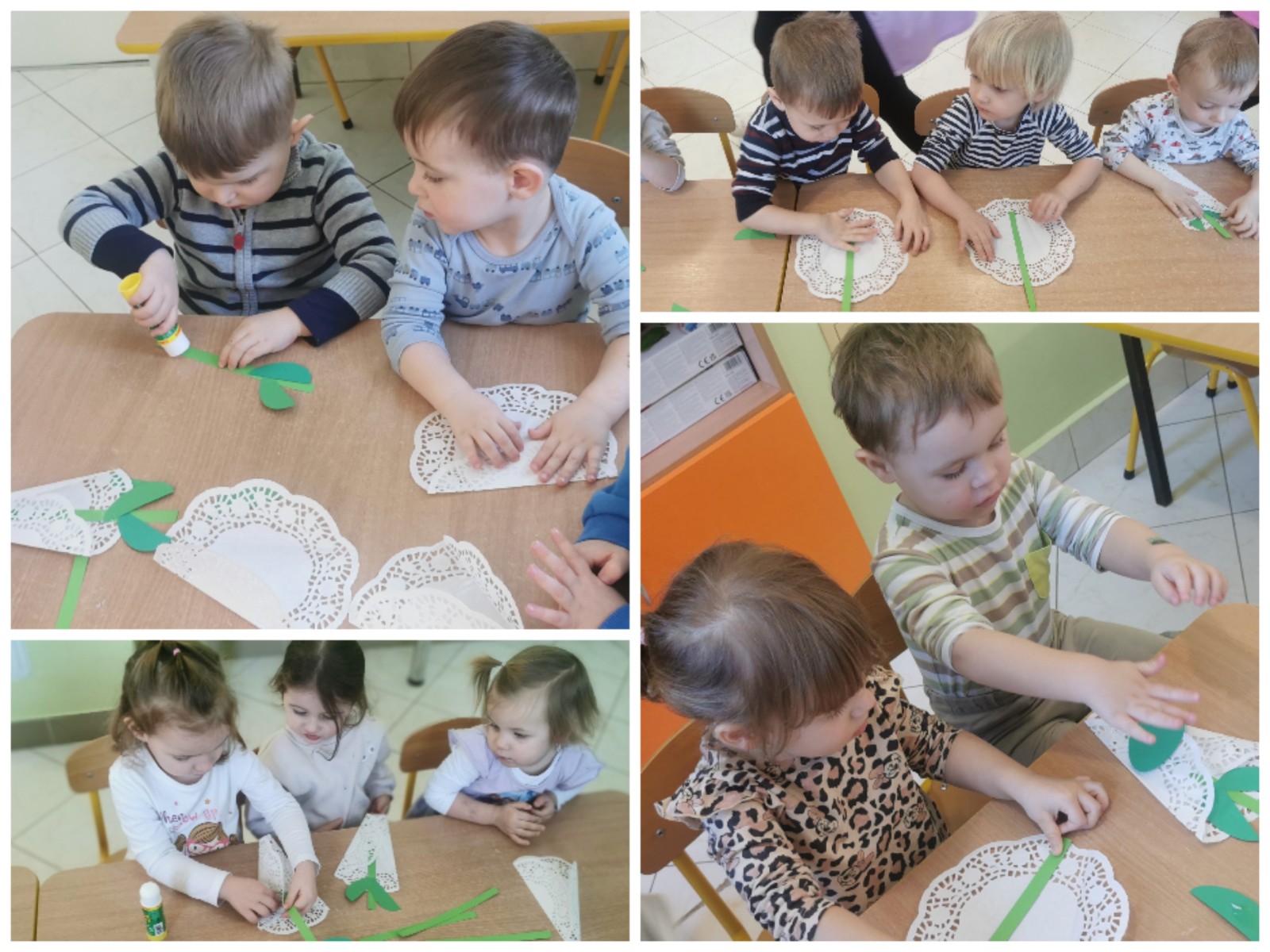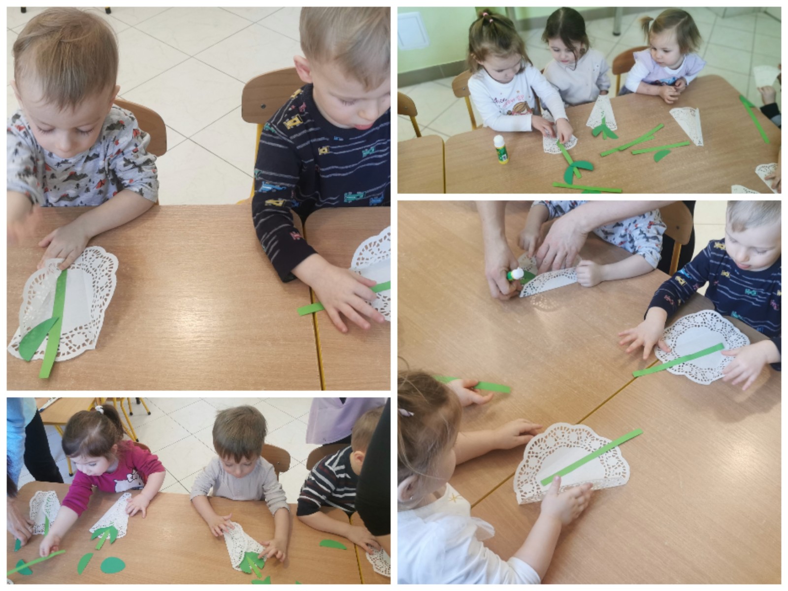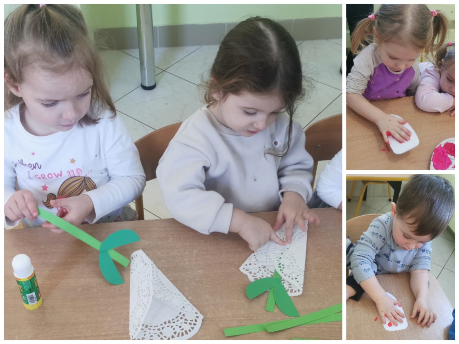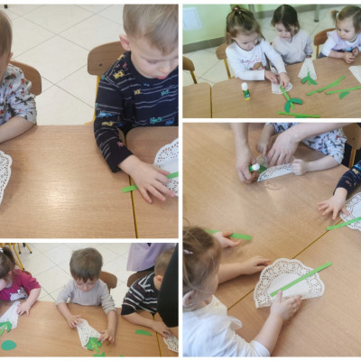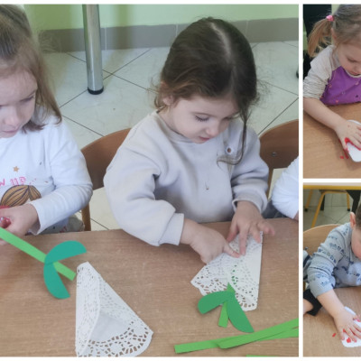 Zdjęcie przedstawia dzieci wykonujące prace plastyczne i świętujące Dzień Babci i Dziadzia.