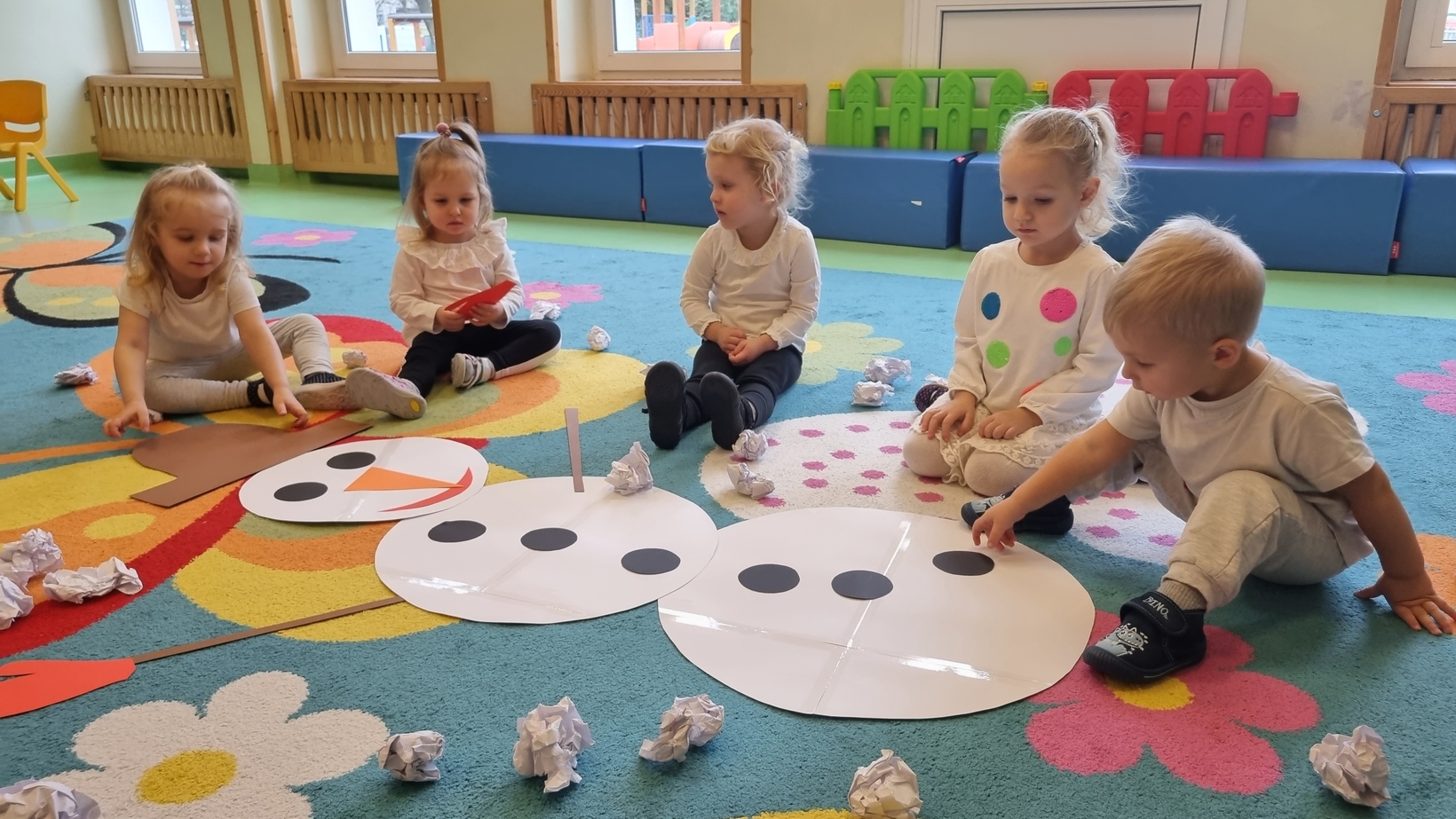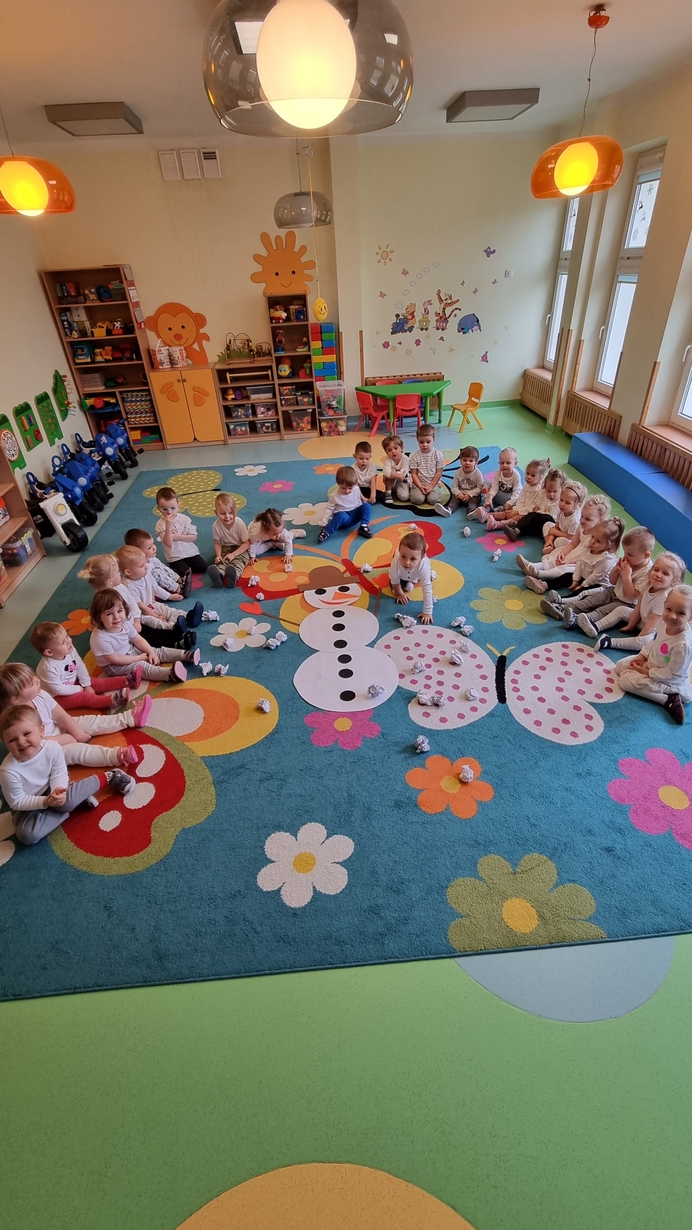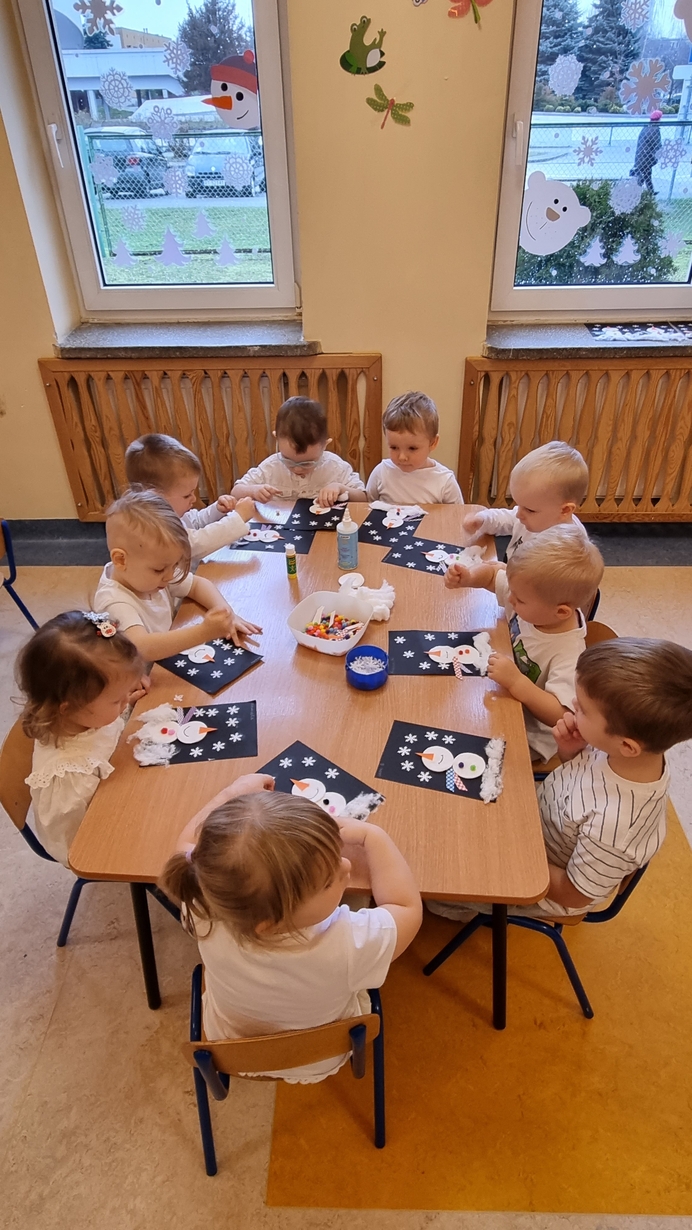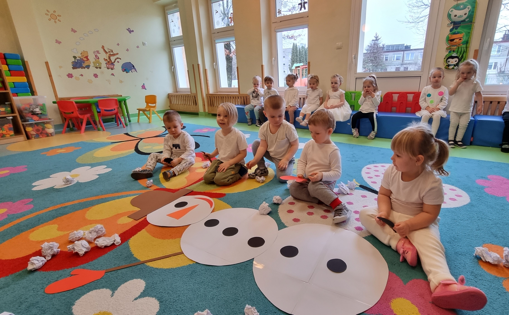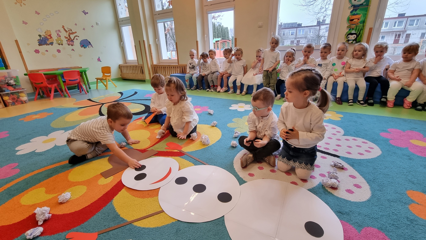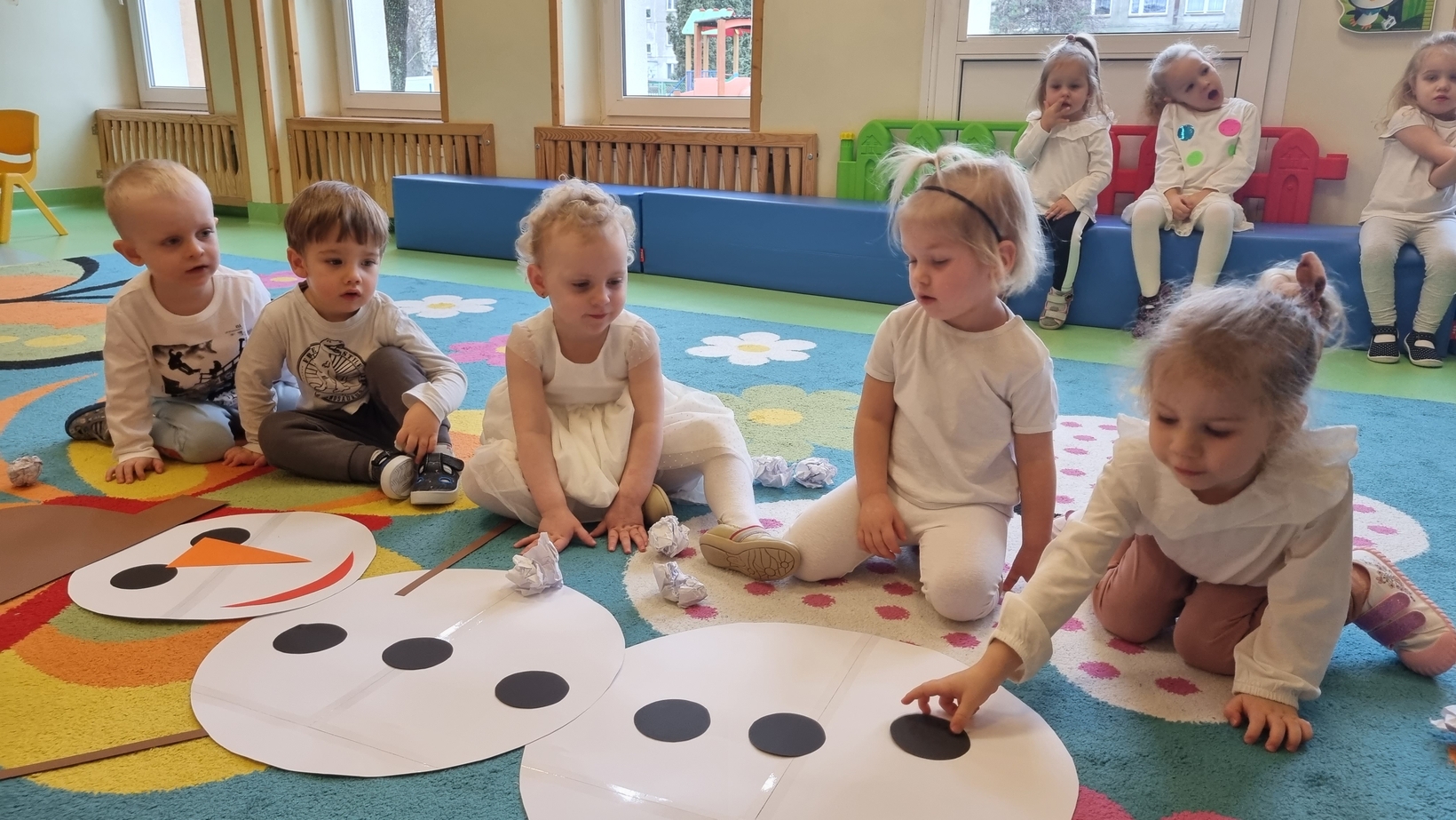 Dzisiaj w żłobku w grupie Pszczółek obchodziliśmy "Dzień Bałwana". Był to dzień wyjątkowy - bałwankowy. Dzieci ubrane były w bluzeczki koloru białego symbolizujące biały śnieg. Była to idealna okazja do zorganizowania dzieciom zabaw tematycznych takich jak: rzucanie papierowymi śnieżkami oraz układaliśmy dużego Bałwana. Dzieci także zaśpiewały wspólnie piosenkę o Bałwanie i nauczyły się wierszyka pt. "Ulepimy dziś Bałwana". Zwieńczeniem tego zimowego dnia była praca plastyczna - "Bałwanki nocą".