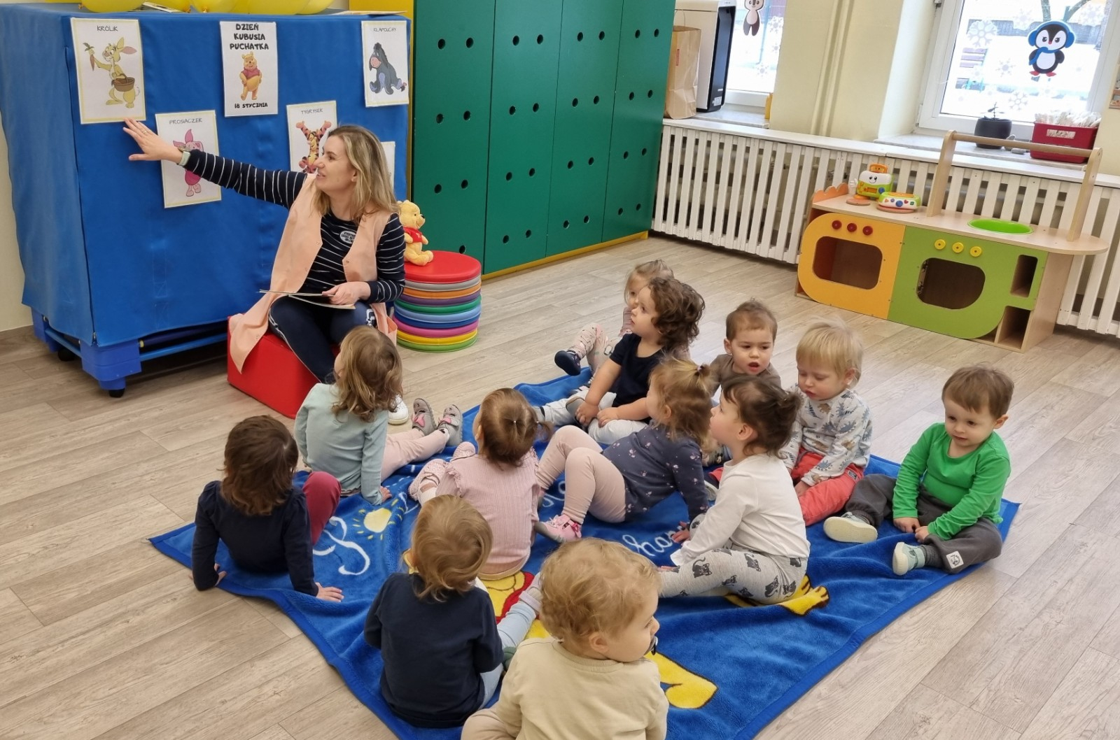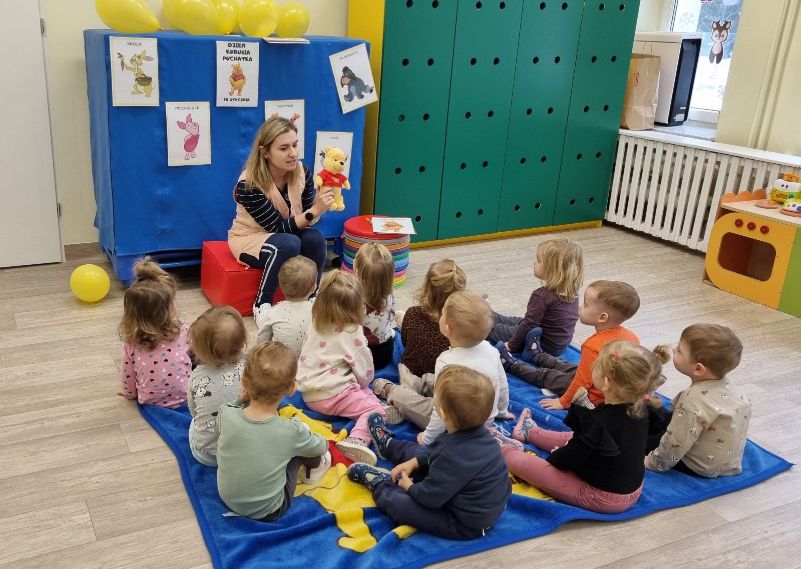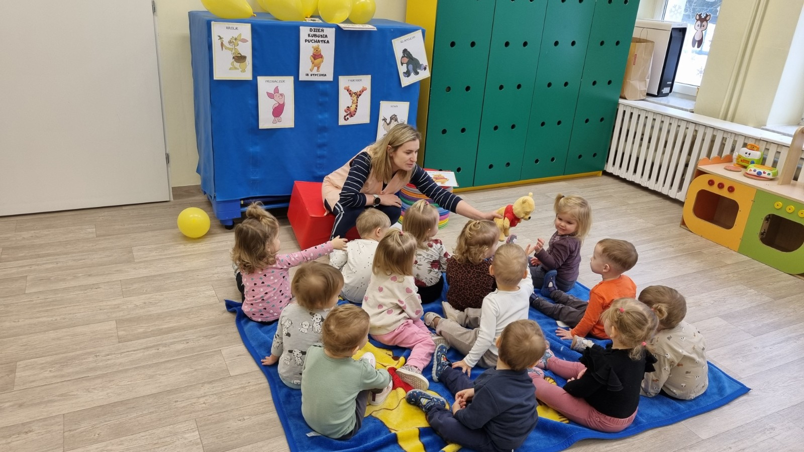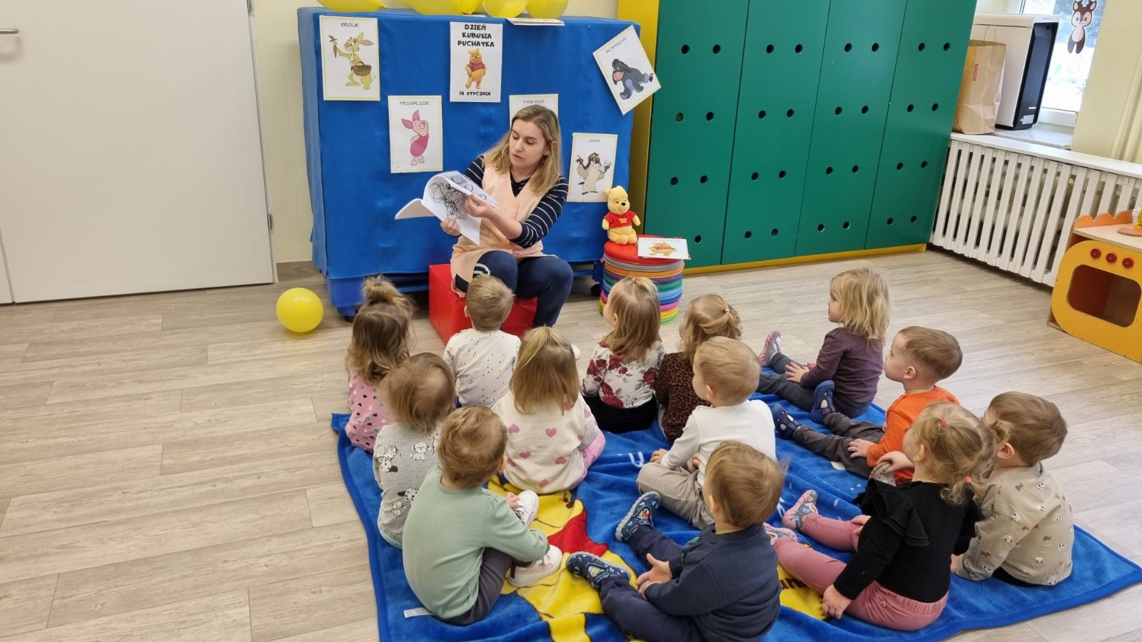 Zdjecia przedstawiają dzieci obchodzące dzień Kubusia Puchatka