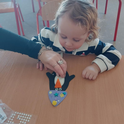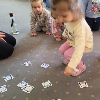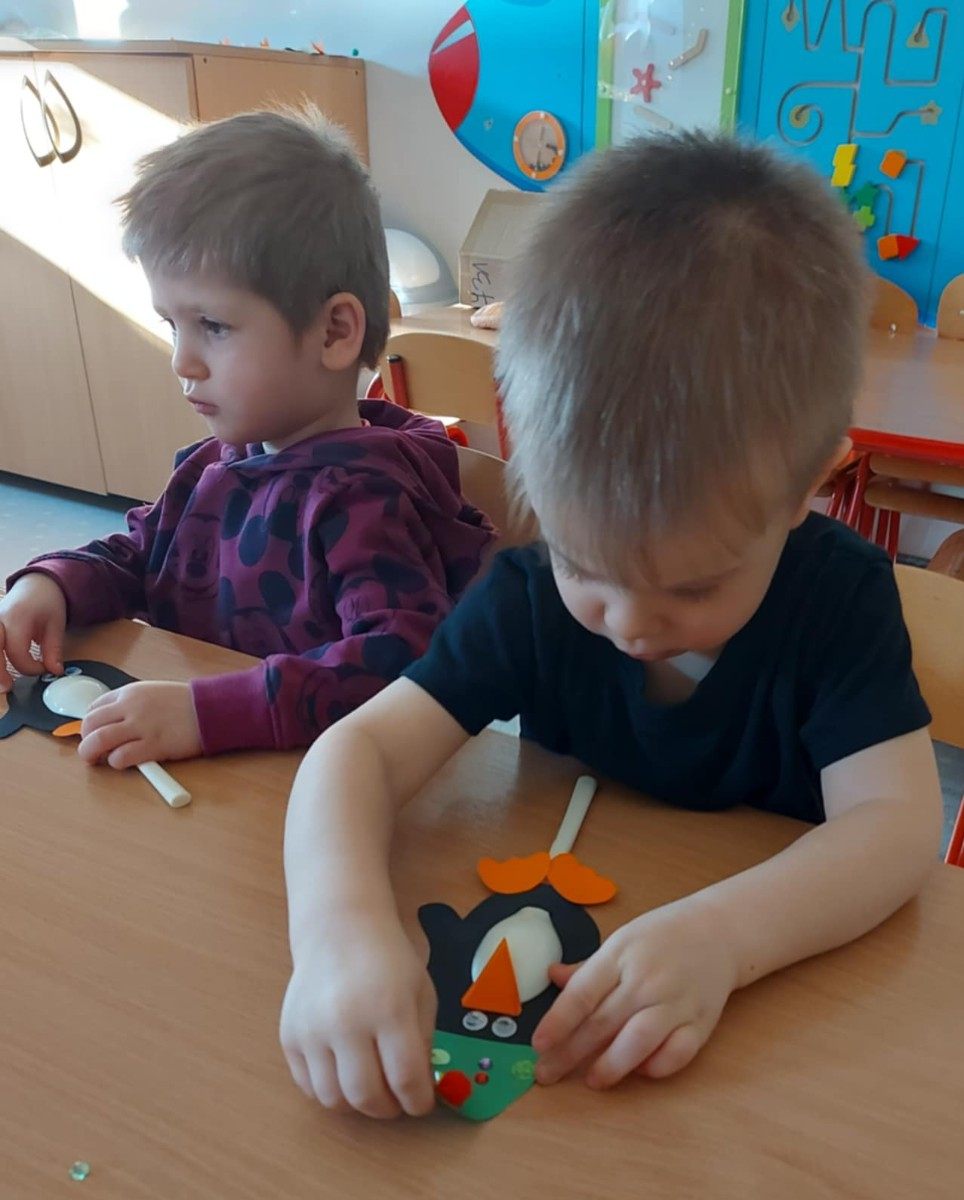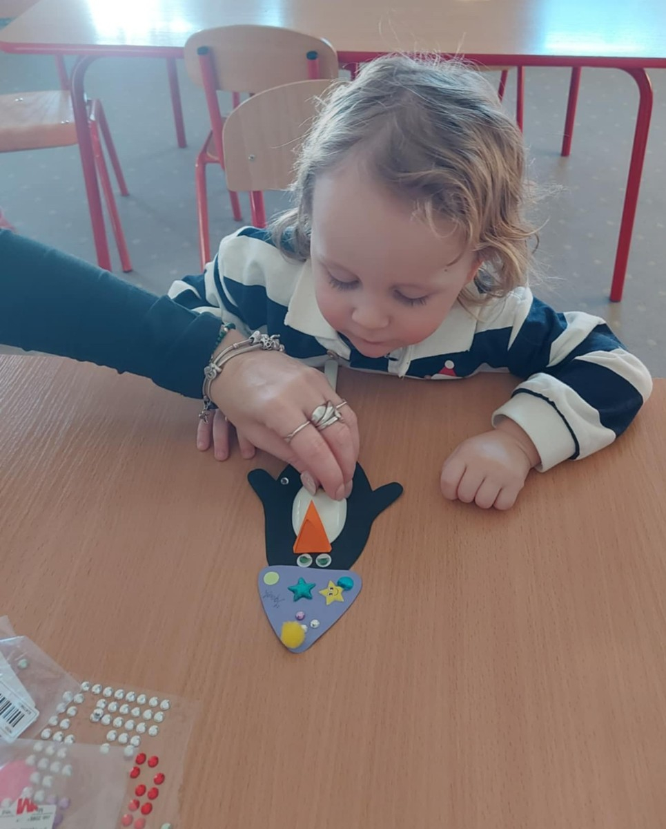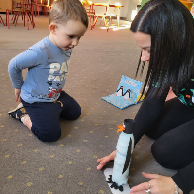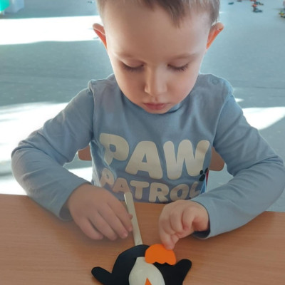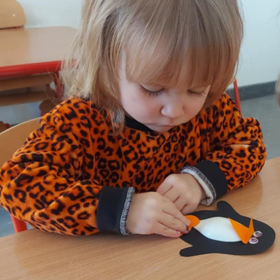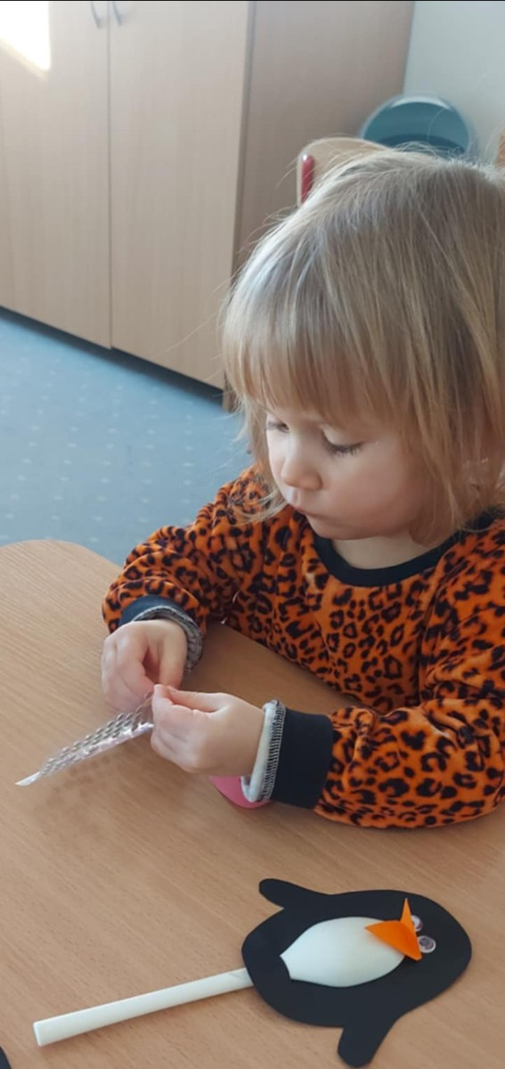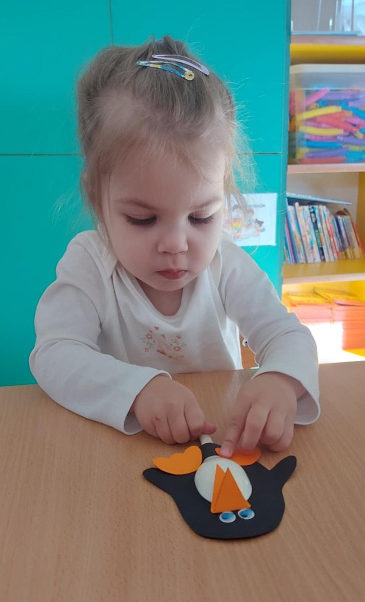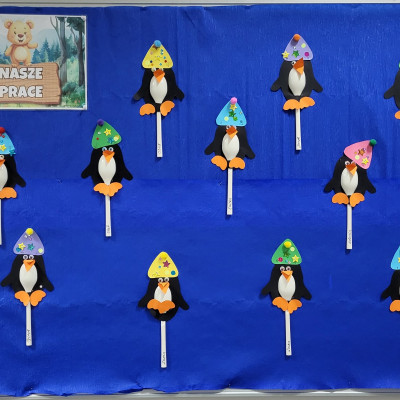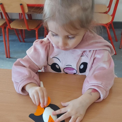 Dzień z pingwinkiem to super okazja do ćwiczenia motoryki dużej - chodzenie jak pingwin, kołysanie się na boki oraz leżenie na brzuszku i naśladowanie zjazdu z górki. Dzieci wykonały pracę plastyczną oraz pingwinka z butelki .