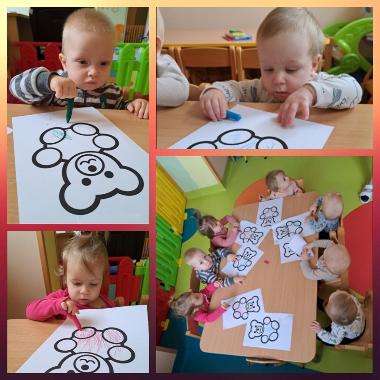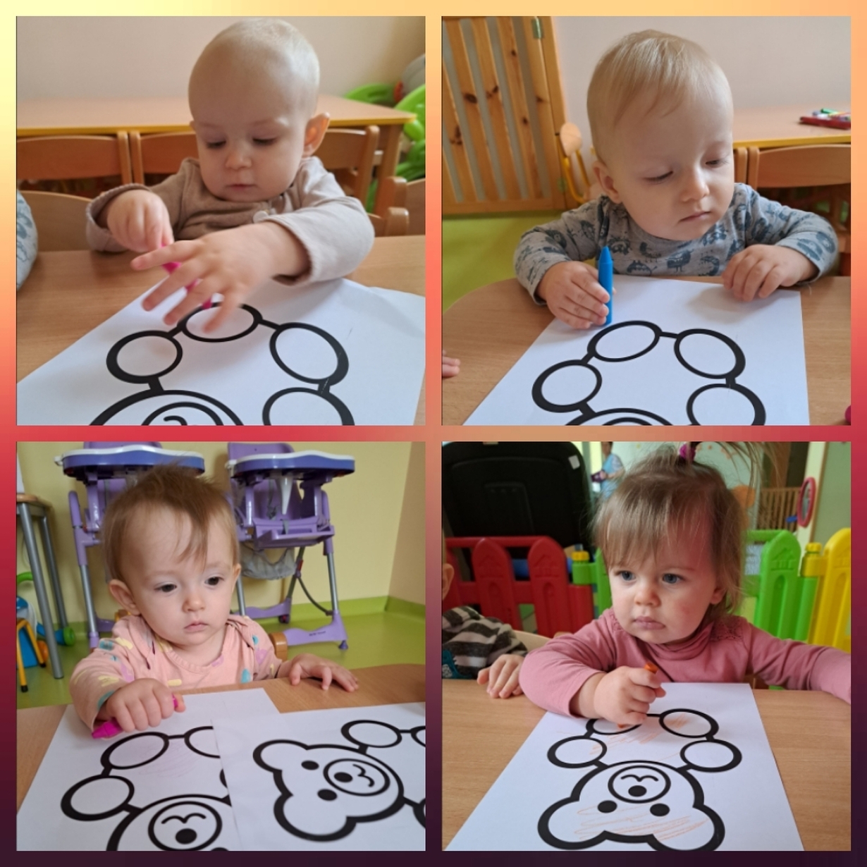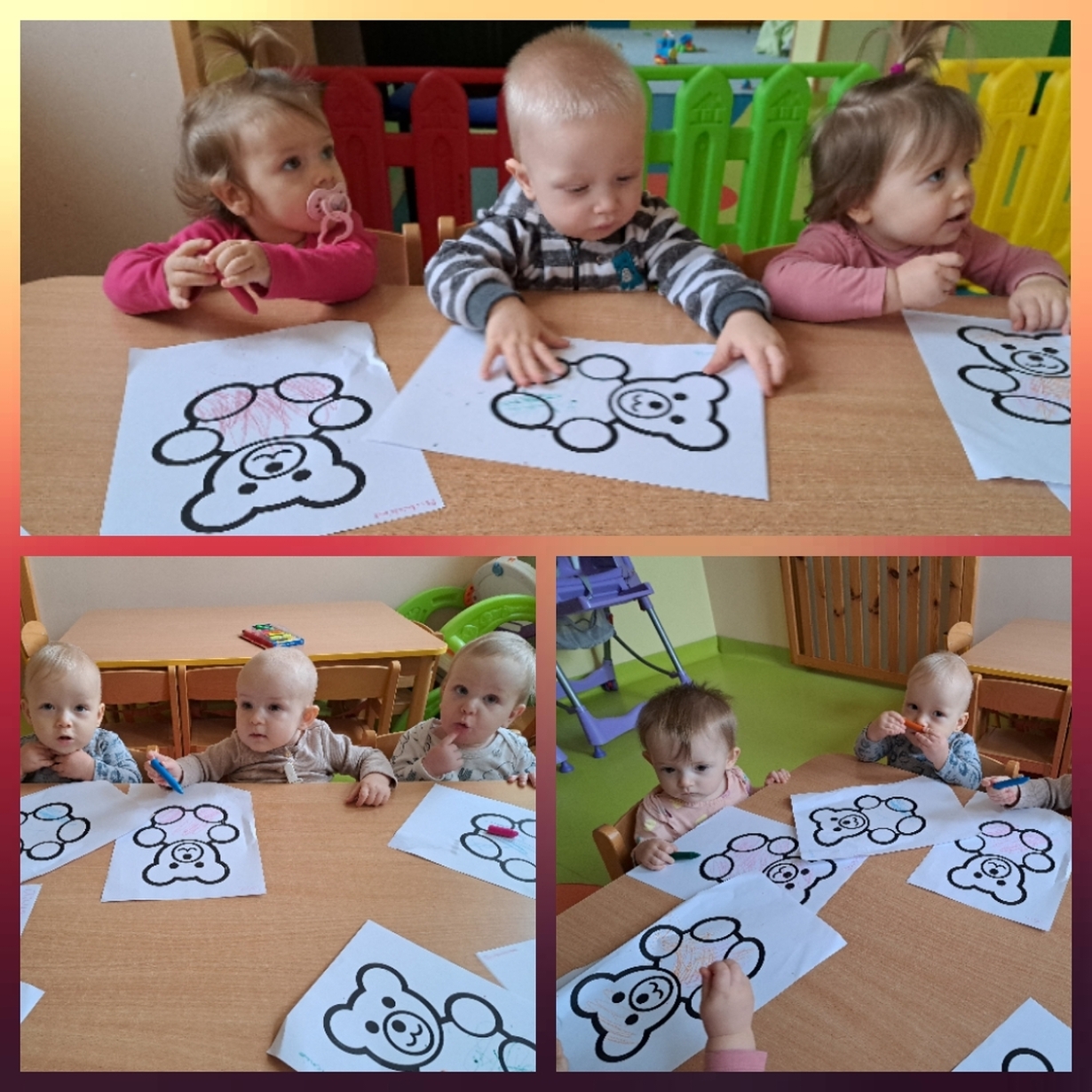A następnie rozpoczęły swoją przygodę plastyczną kolorując misie. Dzieci uczyły się trzymać odpowiednio w dłoni kredki oraz stawiać kreski i kółeczka.