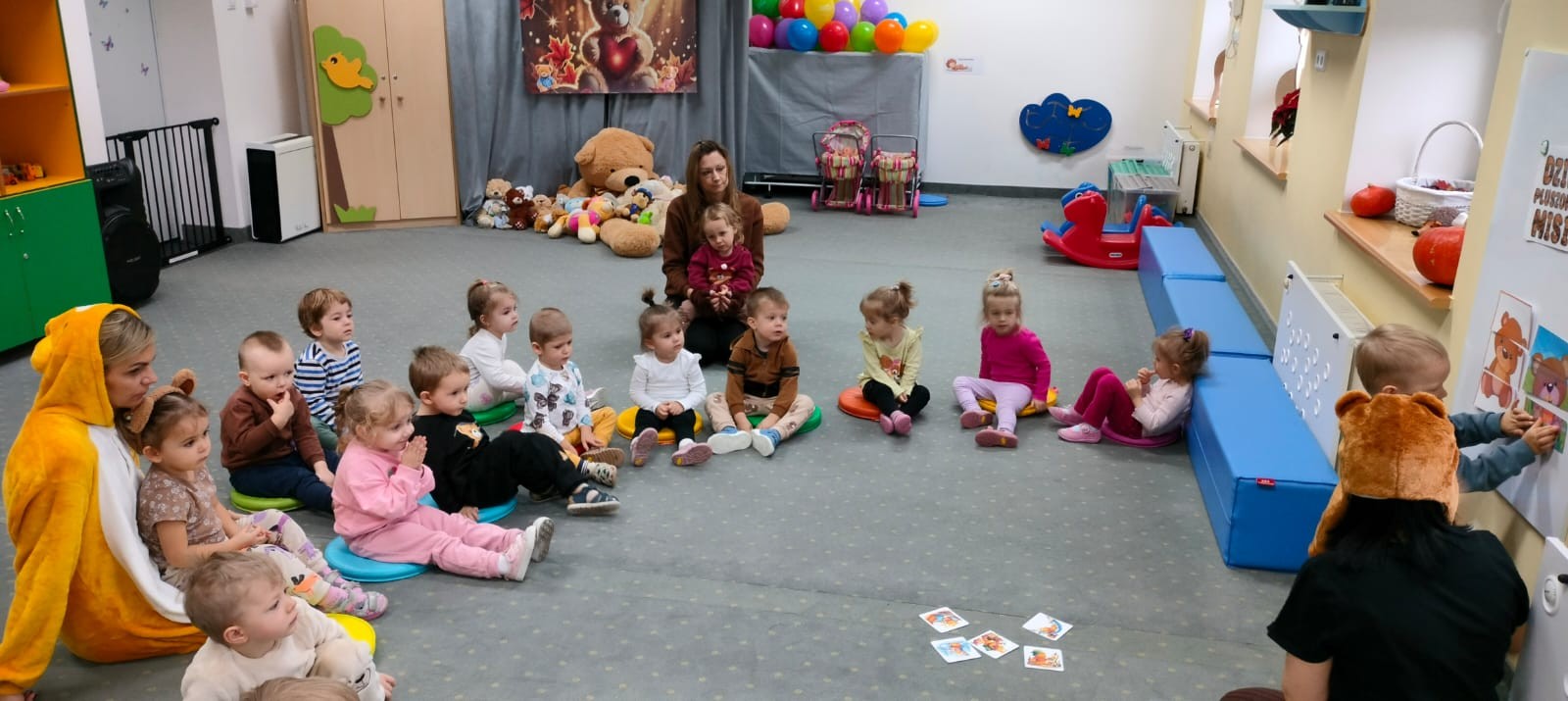 Zdjęcia przedstawiają dzieci podczas aktywności z misiami.