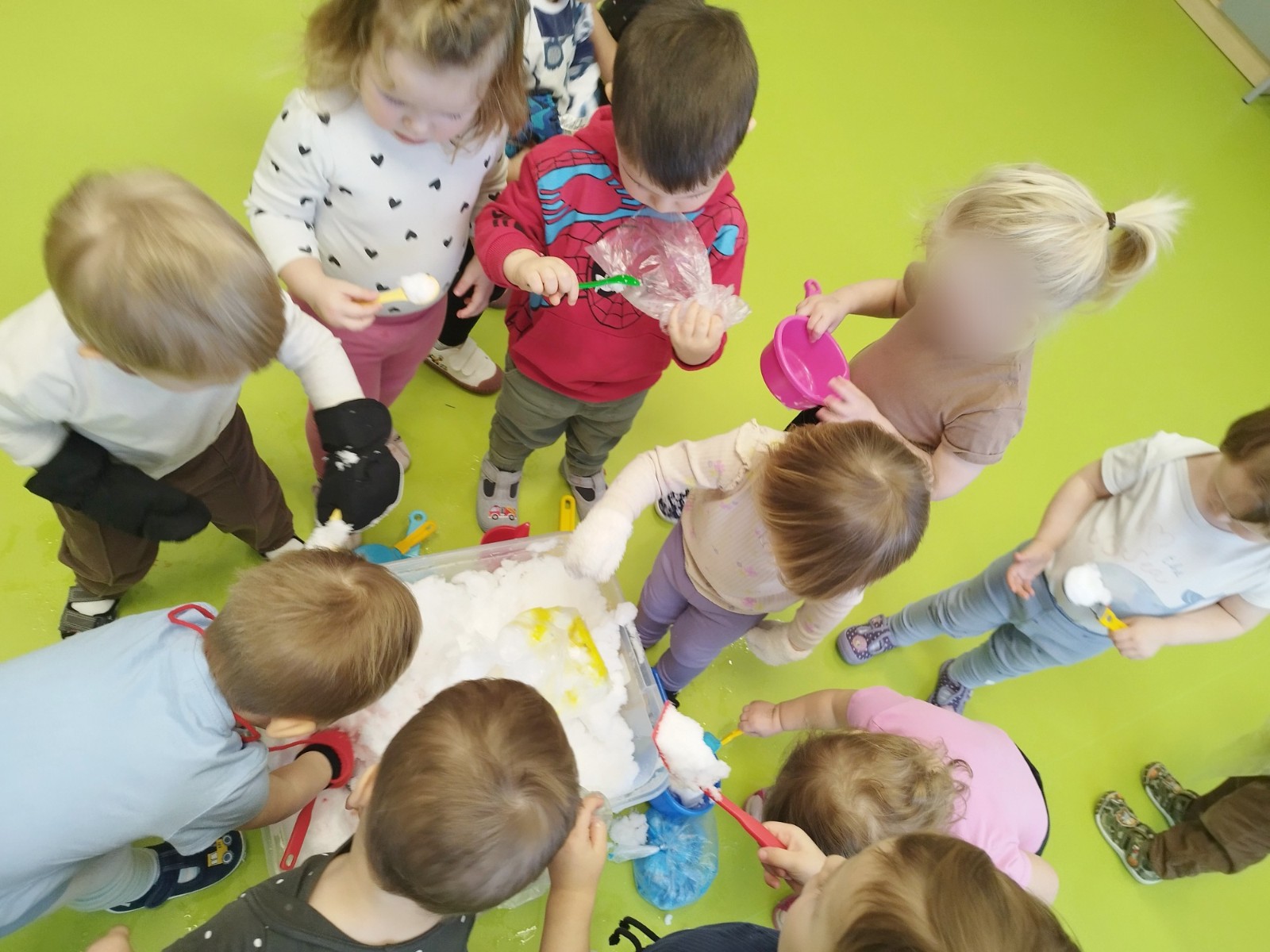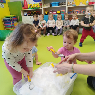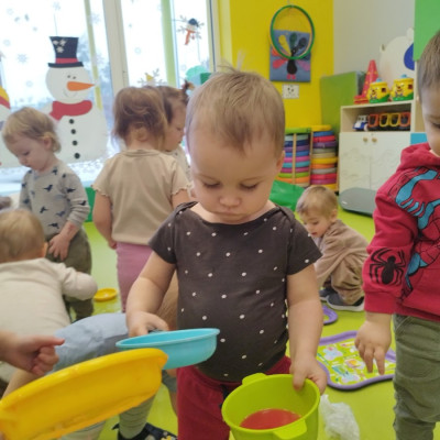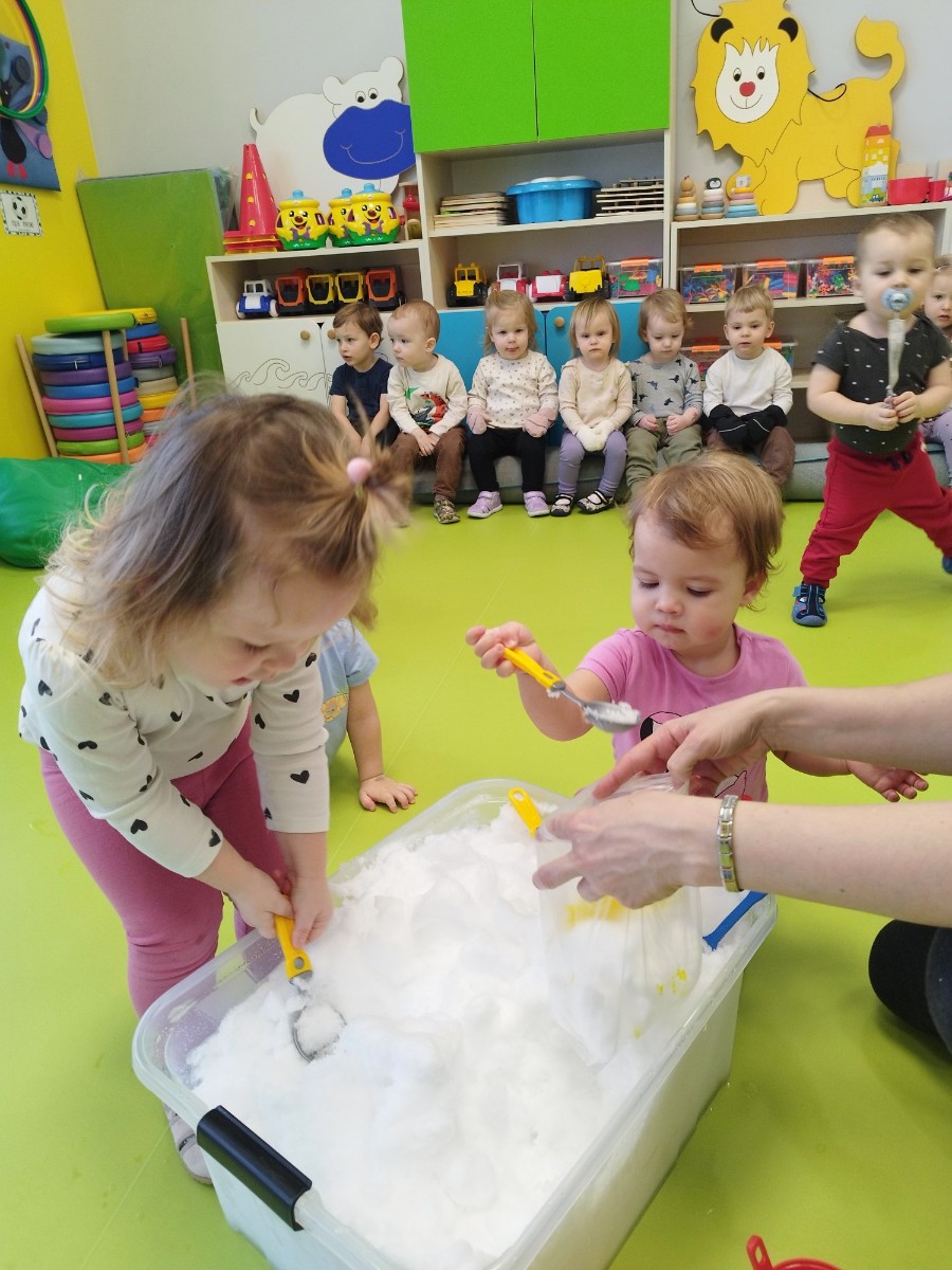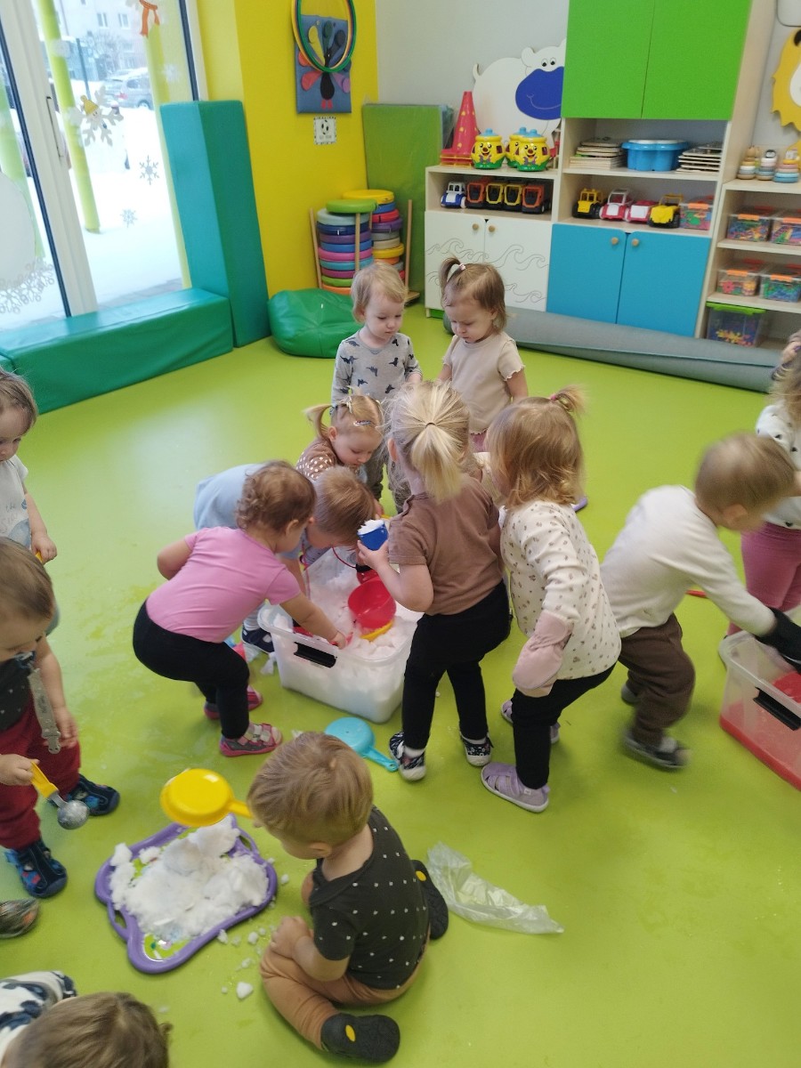 Przeprowadziliśmy ciekawe zajęcia sensoryczne, gdzie dzieci mogły zapoznać się ze strukturą śniegu oraz eksperyment ciepło-zimno. Dzieci wrzucały kulki śniegu do ciepłej wody obserwując ja topi się w niej śnieg. Bawiliśmy także śnieg na różne kolory.