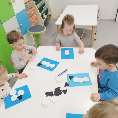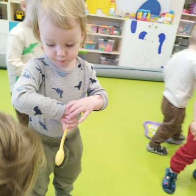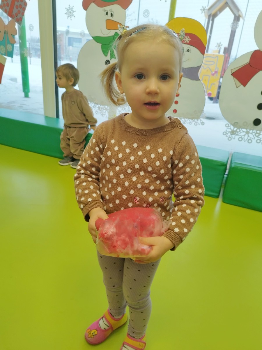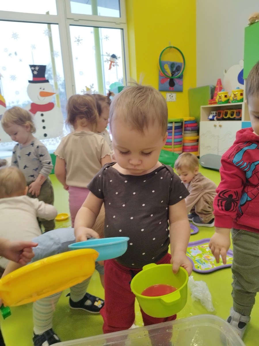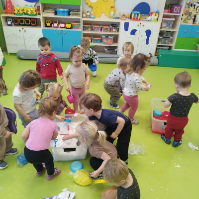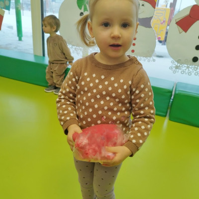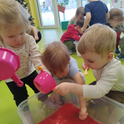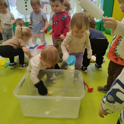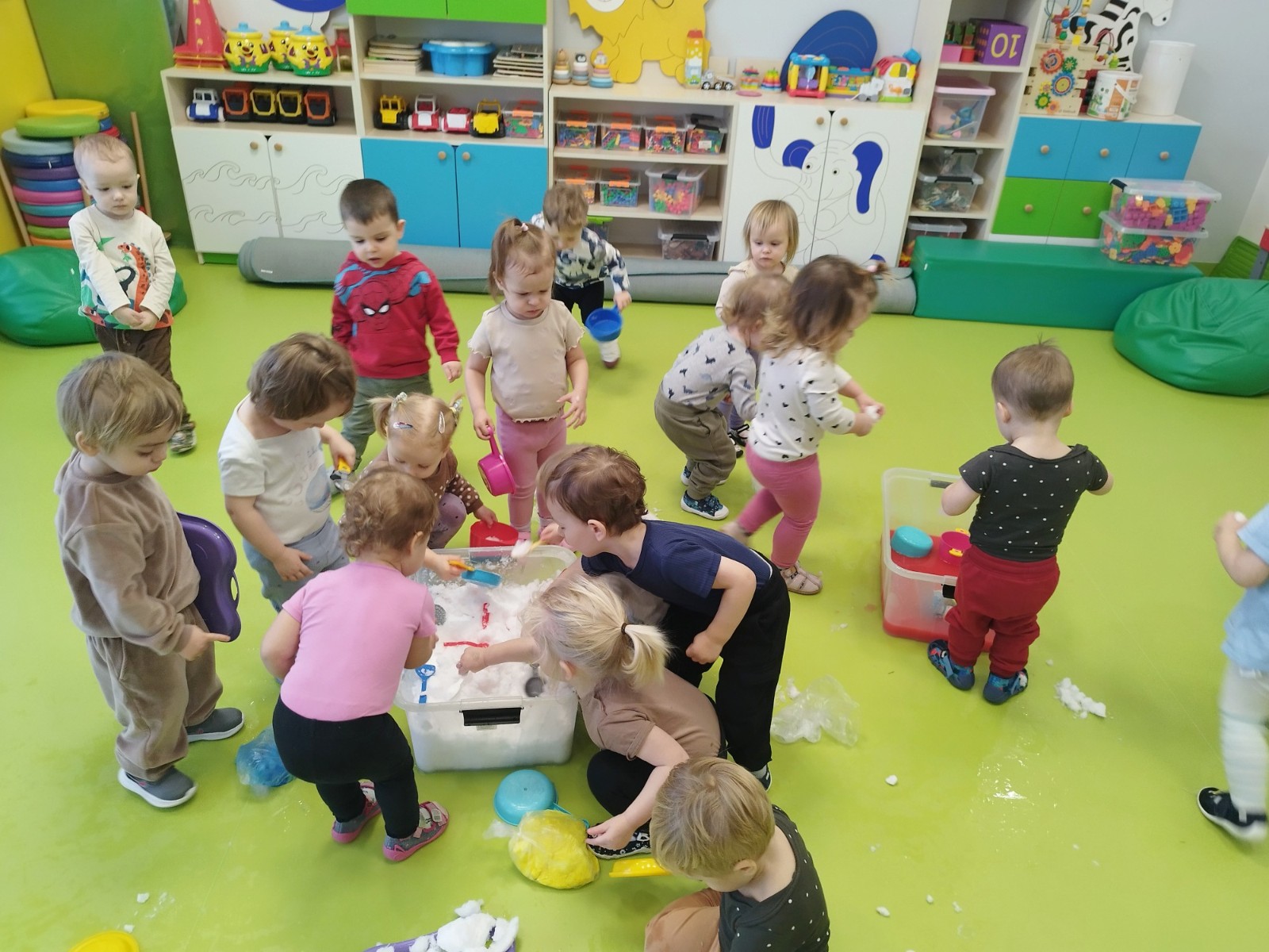 Przeprowadziliśmy ciekawe zajęcia sensoryczne, gdzie dzieci mogły zapoznać się ze strukturą śniegu oraz eksperyment ciepło-zimno. Dzieci wrzucały kulki śniegu do ciepłej wody obserwując ja topi się w niej śnieg. Bawiliśmy także śnieg na różne kolory.