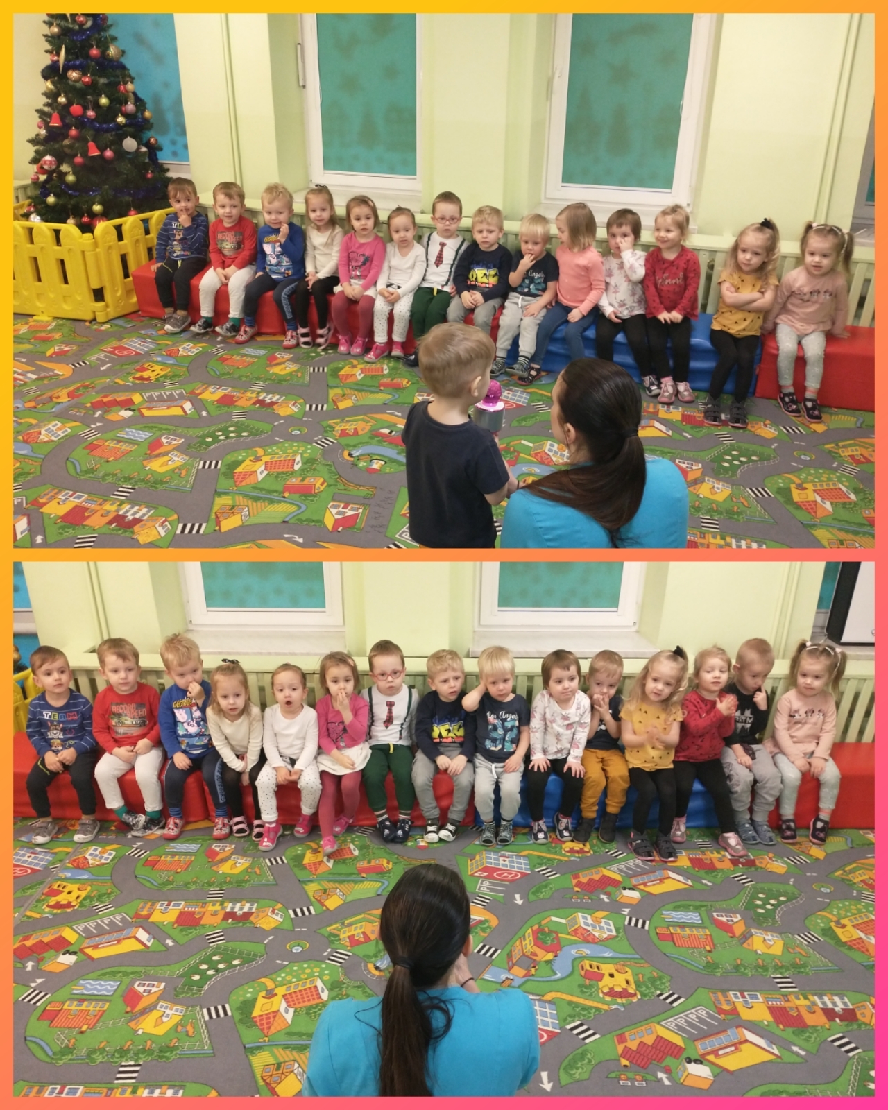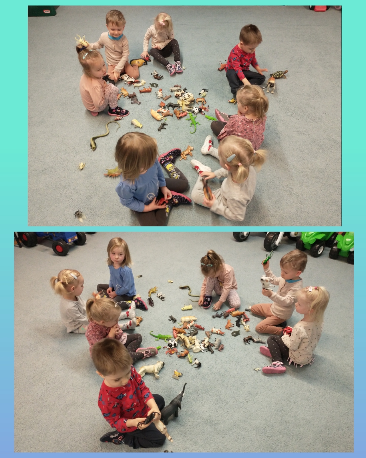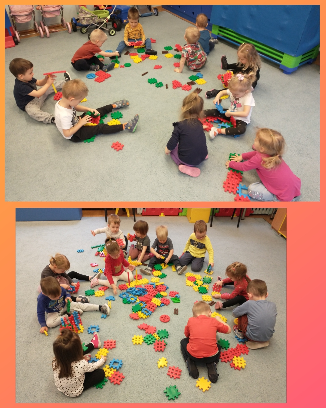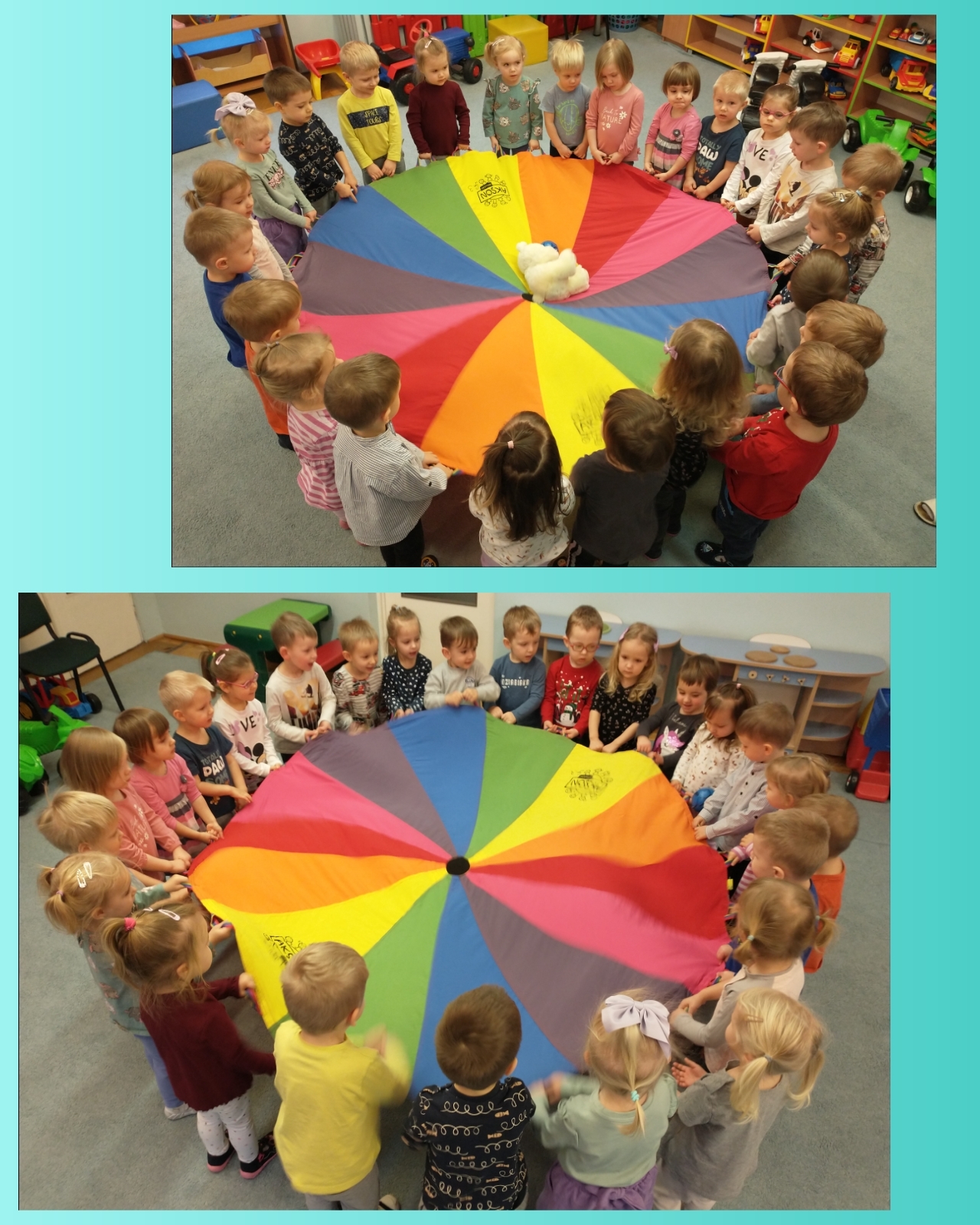Żabki uruchamiały swoją pomysłowość i przez zabawę z kółeczkami gimnastycznymi oraz chustą animacyjną ćwiczyły swoją sprawność motoryczną.
