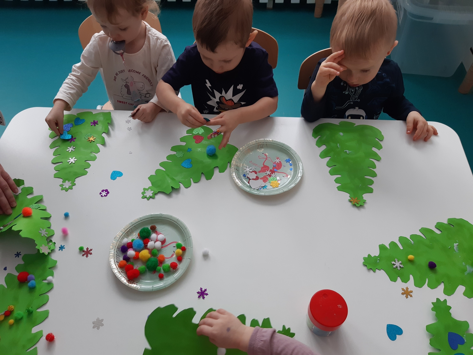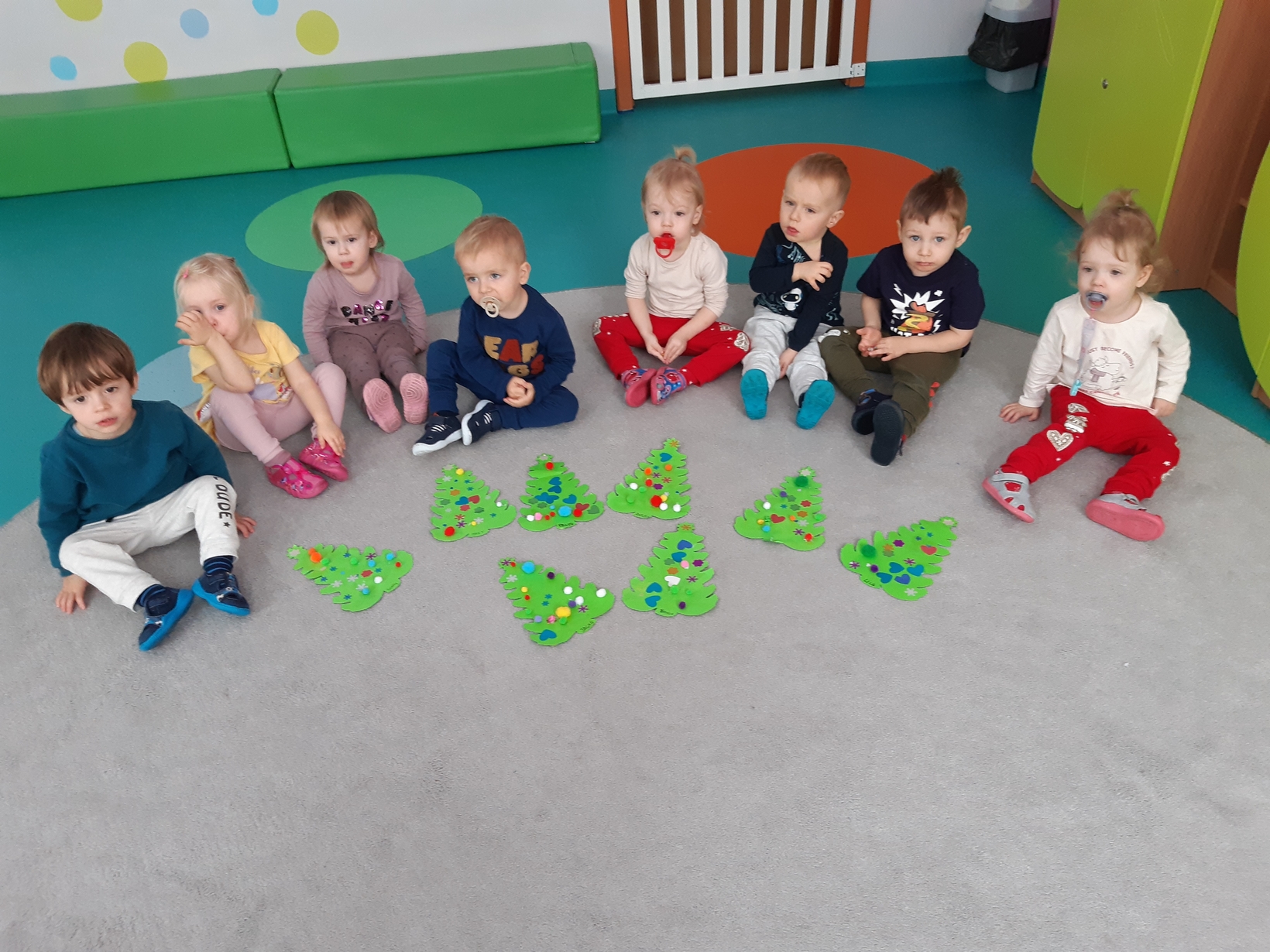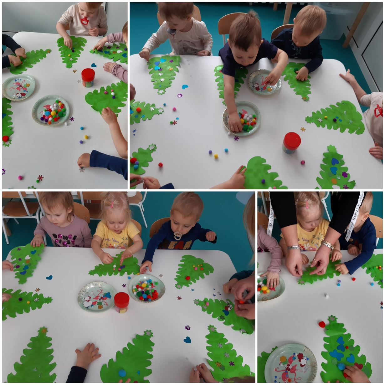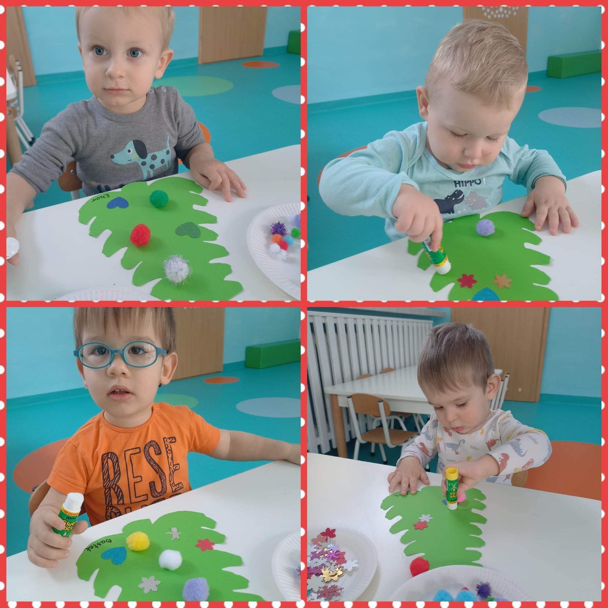 Także na grupie Żabki okres przedświąteczny okazał się czasem intensywnych przygotowań do świąt . W ramach zajęć panie opiekunki na tej grupie starały się zaznajomić dzieci z bożonarodzeniowymi tradycjami i obyczajami. Dzieci z tej grupy wykonały pracę plastyczną której tematem była świąteczna choinka oraz kolorową bombę, którą doklejały do przygotowanych kartek świątecznych. Do wykonania tych prac dzieci wykorzystały plastelinę, cekiny, brokat, kolorowe kuleczki .