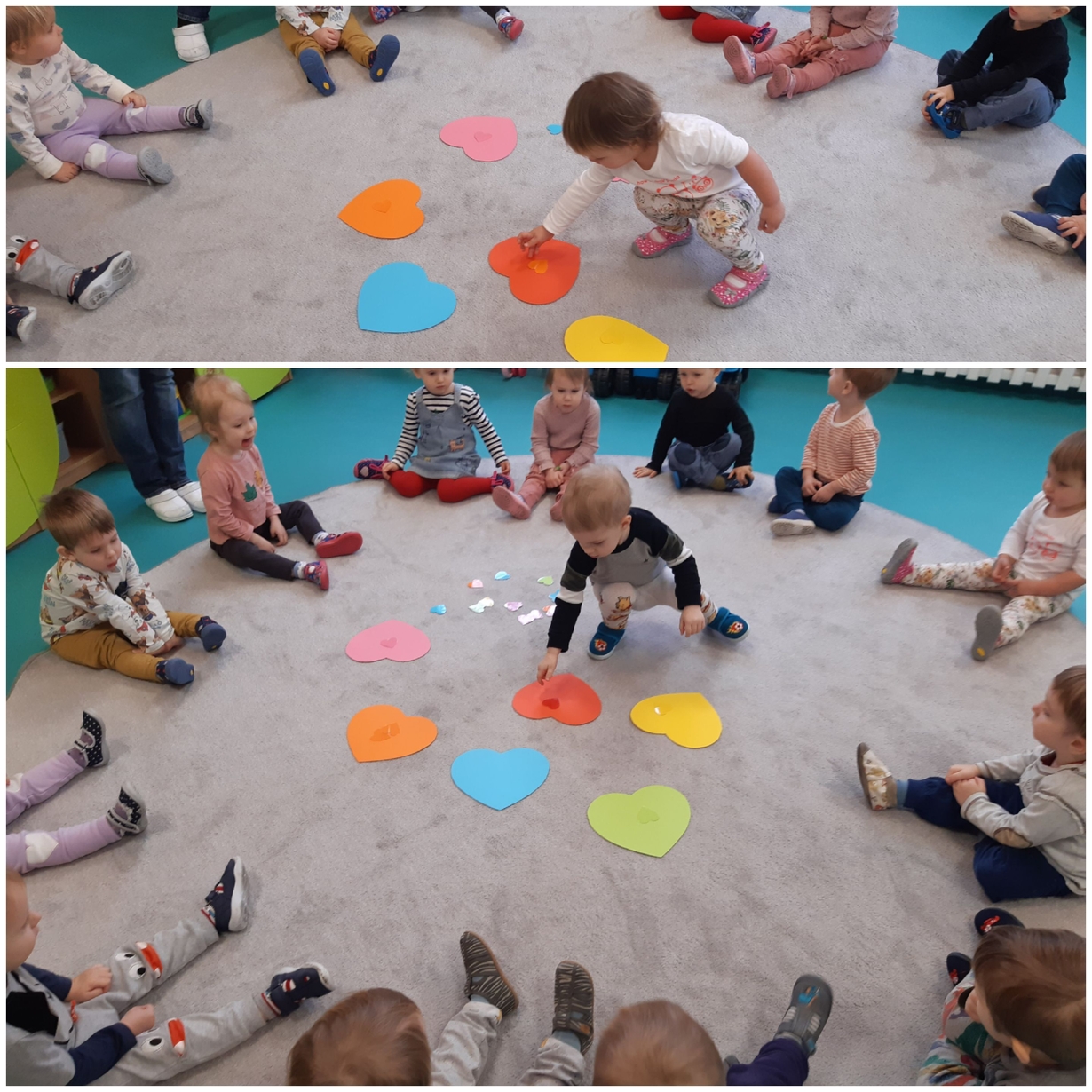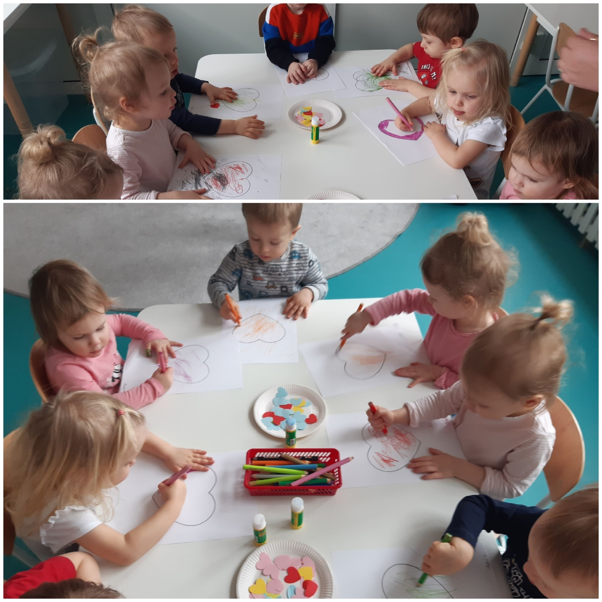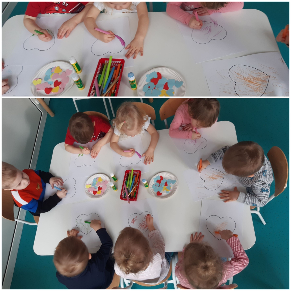 Dziś 14 lutego na grupie Żabki obchodziliśmy Walentynki. Tuż po śniadaniu w ramach pogadanki dzieci poznały tradycje walentynkowe oraz dowiedziały się jak ważne jest okazywanie uczuć przyjażni i sympatii. Później nadszedł czas na przypomnienie sobie podstawowych kolorów poprzez dopasowywanie malutkich serduszek do odpowiadających im kolorów. Nasze Żabki wykonały także pracę plastyczną związaną z tematyką tego święta a mianowicie kolorowały kredkami oraz przyklejały kolorowe serduszka. Po zajęciach nadszedł czas na wspólną zabawę z chustą animacyjną oraz tańce przy piosenkach,,Walentynki, walentynki..", ,,Mała Ulijanko..." oraz pamiątkowe zdjęcia.