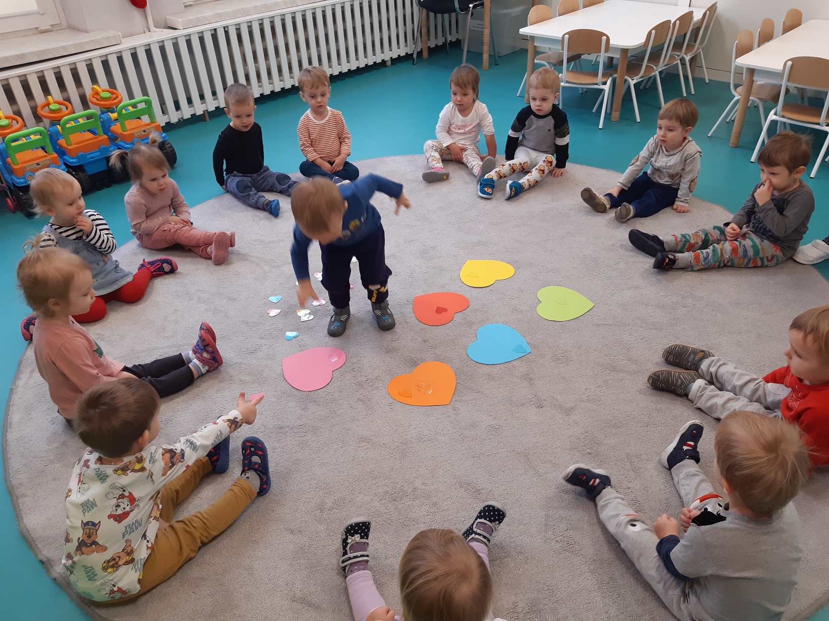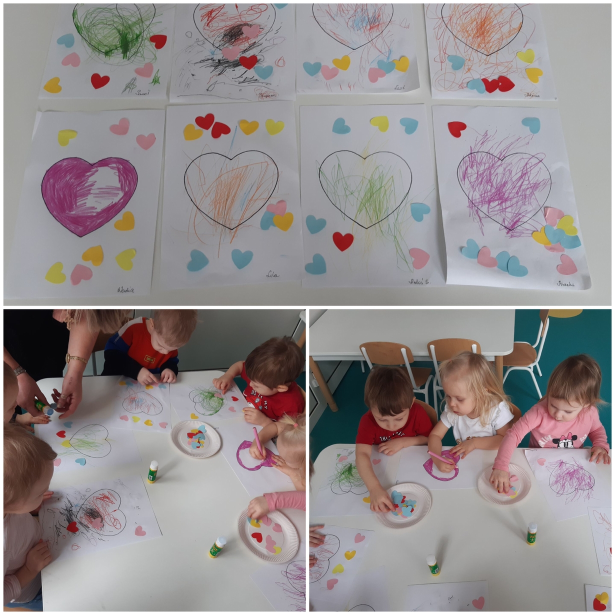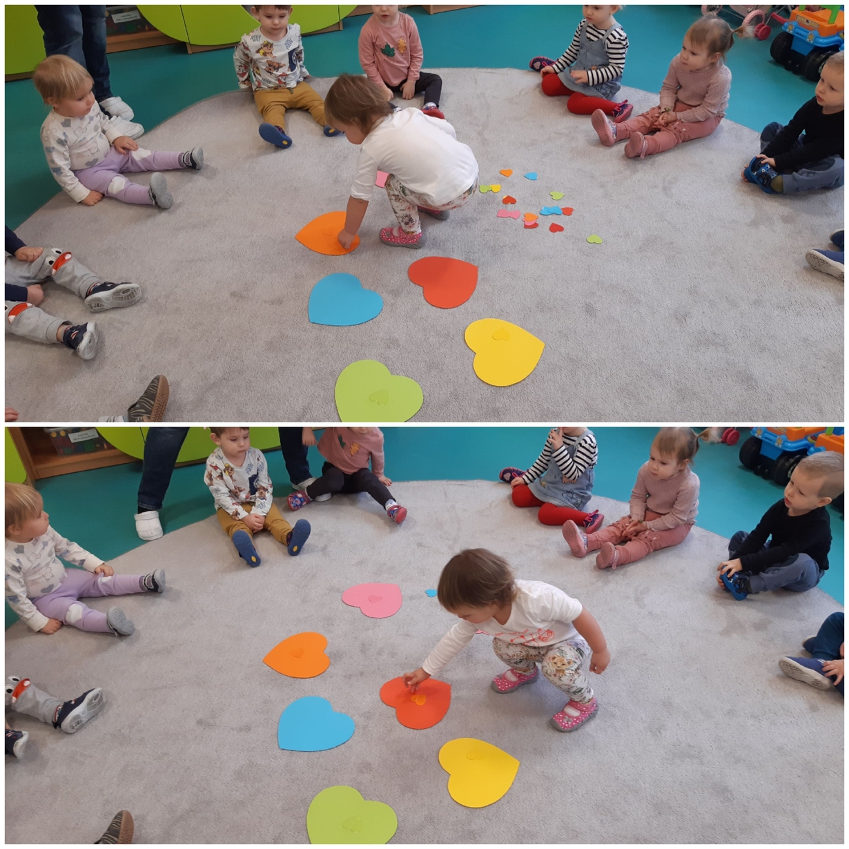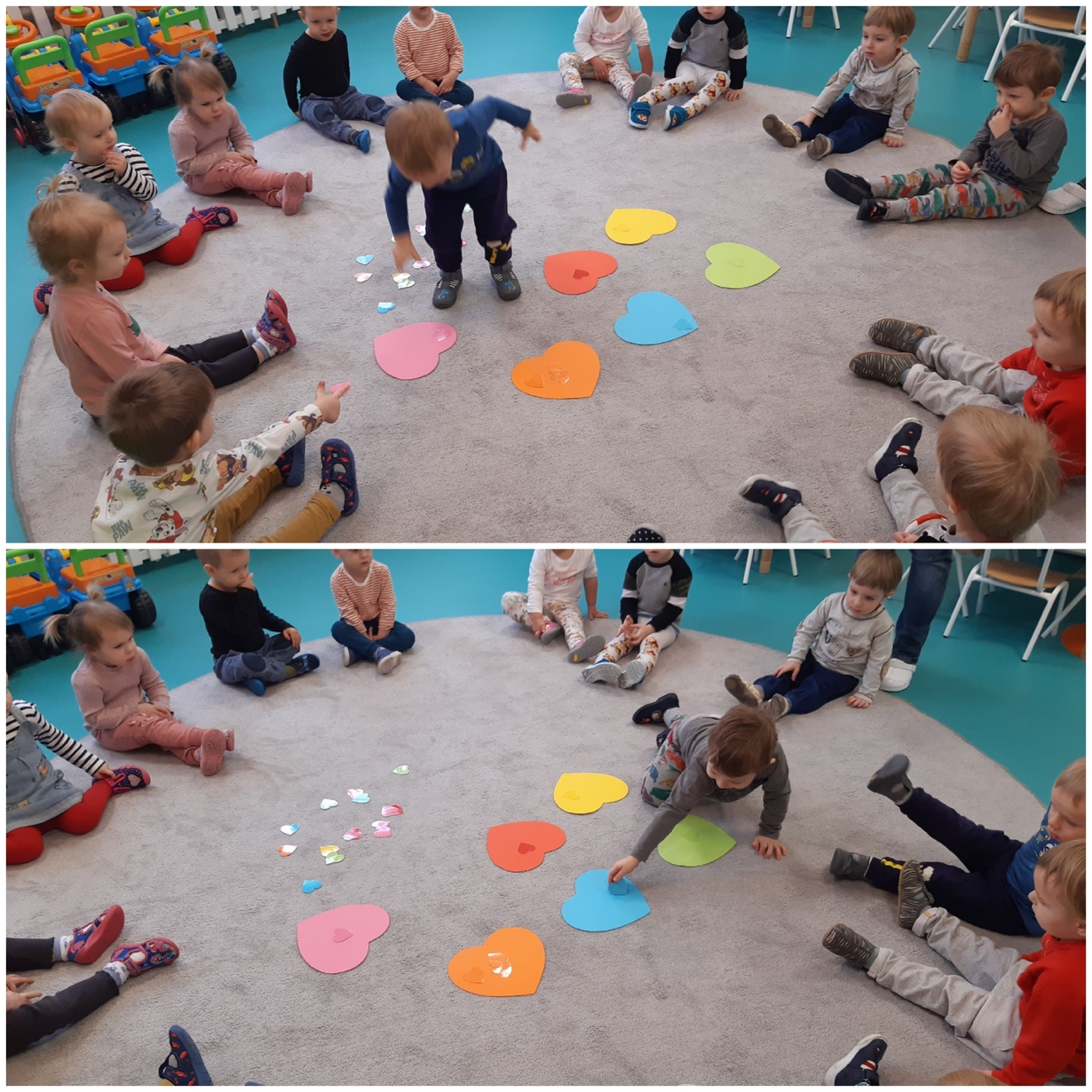 Dziś 14 lutego na grupie Żabki obchodziliśmy Walentynki. Tuż po śniadaniu w ramach pogadanki dzieci poznały tradycje walentynkowe oraz dowiedziały się jak ważne jest okazywanie uczuć przyjażni i sympatii. Później nadszedł czas na przypomnienie sobie podstawowych kolorów poprzez dopasowywanie malutkich serduszek do odpowiadających im kolorów. Nasze Żabki wykonały także pracę plastyczną związaną z tematyką tego święta a mianowicie kolorowały kredkami oraz przyklejały kolorowe serduszka. Po zajęciach nadszedł czas na wspólną zabawę z chustą animacyjną oraz tańce przy piosenkach,,Walentynki, walentynki..", ,,Mała Ulijanko..." oraz pamiątkowe zdjęcia.