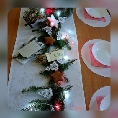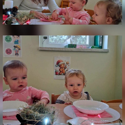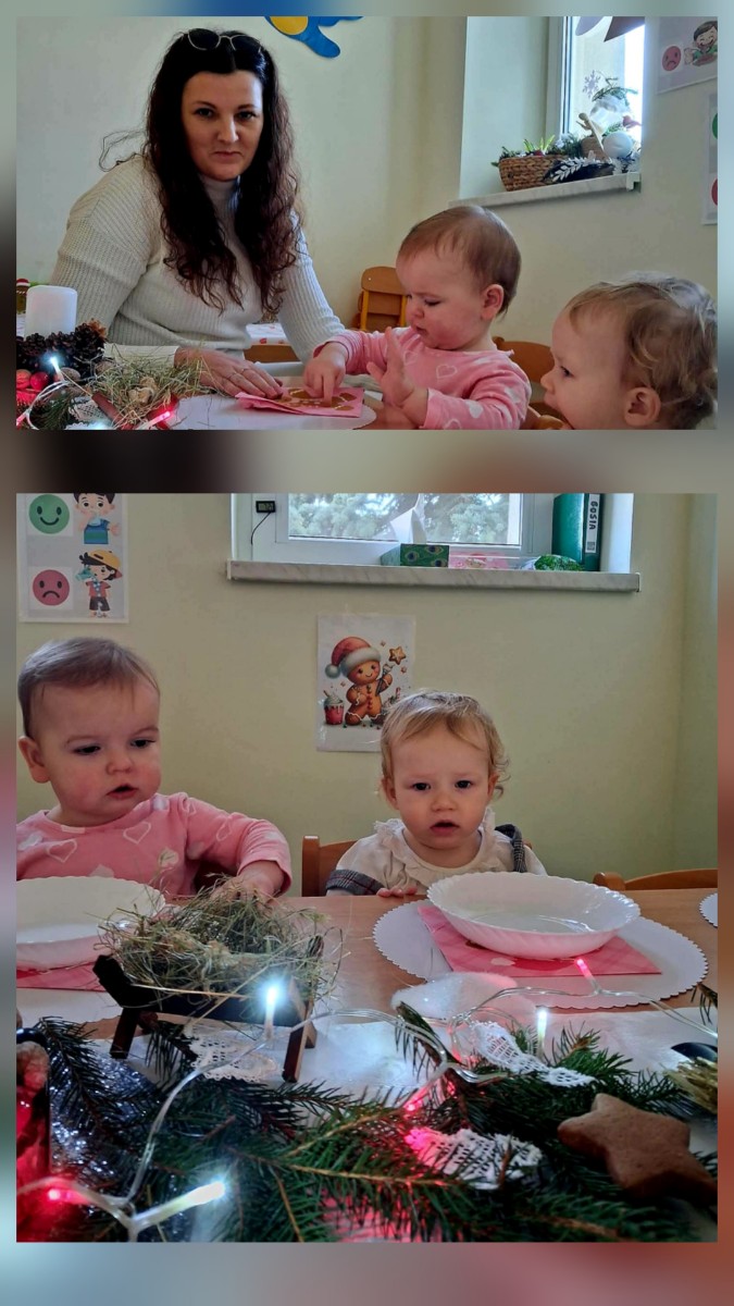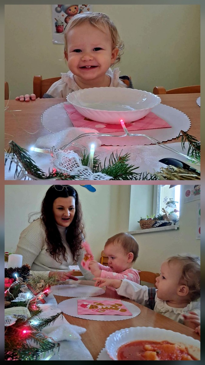 Maluszki poznawaly tradycje Świąt. Ciocie przygotowaly stół z białym obrusem, były pierogi i pyszny czerwony barszczyk.