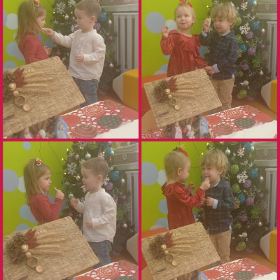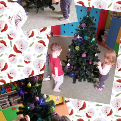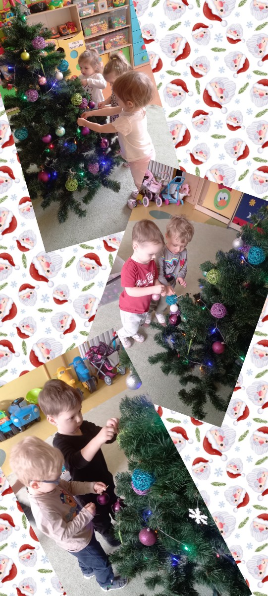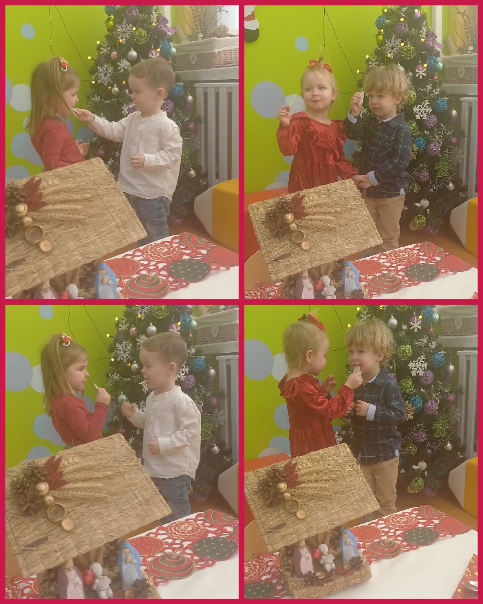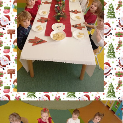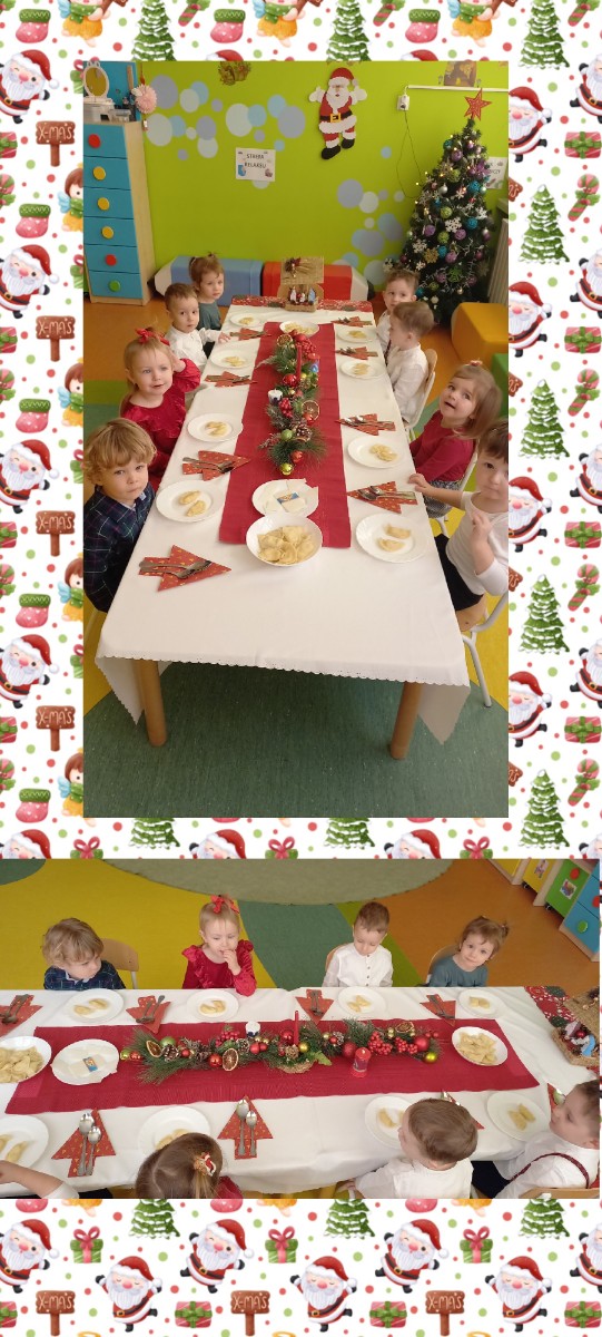 Z wielką radością dzieci wspólnie ubierały choinkę, zawieszając kolorowe bombki i różnorodne błyskotki. Następnie z zaangażowaniem pomagały w nakrywaniu do stołu, przygotowując wszystko do wigilijnego posiłku. Po tych przygotowaniach, wszyscy razem zasiedli do posiłku, ciesząc się wspólnym jedzeniem. Na koniec, w pięknej, świątecznej atmosferze, radośnie zaśpiewały ulubione kolędy.