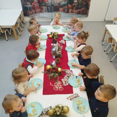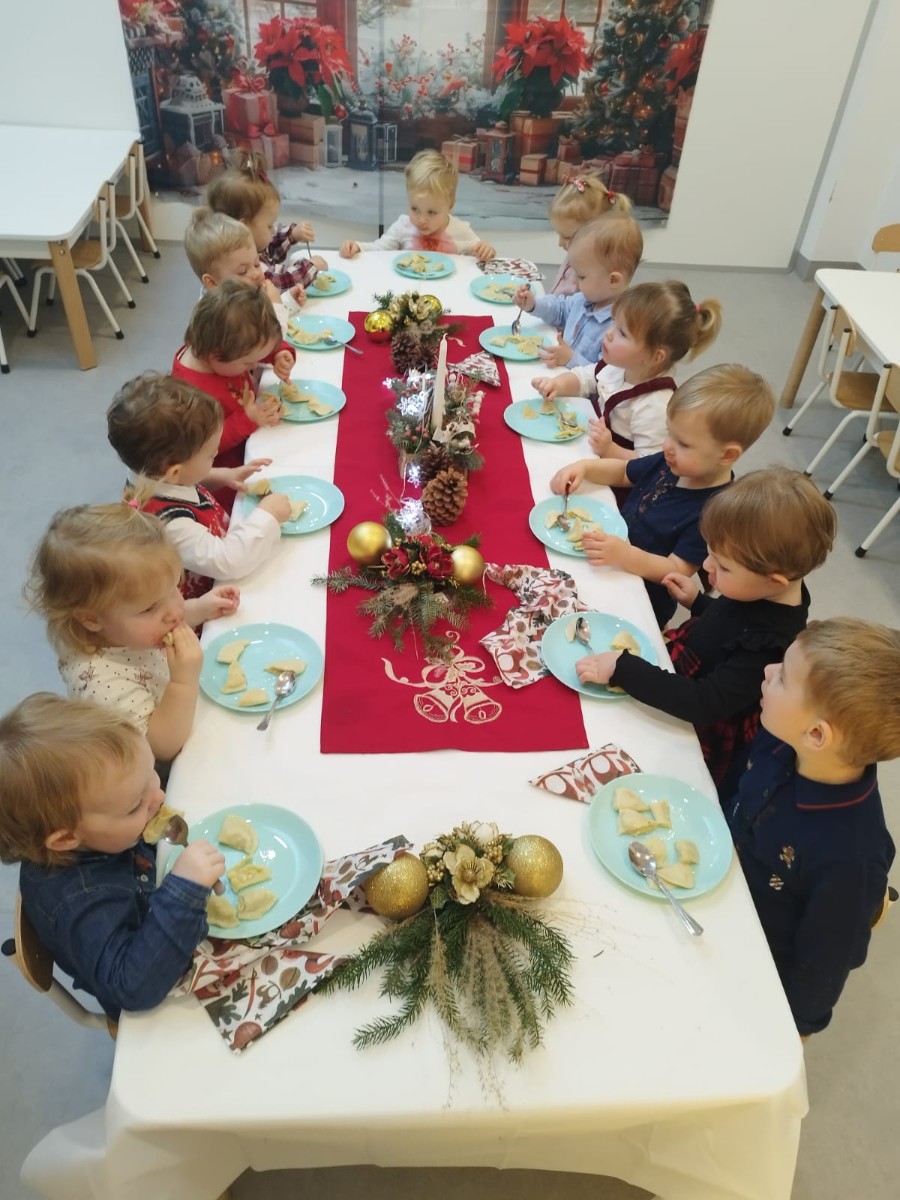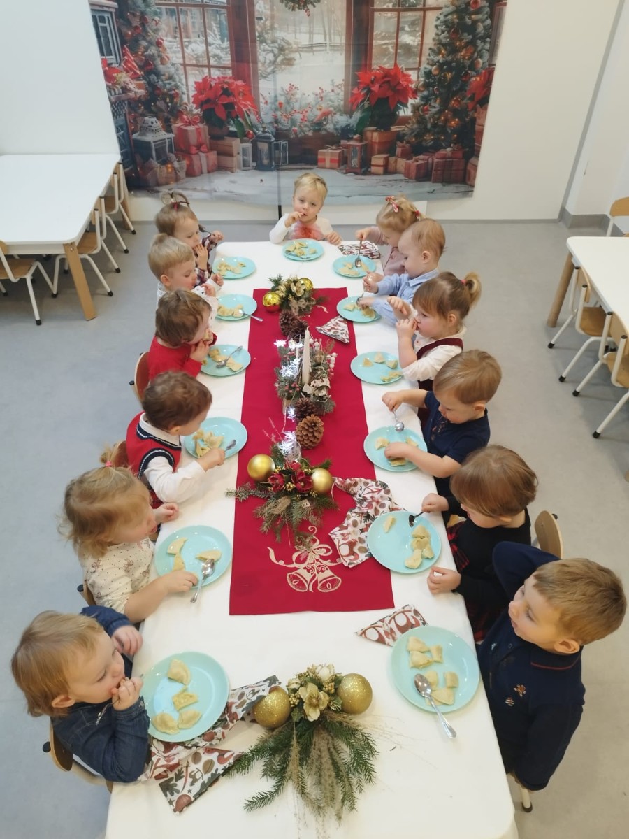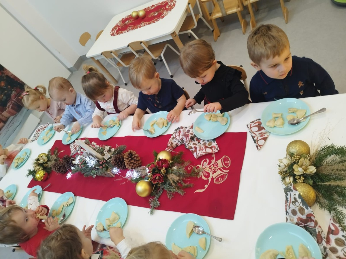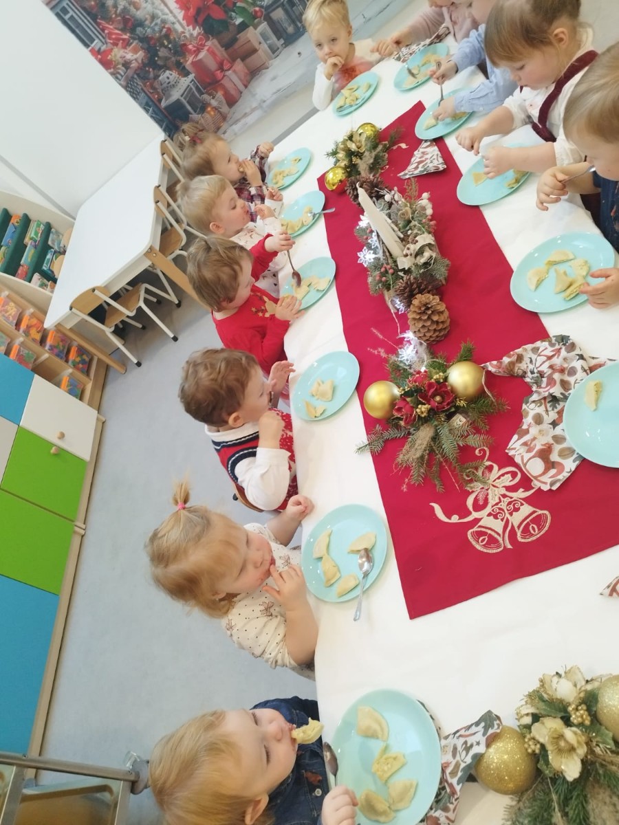19 grudnia w grupie Tygryski odbyła się wigilia. Tego dnia dzieci przyszły pięknie wystrojone. Cały ranek panowała świąteczna atmosfera oczekiwania, a w tle słychać było kolędy. Dzieci pomogły ciociom nakryć i przystroić wigilijny stół. A gdy nadszedł czas Tygryski zasiadły do stołu, gdzie pojawił się tradycyjny barszczyk czerwony i pierogi, które dzieci zjadły ze smakiem.