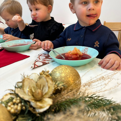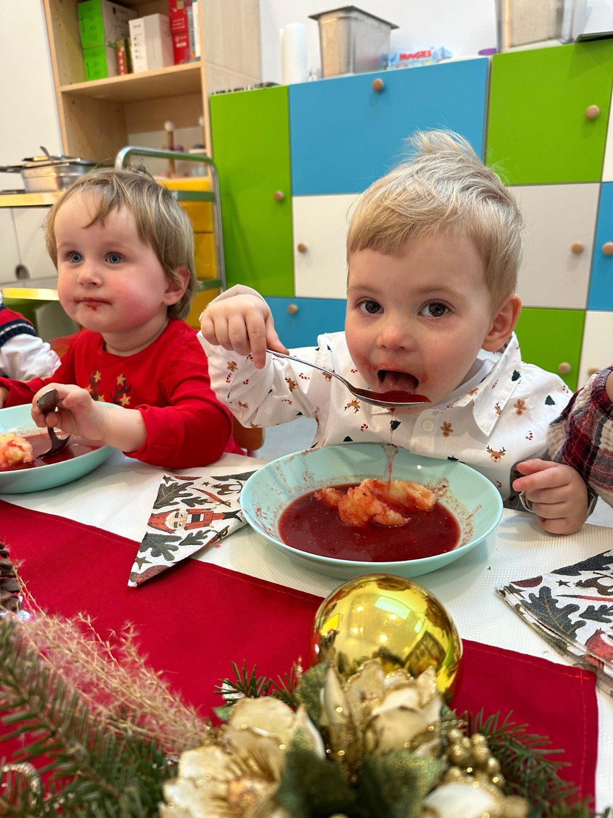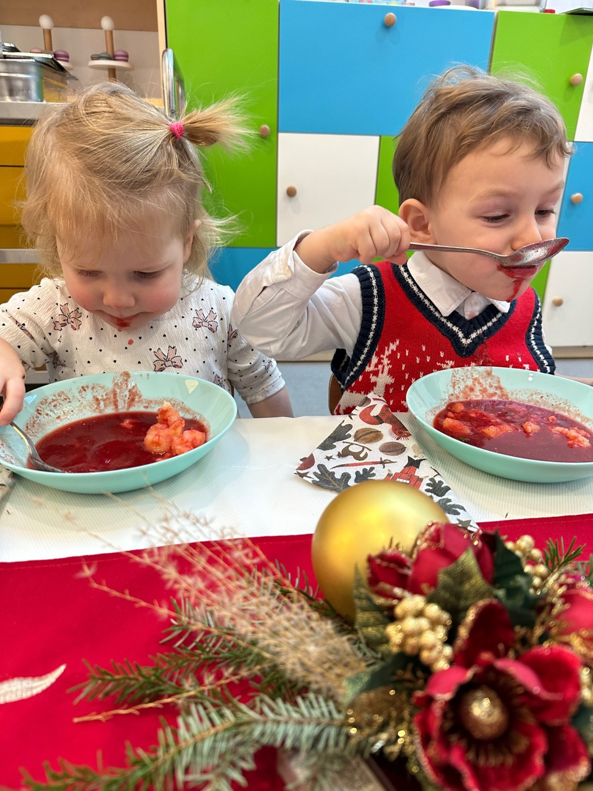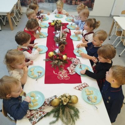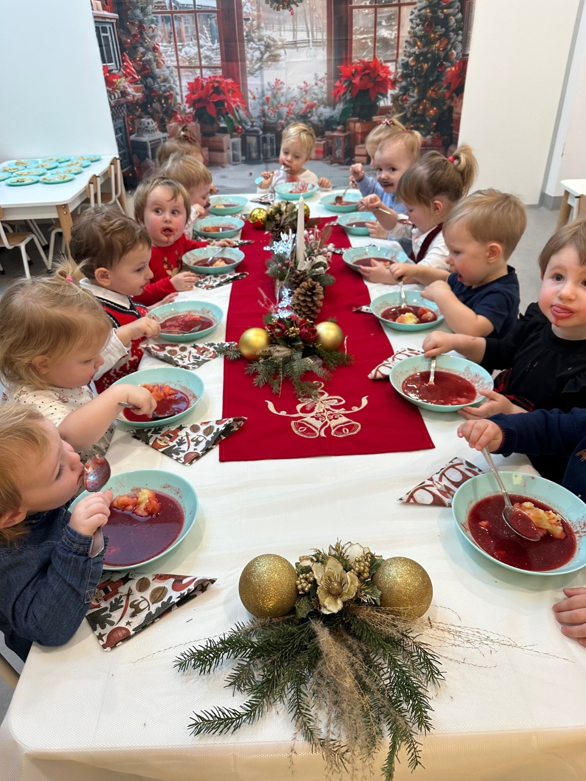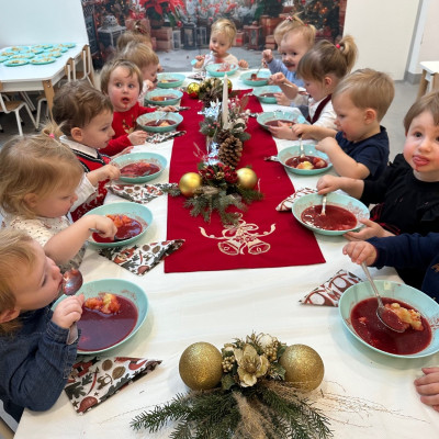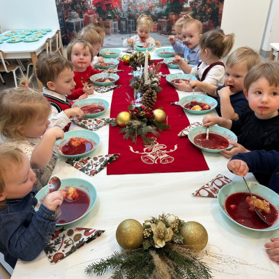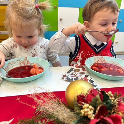 19 grudnia w grupie Tygryski odbyła się wigilia. Tego dnia dzieci przyszły pięknie wystrojone. Cały ranek panowała świąteczna atmosfera oczekiwania, a w tle słychać było kolędy. Dzieci pomogły ciociom nakryć i przystroić wigilijny stół. A gdy nadszedł czas Tygryski zasiadły do stołu, gdzie pojawił się tradycyjny barszczyk czerwony i pierogi, które dzieci zjadły ze smakiem.