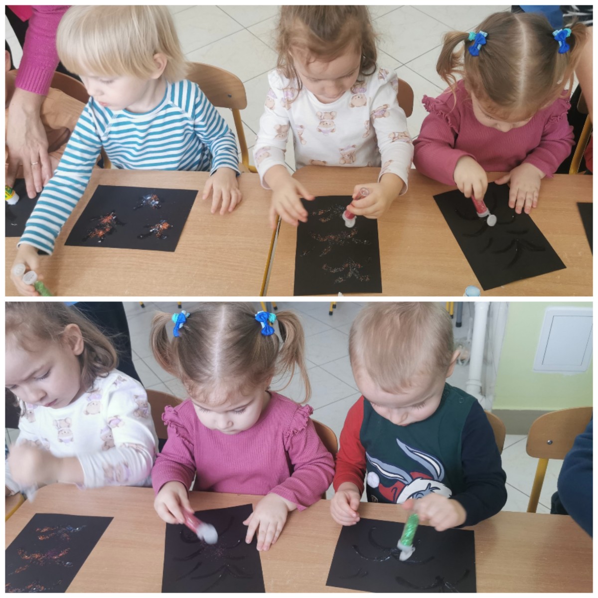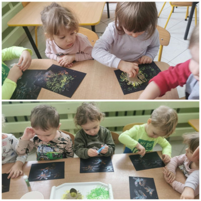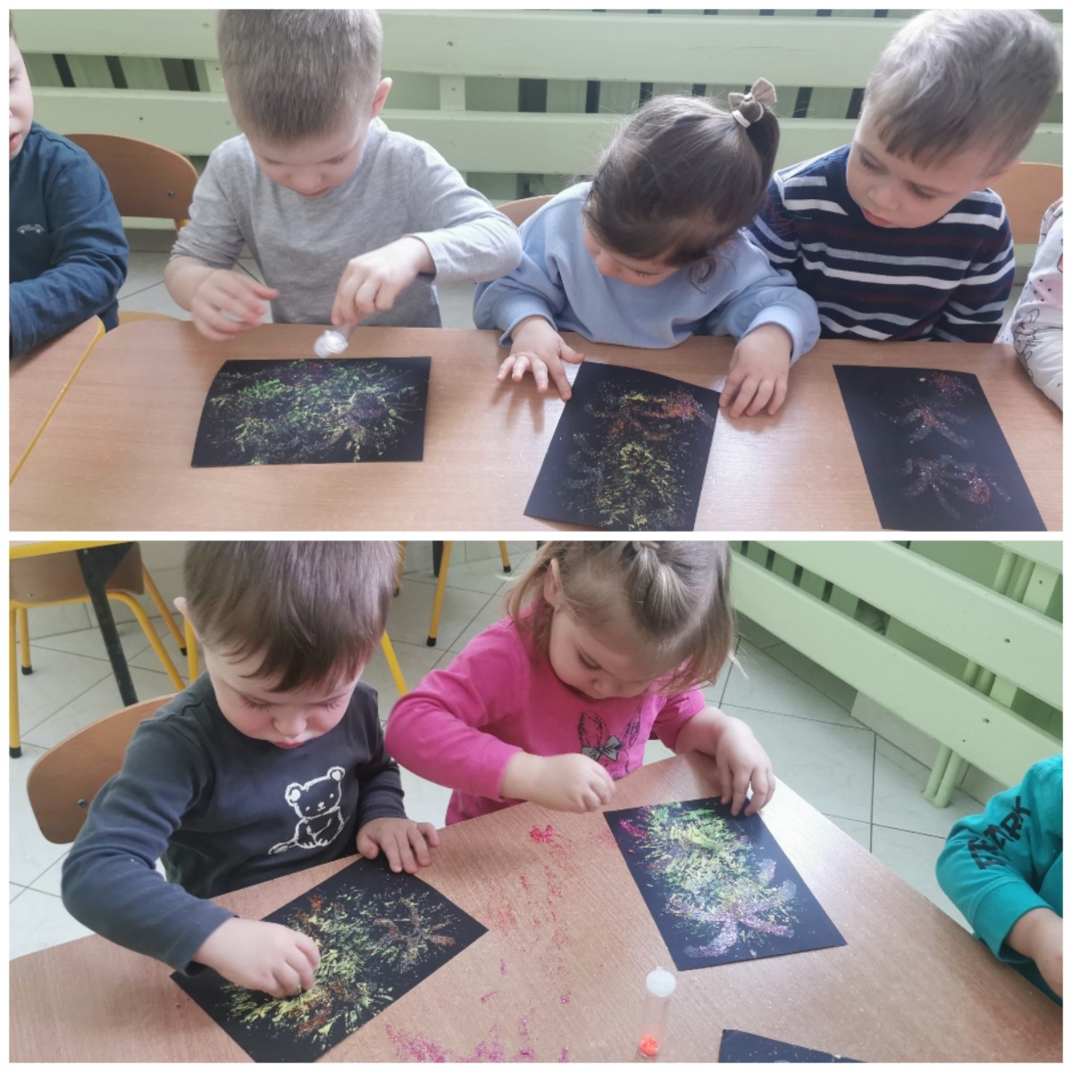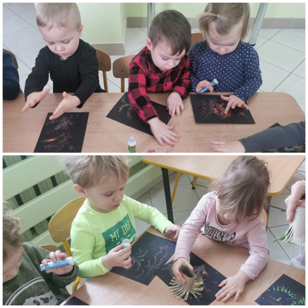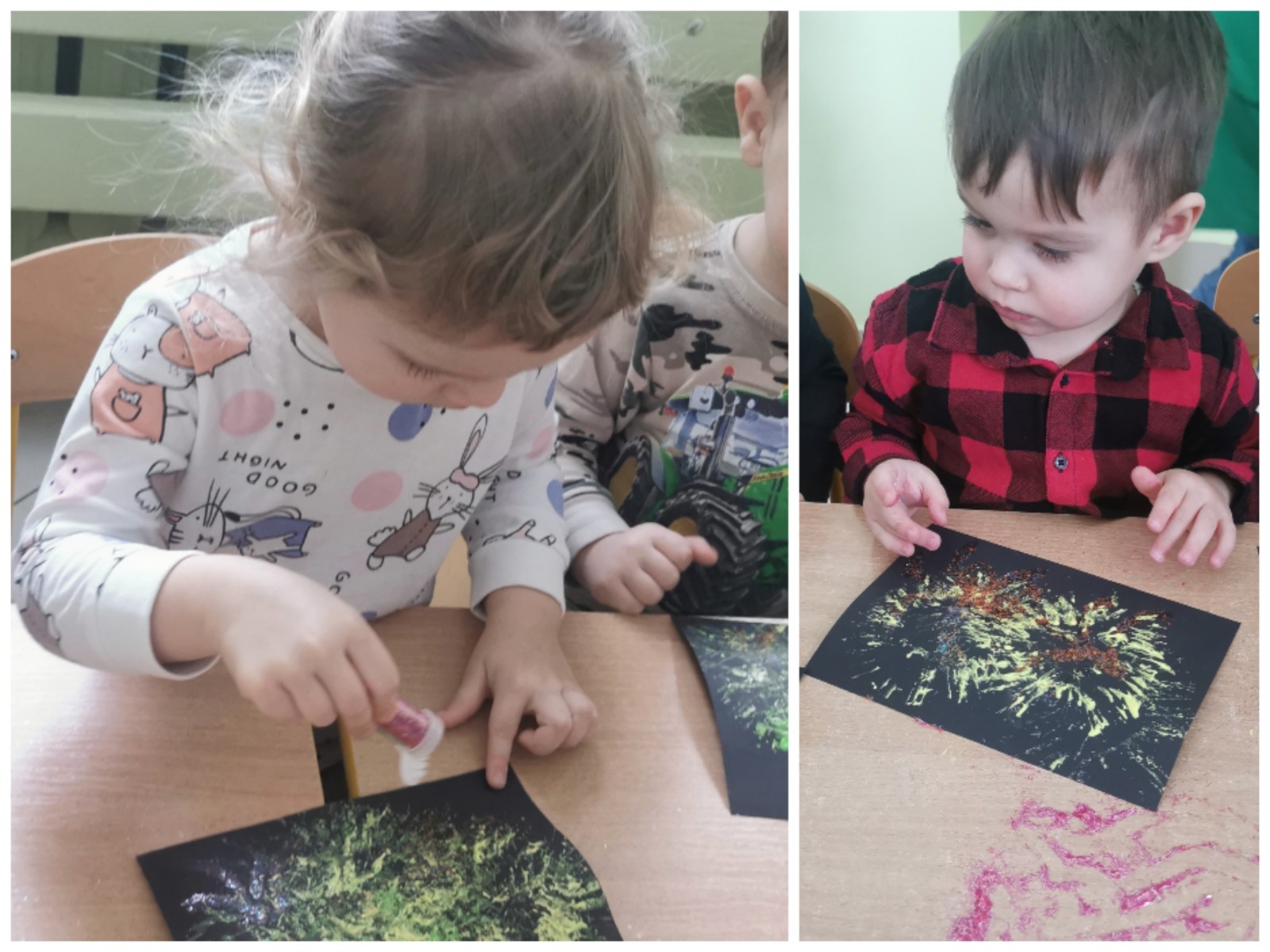 Dzisiaj Żabki trenowały swoje zdolności manualne i twórcze i wykonały zimowe prace plastyczne, których tematem było huczne powitanie Nowego Roku. Stworzyliśmy je z wykorzystaniem brokatu, kleju i kolorowych farb , które dzieci odbijały za pomocą rolek papieru na kartkach, co dało niesamowity efekt. Gotowe prace można podziwiać w galerii zdjęć oraz na korytarzu naszego żłobka. Życzymy wszystkim samych pomyślności w Nowym Roku!