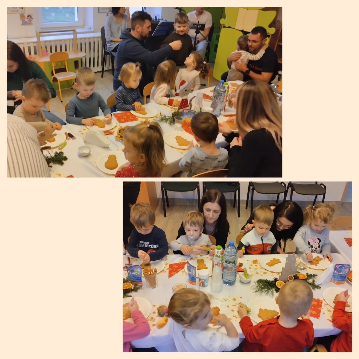 Zdjęcia przedstawiają dzieci podczas kolędowania i dekorowania pierniczków.