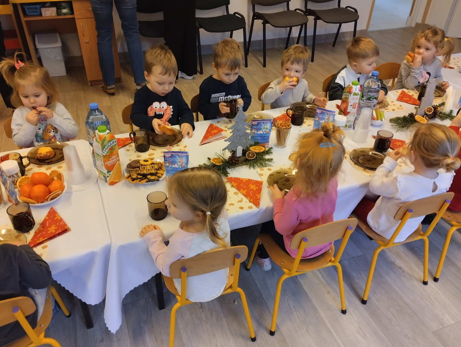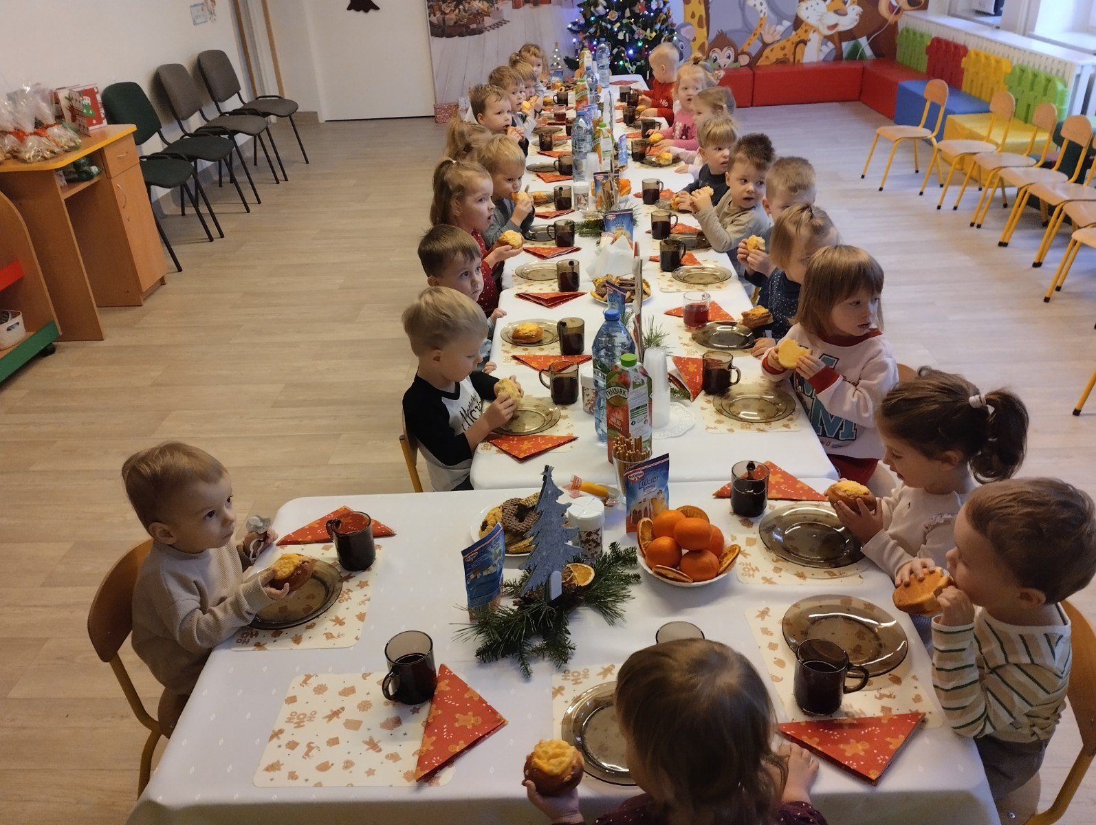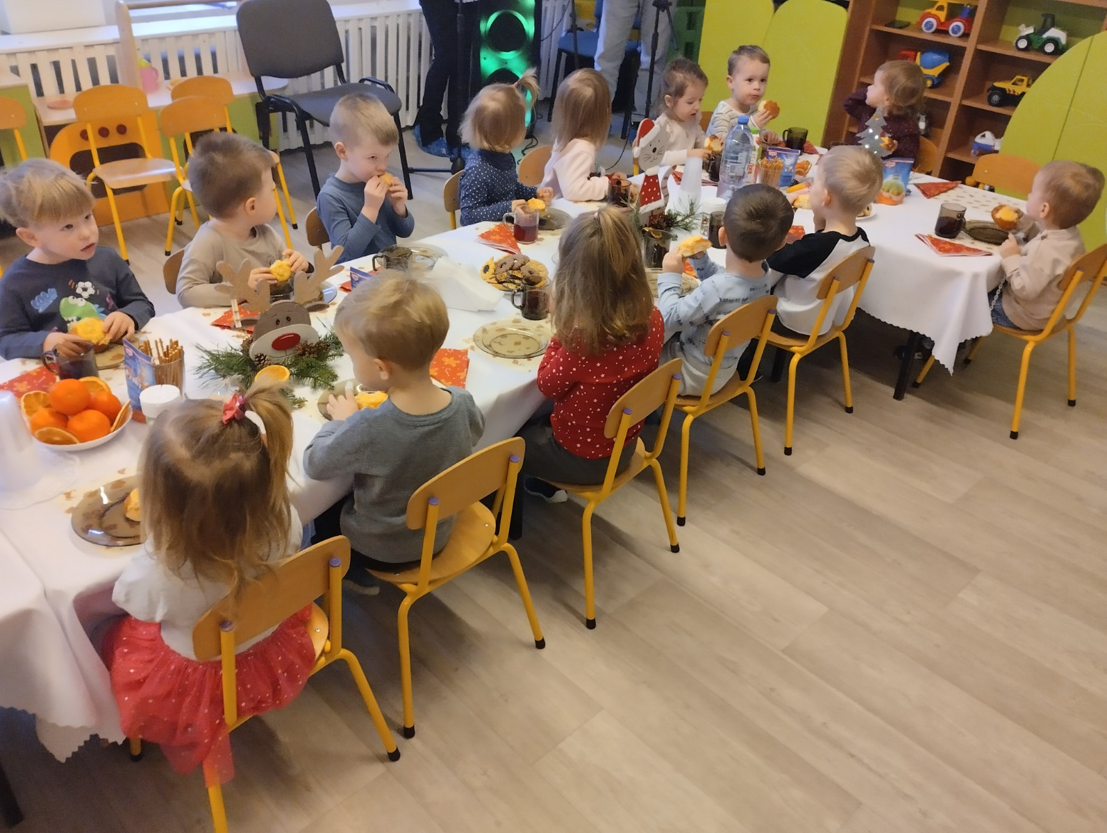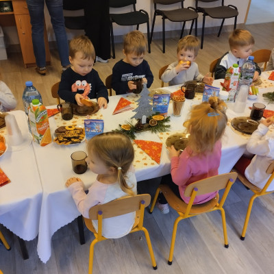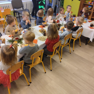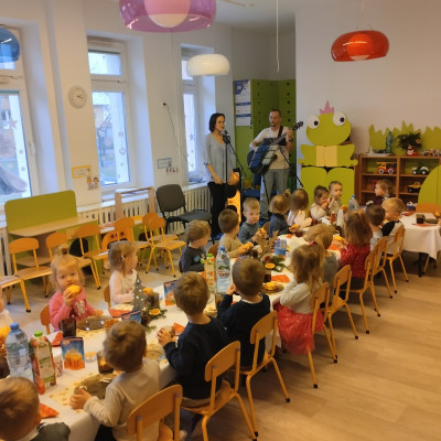 Następnie w żłobku odbyło się wspólne kolędowanie. Dzieci z radością śpiewały znane kolędy. We wspólnym kolędowaniu na gitarze akompaniował zaproszony Pan Łukasz z Panią Kornelią.