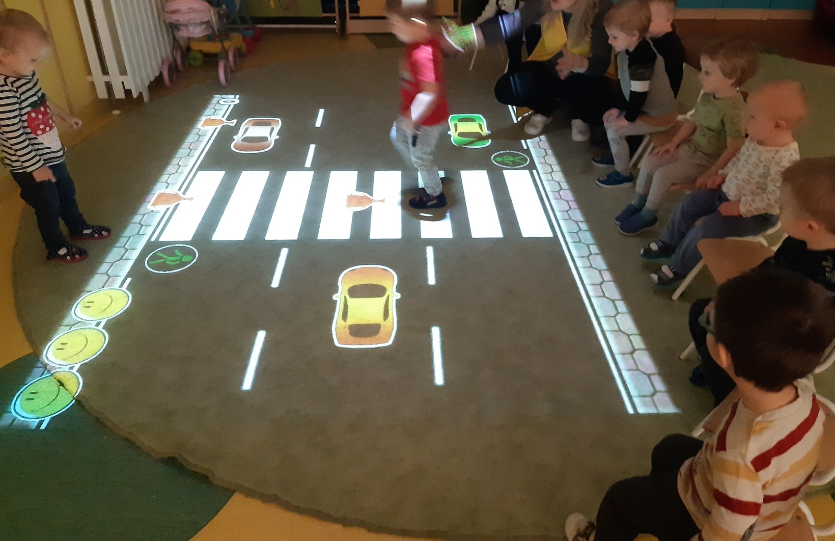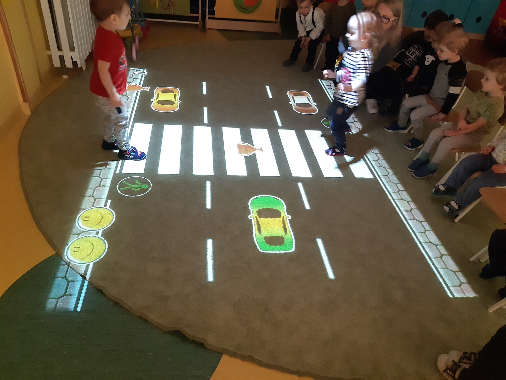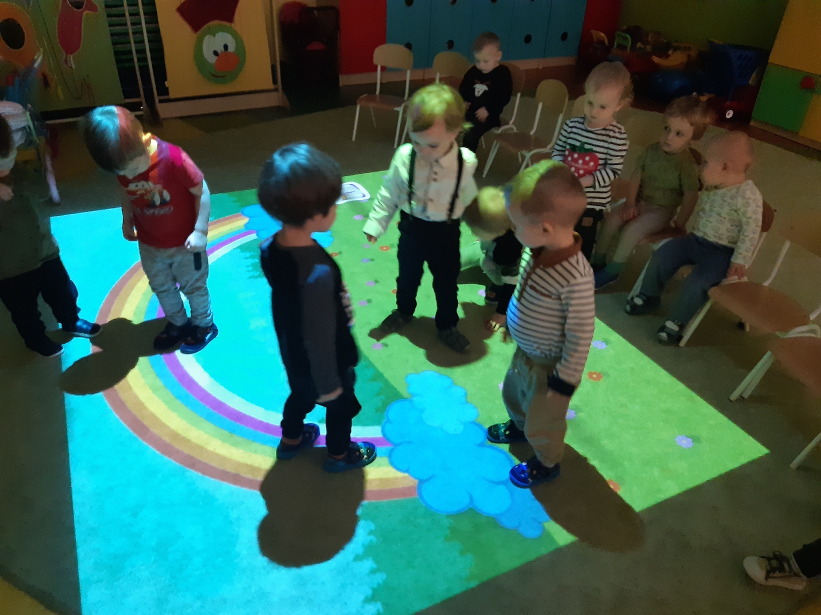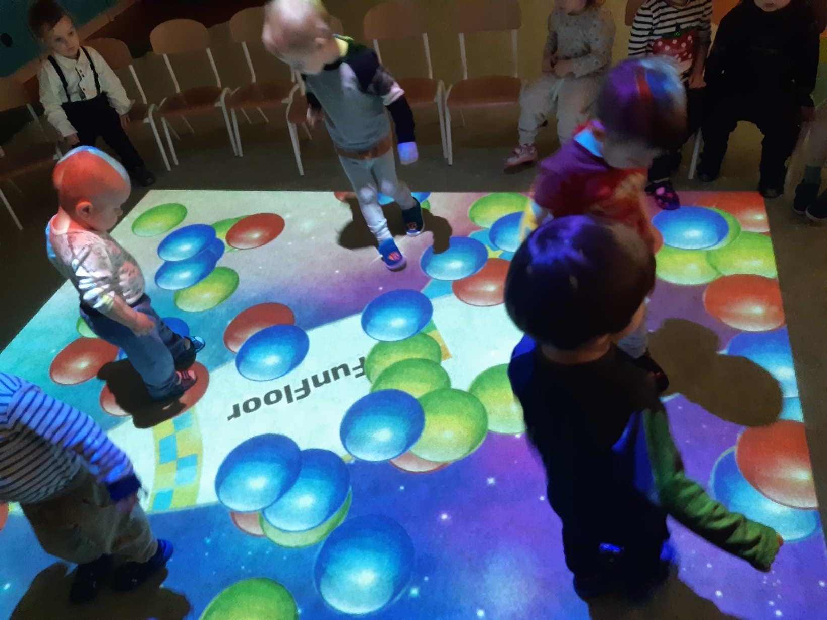 W czwartek 12 stycznia dzieci z grupy Żabki brały udział w zajęciach z wykorzystaniem podłogi interaktywnej. W tym celu udały się z paniami opiekunkami na grupę Rybek, na której zamontowane jest to urządzenie. Na dywanie interaktywnym skakały po kamieniach, rozbijały kolorowe balony , łapały rybki w wirtualnej rzece , uczyły się przechodzić na drugą stronę ulicy. Poprzez te zajęcia dzieci w doskonały sposób usprawniały koordynację wzokowo-ruchową, spostrzegawczość, motorykę małą i dużą, uczyły się cierpliwości.
