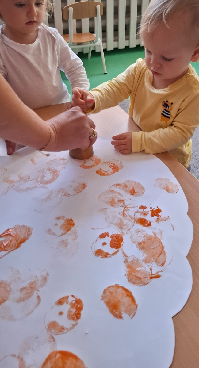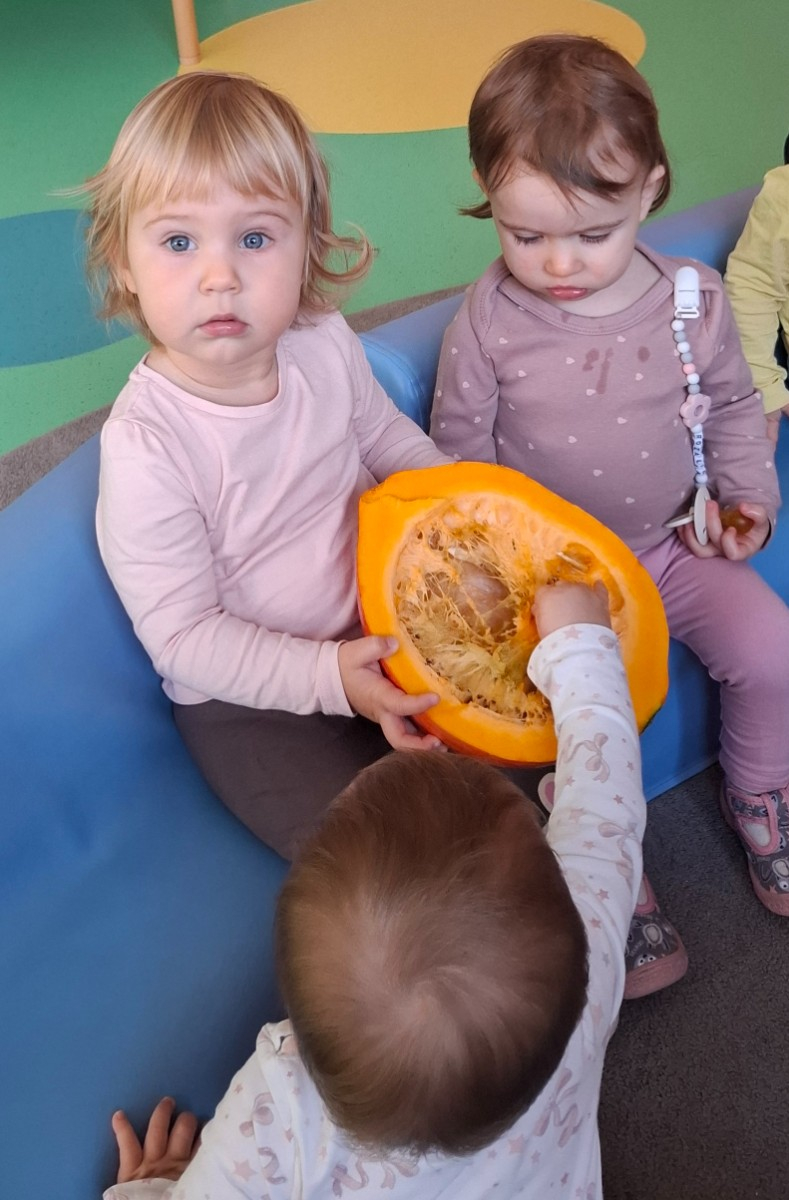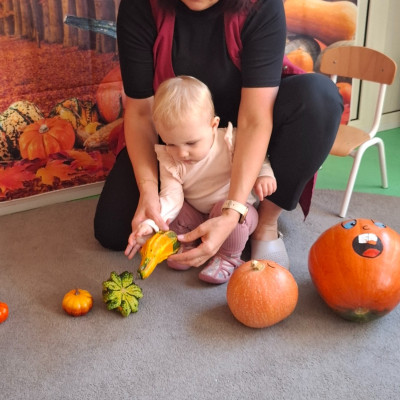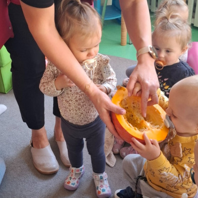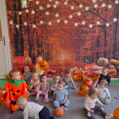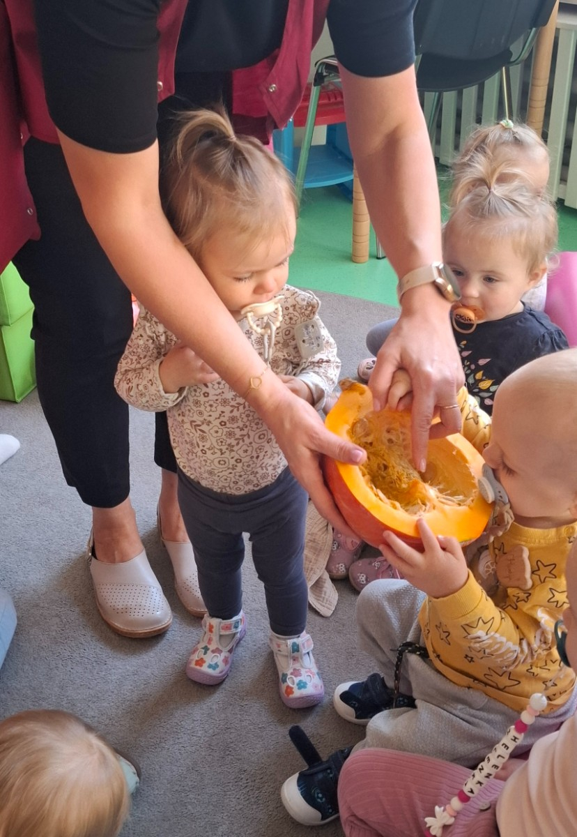 Gdy nadchodzi koniec jesiennych zbiorów czas ogłosić „Dzień Dyni”. Na grupie misie święto to obchodziliśmy 29 października.  Tego dnia podczas zajęć dzieci poznały wielką różnorodność dyń , dowiedziały się, że dynia jest bardzo zdrowym warzywem, że można z niej przygotować wiele dań.W ramach zajęć sensorycznych dzieci mogły dotknąć, powąchać a także wspólnie badać wnętrze dyni, jej miąższ oraz pestki. Nasze maluszki wykonały także wspólną pracę plastyczną polegającą na odbijaniu pieczątek z ziemniaka na szablonie dyni, uczyły się układać dynie od największej do najmniejszej  a na zakończenie zajęć podrzucały do góry pomarańczowe balony oraz bawiły się przy piosenkach o tematyce związanej z dyniami oraz jesienią.