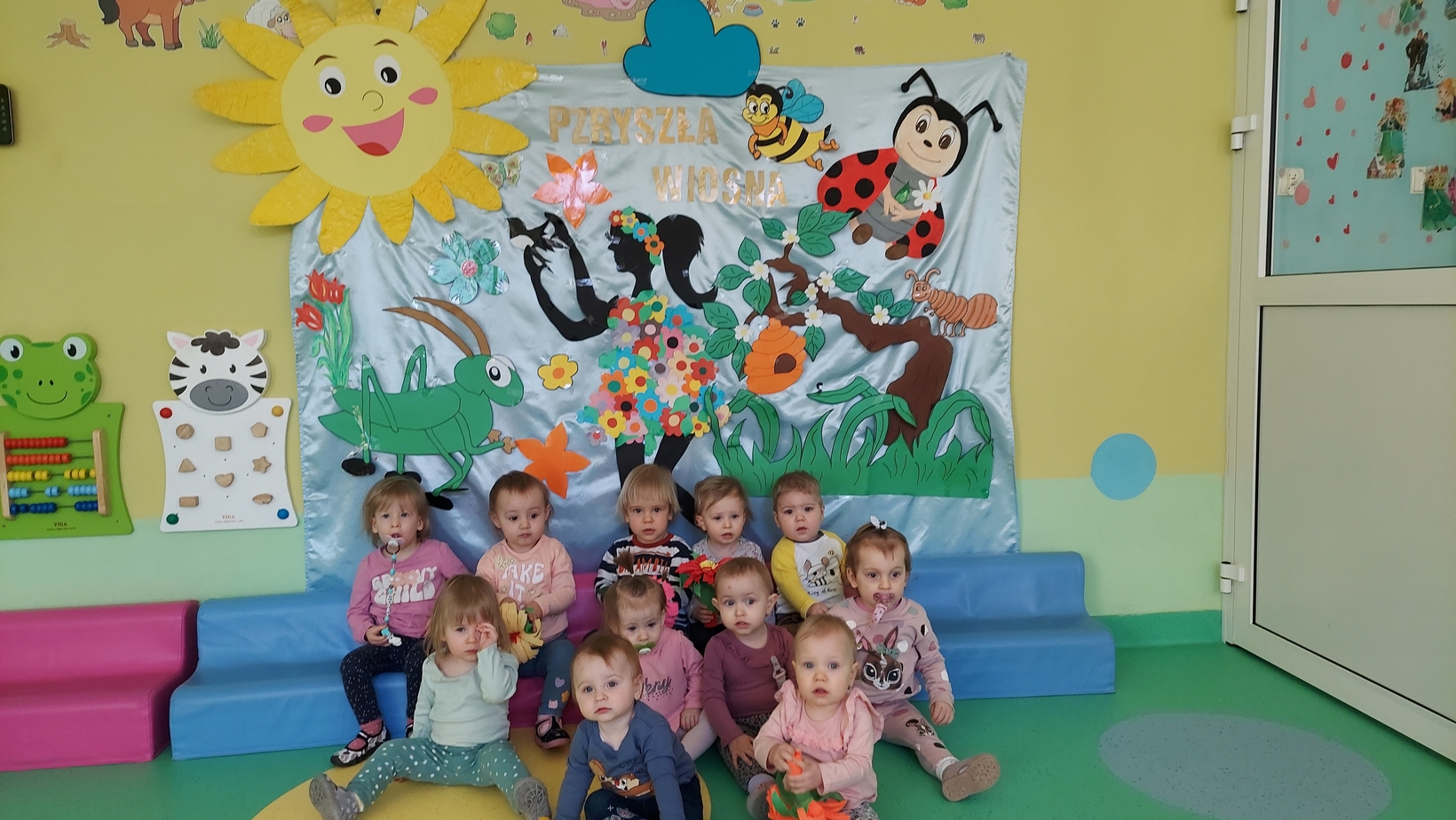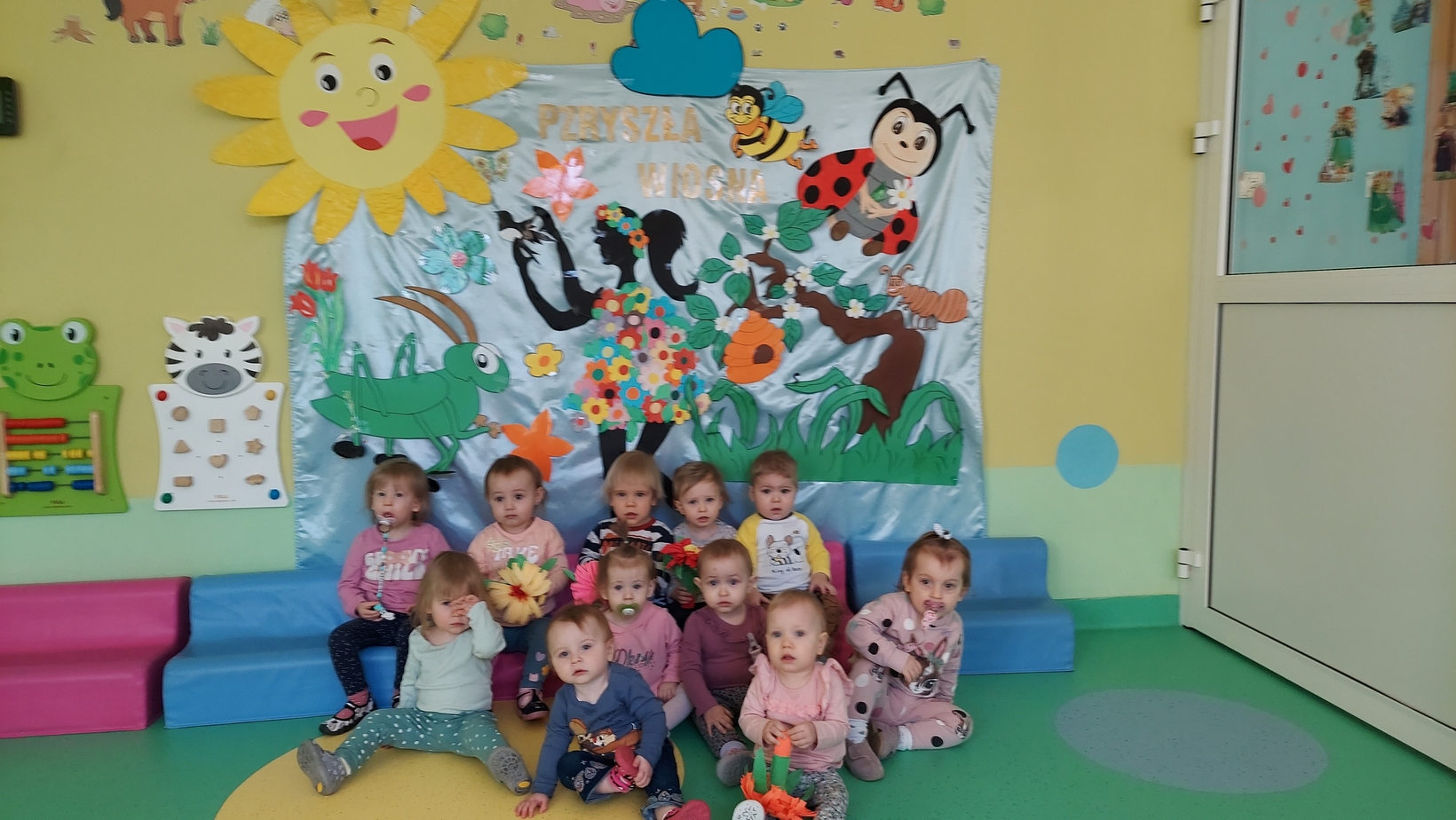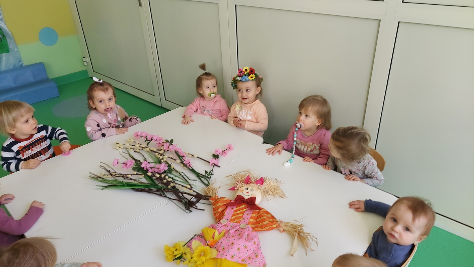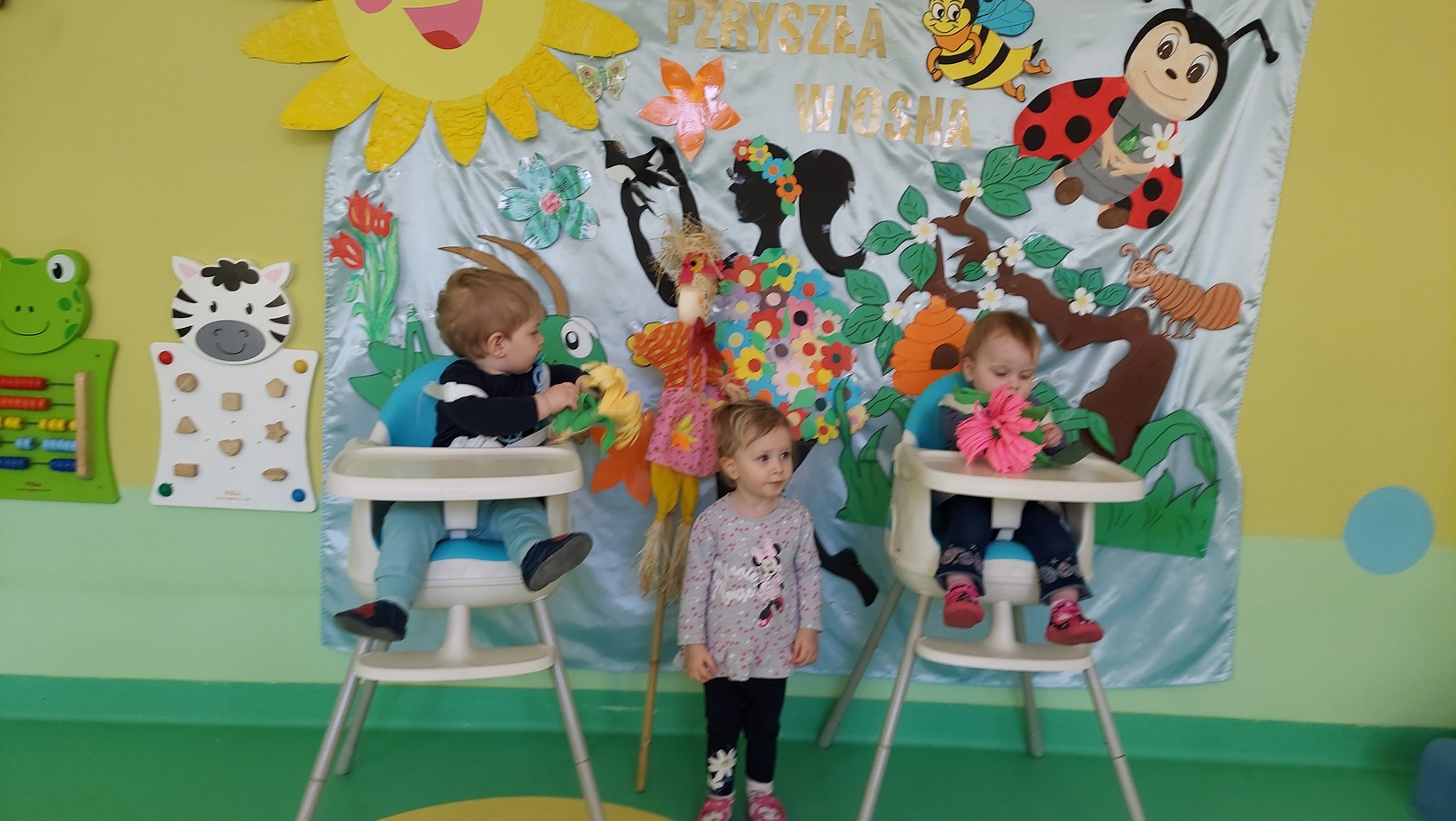 20 marca dzieci z grupy Misie powitały długo oczekiwaną wiosnę. W nastrój wiosenny wprowadziła nas piosennka ,,Tam daleko, gdzie wysoka sosna".Dzieci poznały Panią Wiosnę oraz jej pierwsze zwiastuny: kwiaty, bazie, jaskółki, pszczółki, drzewa z pierwszymi listkami, promienne słońce, na tyle których zrobiły sobie pamiątkowe zdjęcie. Później w ramach zabawy z poznanych kwiatów, bazi i innych zwiastunów przy pomocy pań zrobiliśmy wiosenne wianki i marzanne - symbol odchodzącej zimy. Nasze Misie z kwiatami w ręce i marzanną dumnie maszerowały by ostatecznie pożegnać zimę, a powitać nową porę roku - wiosne. Mamy nadzieję że już zostanie z nami i będziemy mogli spacerować po żłobkowym ogrodzie, by podziwiać jak pięknie zmienia się przyroda.