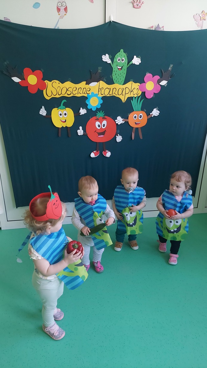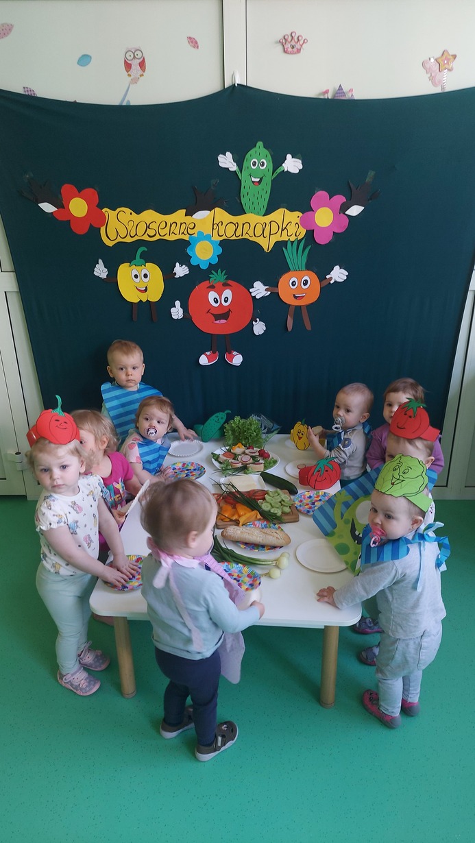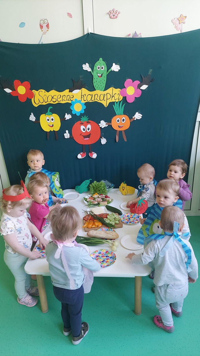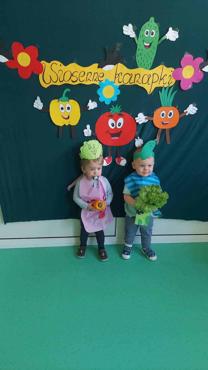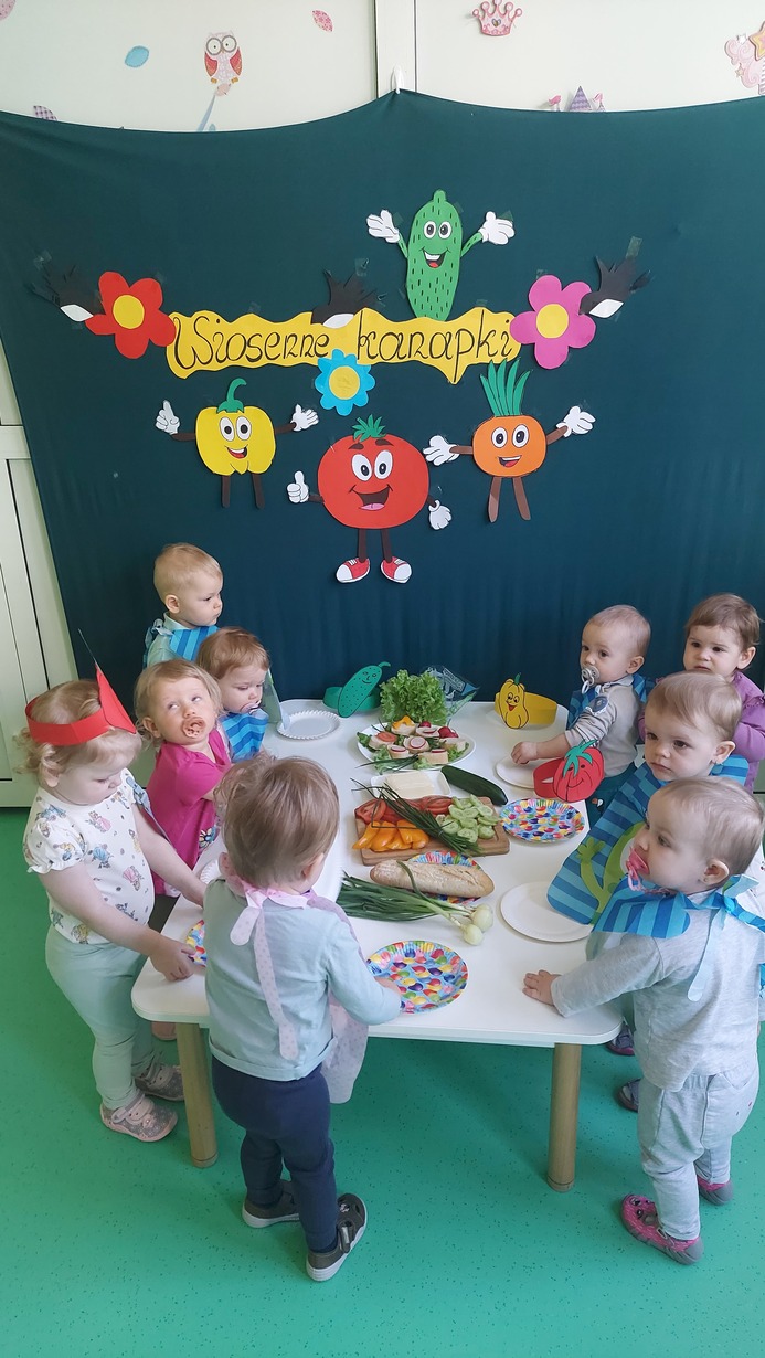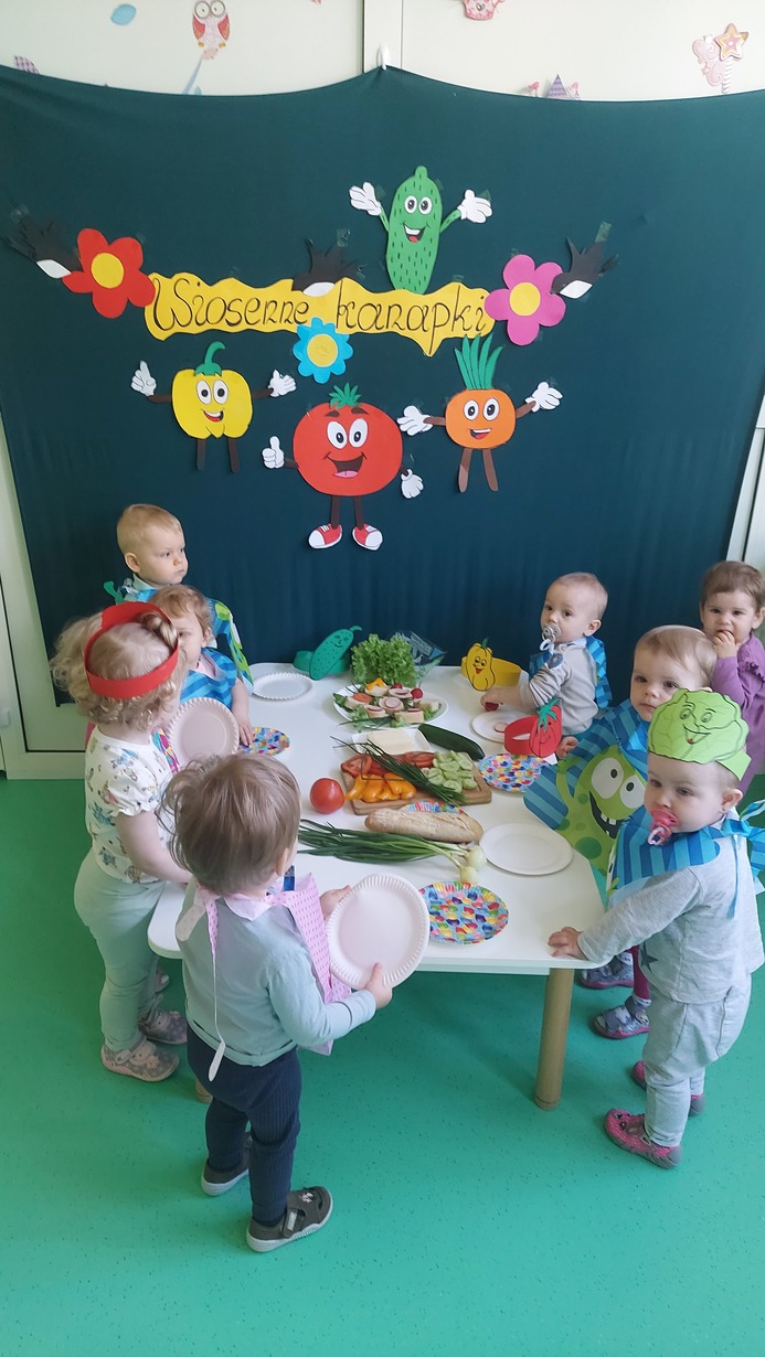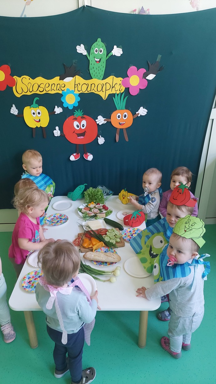 W dniu dzisiejszym dzieci z grupy Misie brały udział w zajęciach, w których wraz z ciociami przygotowały wiosenne kanapki. Na stole zagościły pierwsze wiosenne warzywa: ogórek, pomidor, pyszny i pachnący szczypior, papryka, sałata, a także rzodkiewka. Nasze Misie ubrane w piękne fartuszki z opaskami na głowie przedstawiające warzywa zabrały się do pracy. Każde dziecko samodzielnie, lub z niewielką pomocą konponowało swoją kanapkę. Powstały bardz zdrowe, pachnące, kolorowe i pełne witamin przekąski, które później bardzo szybko znikneły z talerza.