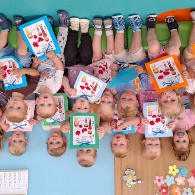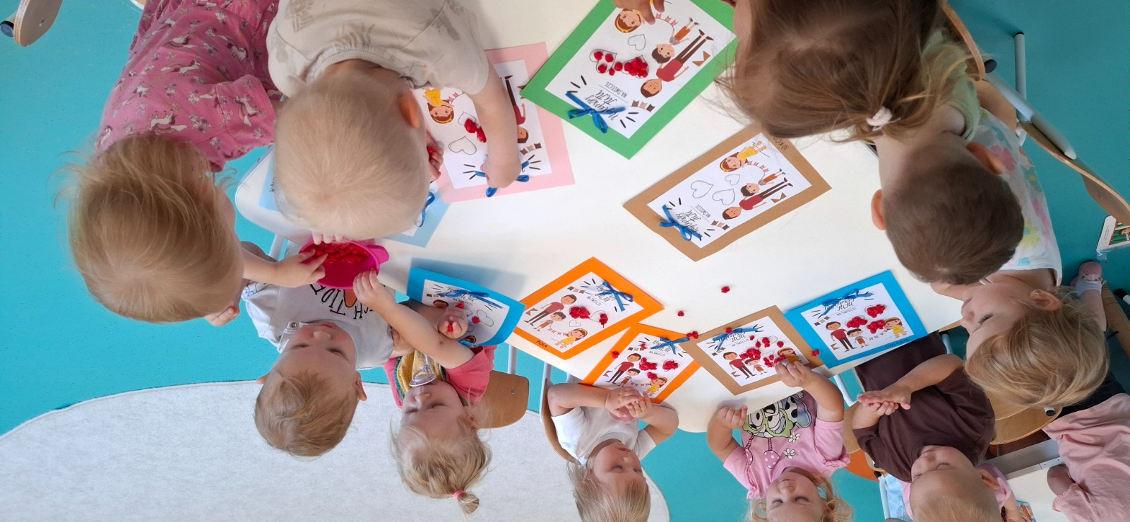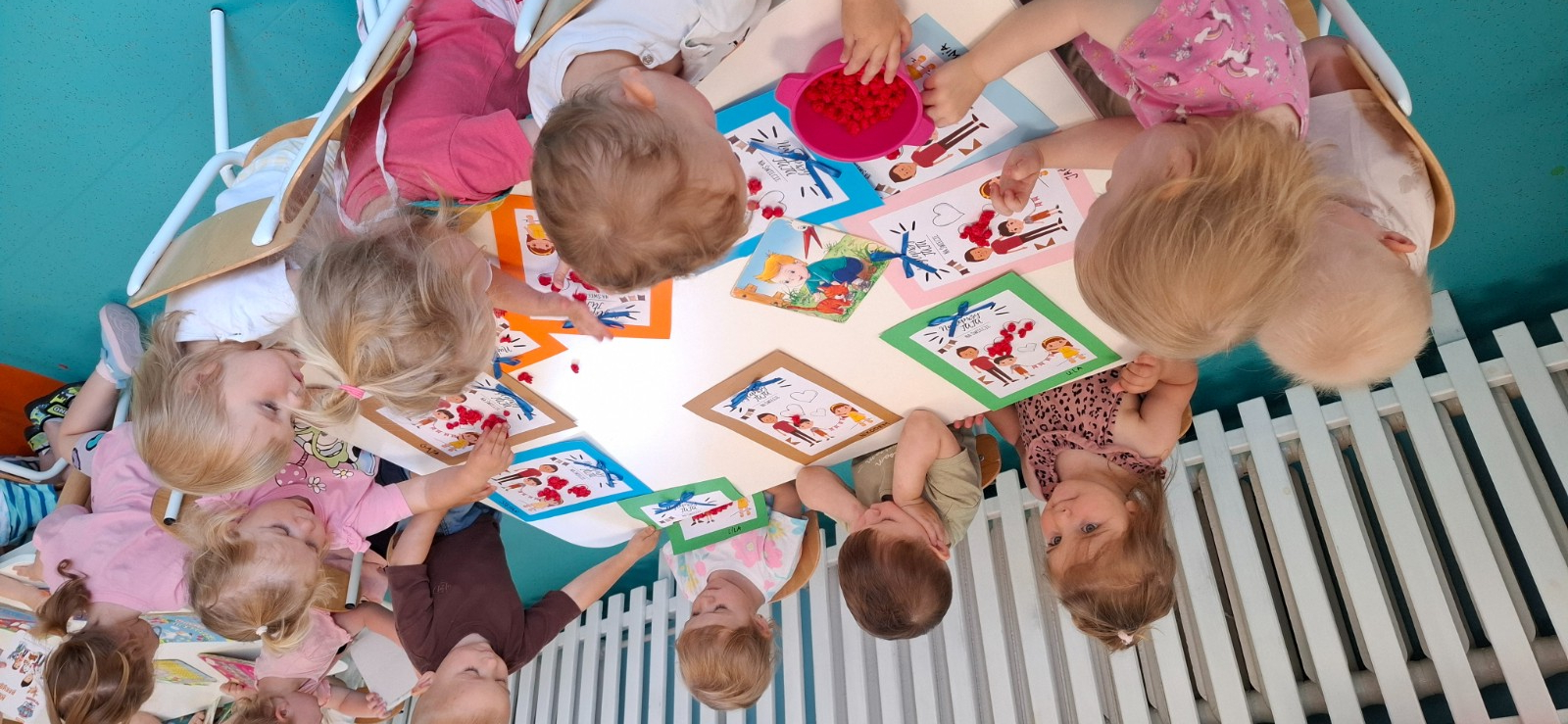 Zdjęcie przedstawia dzieci przygotowujące laurki dla taty.