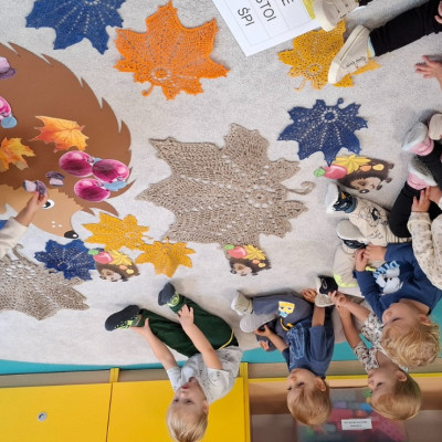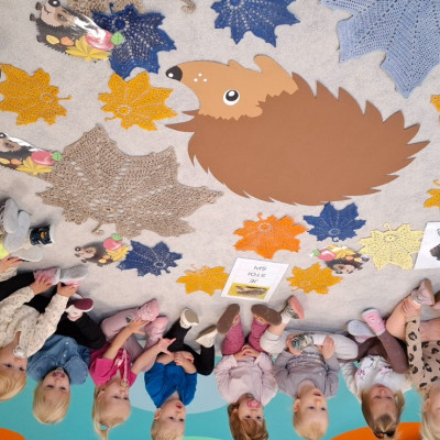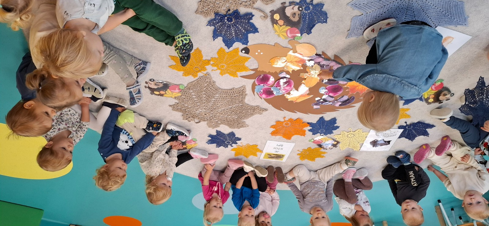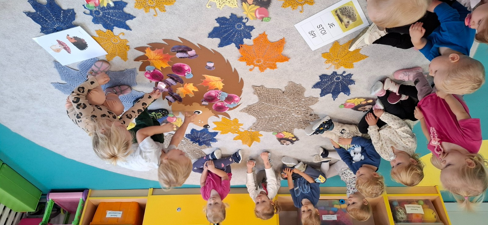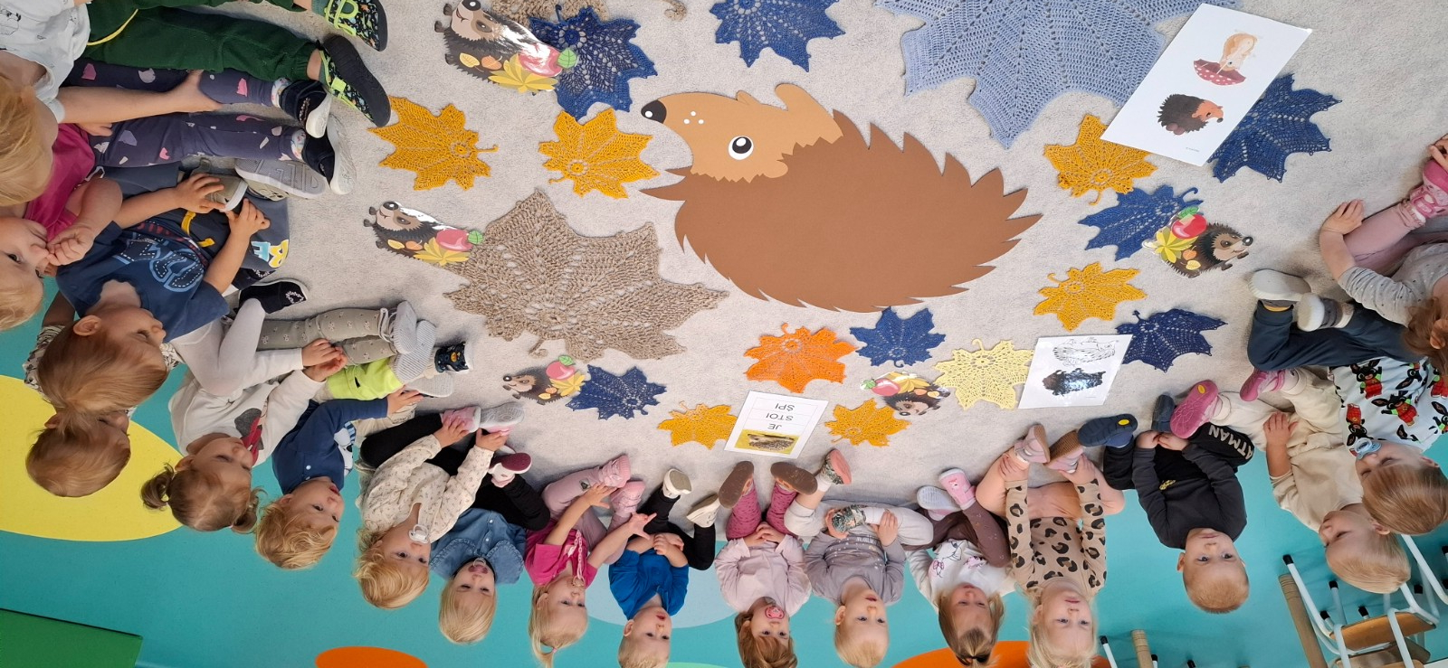 Dzieci poznawały jeża, jego wygląd, gdzie mieszka i czym się żywi. Wspólnie śpiewaliśmy piosenki o jeżu a zabawa ruchowo - naśladowcza pt.,,Na dywanie siedzi jeż" wniosła wiele radości wśród dzieci.