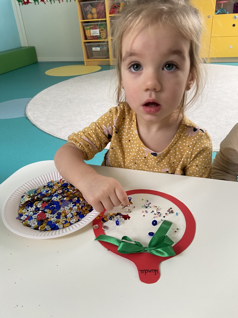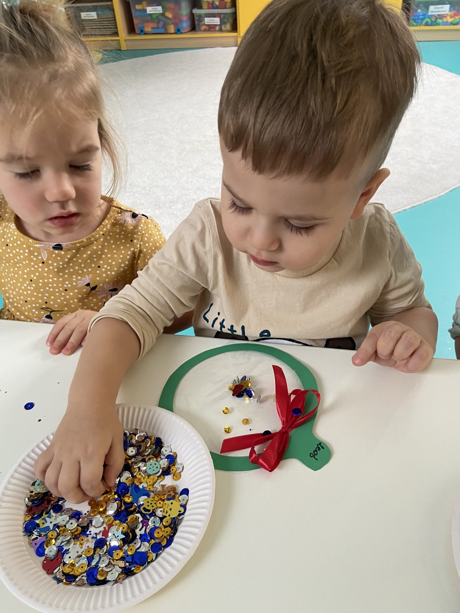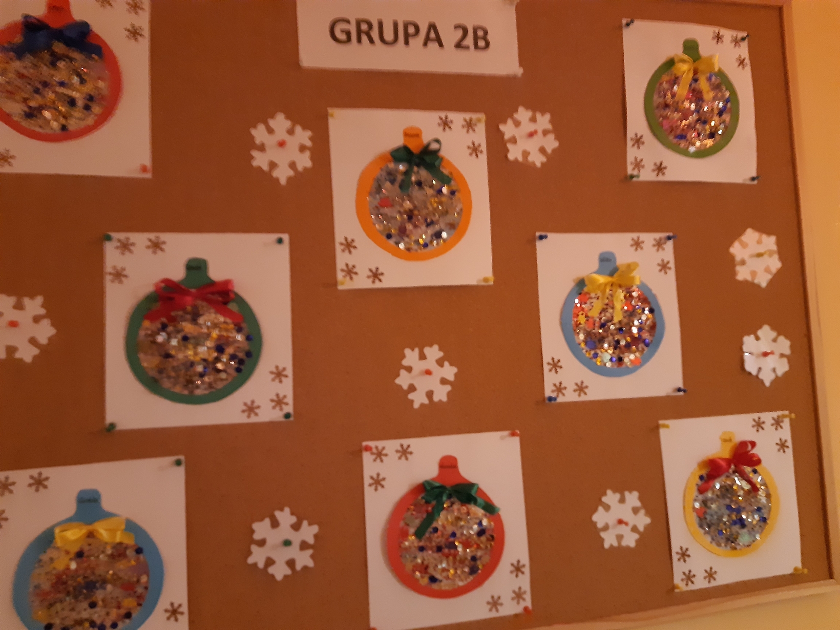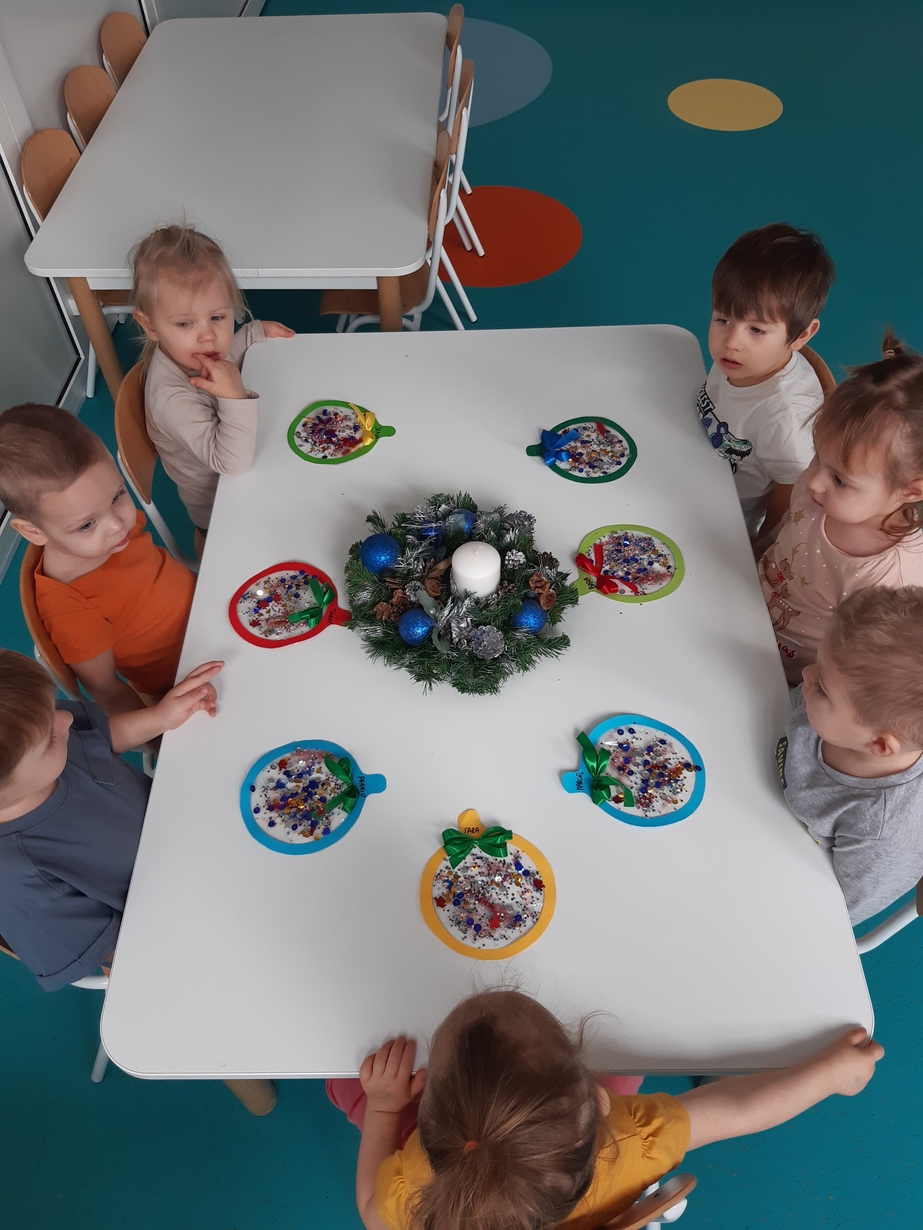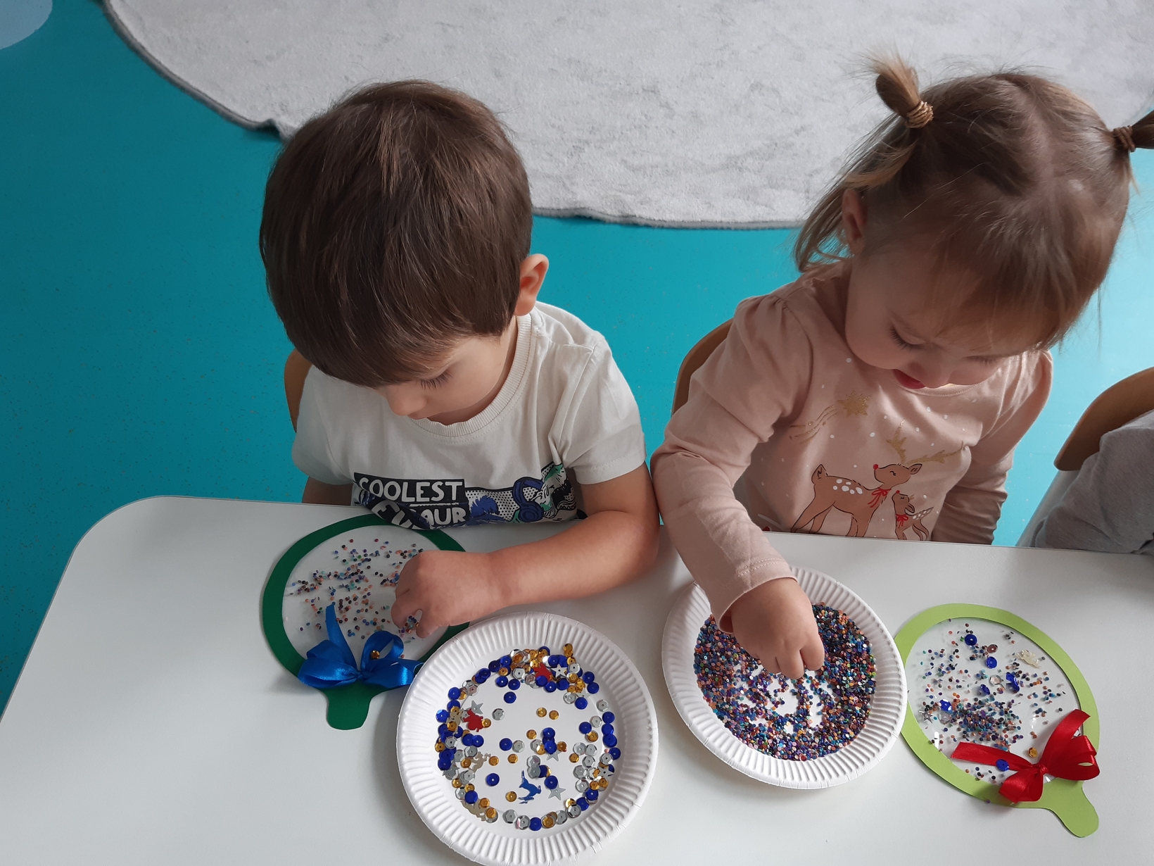 Do wykonania tej pracy dzieci wykorzystały cekiny, brokat oraz kolorowe wstążki. W trakcie zajęć dzieci poznawały też tradycje bożonarodzeniowe,