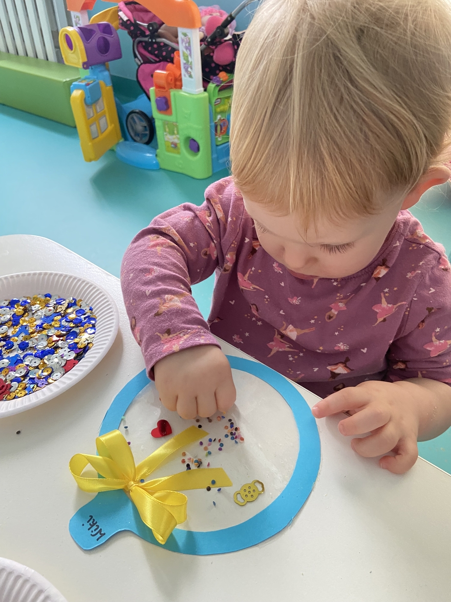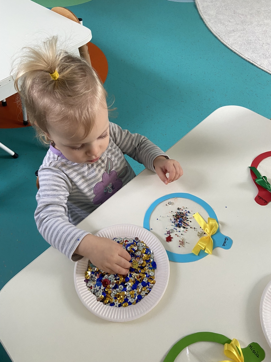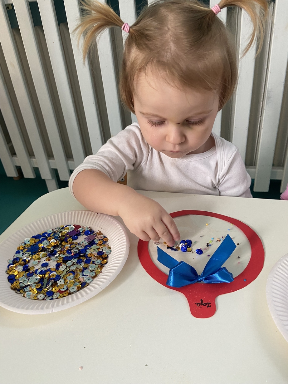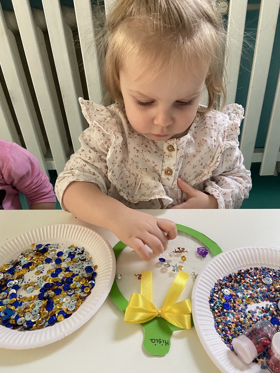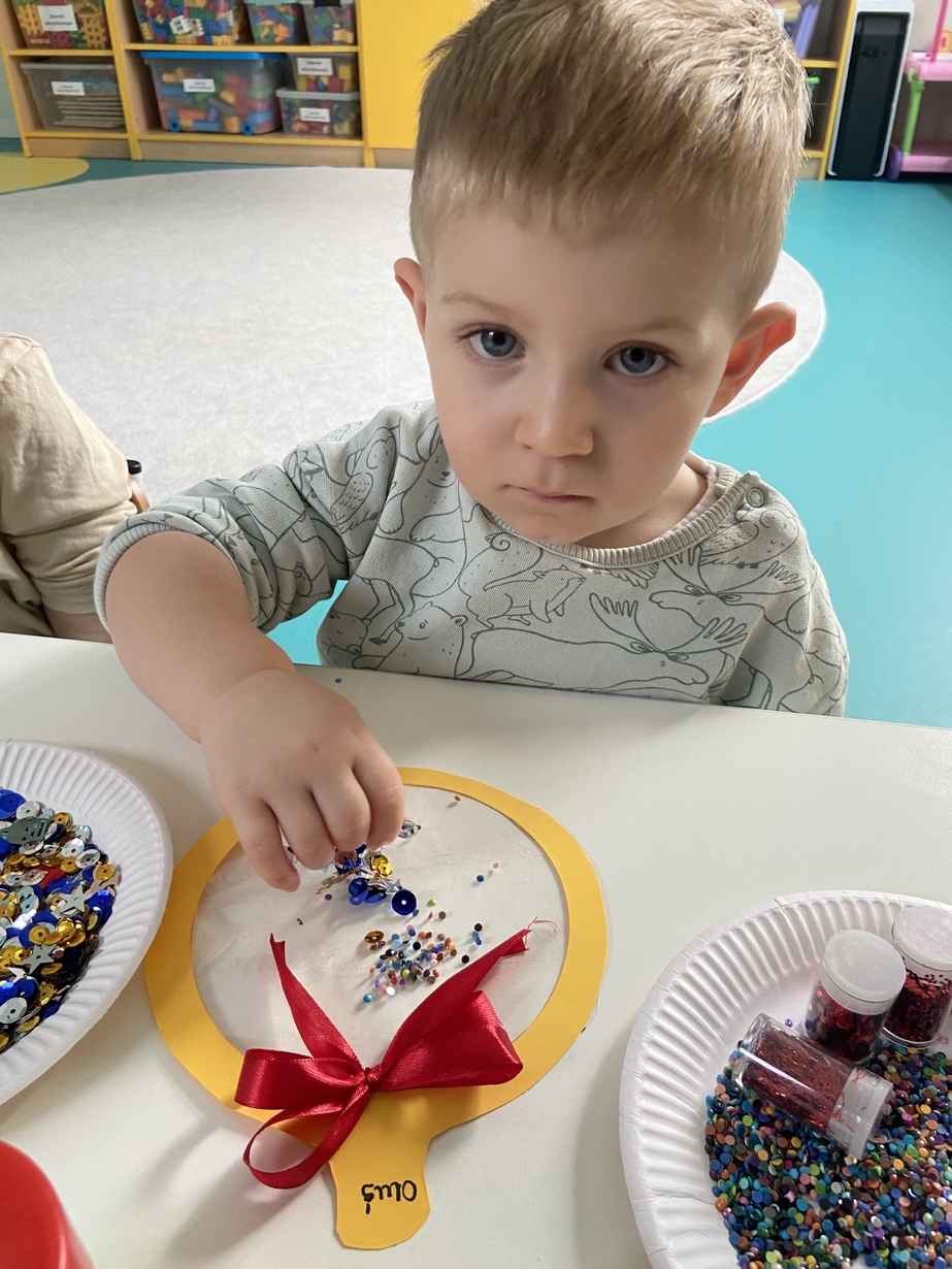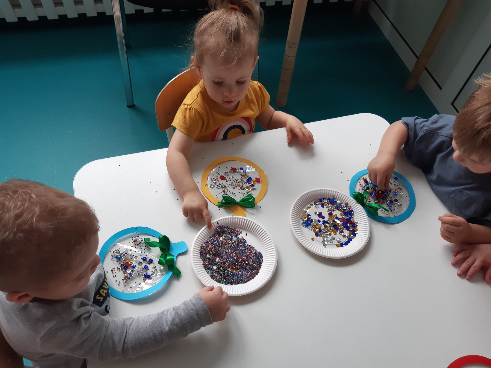 Do wykonania tej pracy dzieci wykorzystały cekiny, brokat oraz kolorowe wstążki. W trakcie zajęć dzieci poznawały też tradycje bożonarodzeniowe,