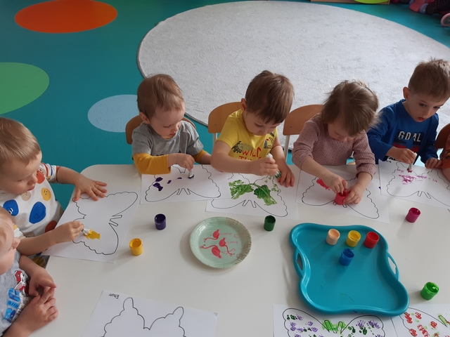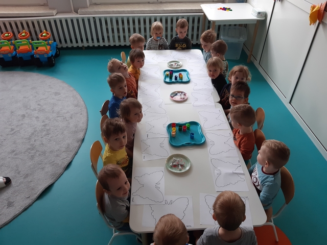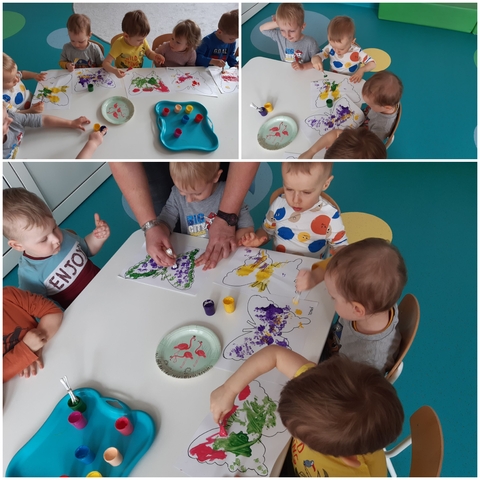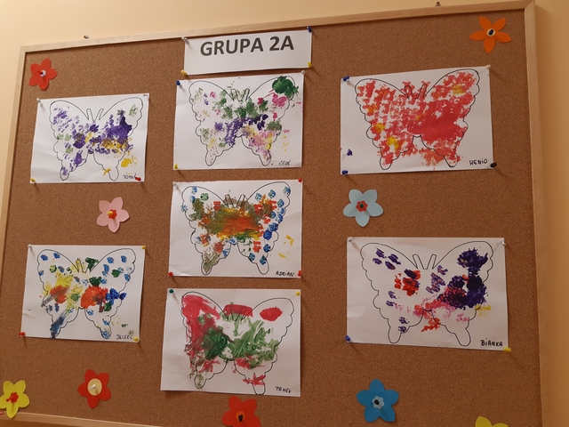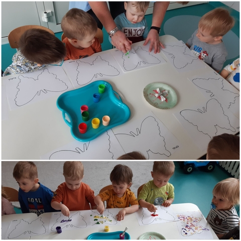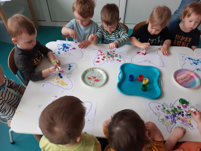 Dziś grupa Żabki wykonała pracę plastyczną przedstawiającą wiosenne motyle. Do wykonania tych prac dzieci wykorzystały patyczki kosmetyczne oraz kolorowe farby.